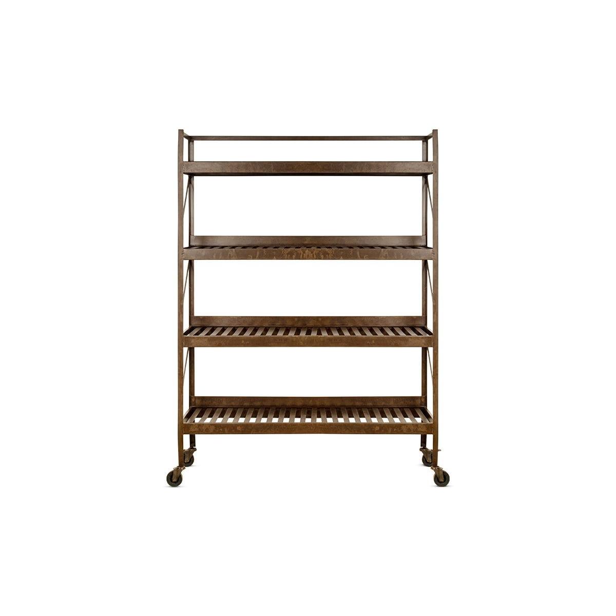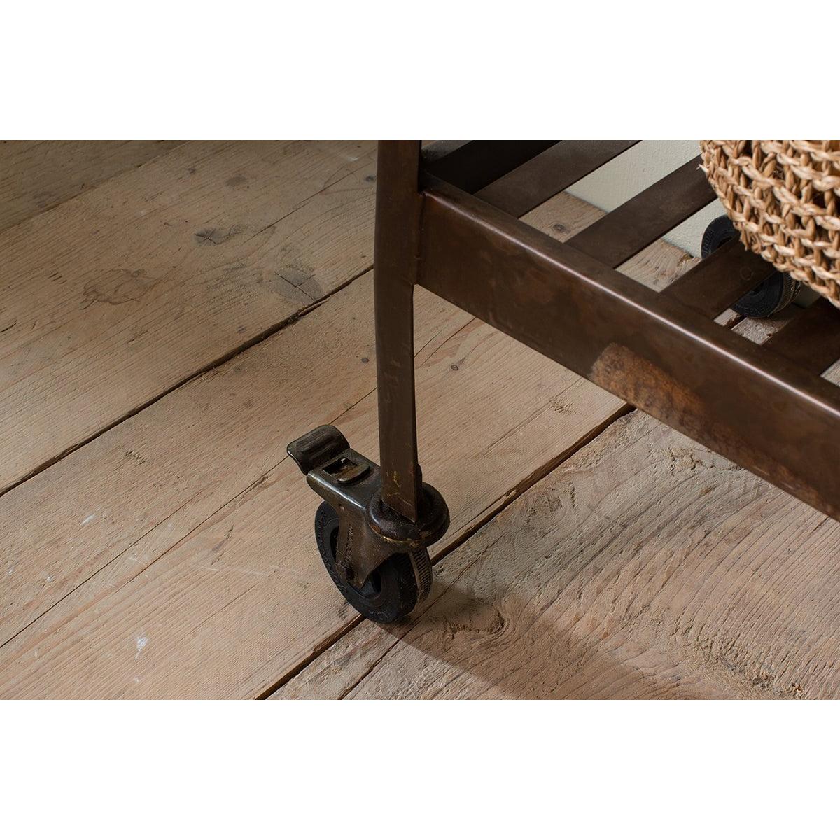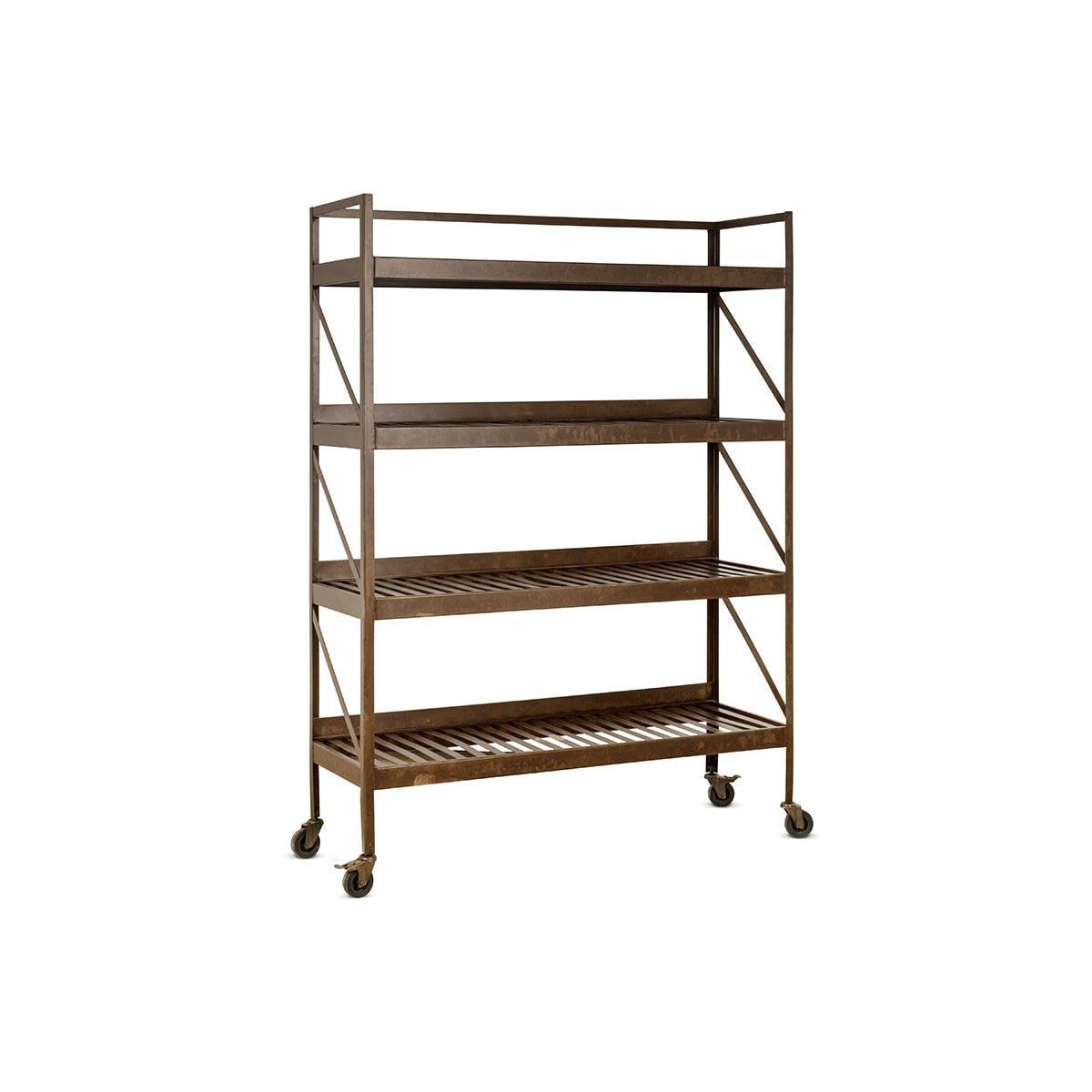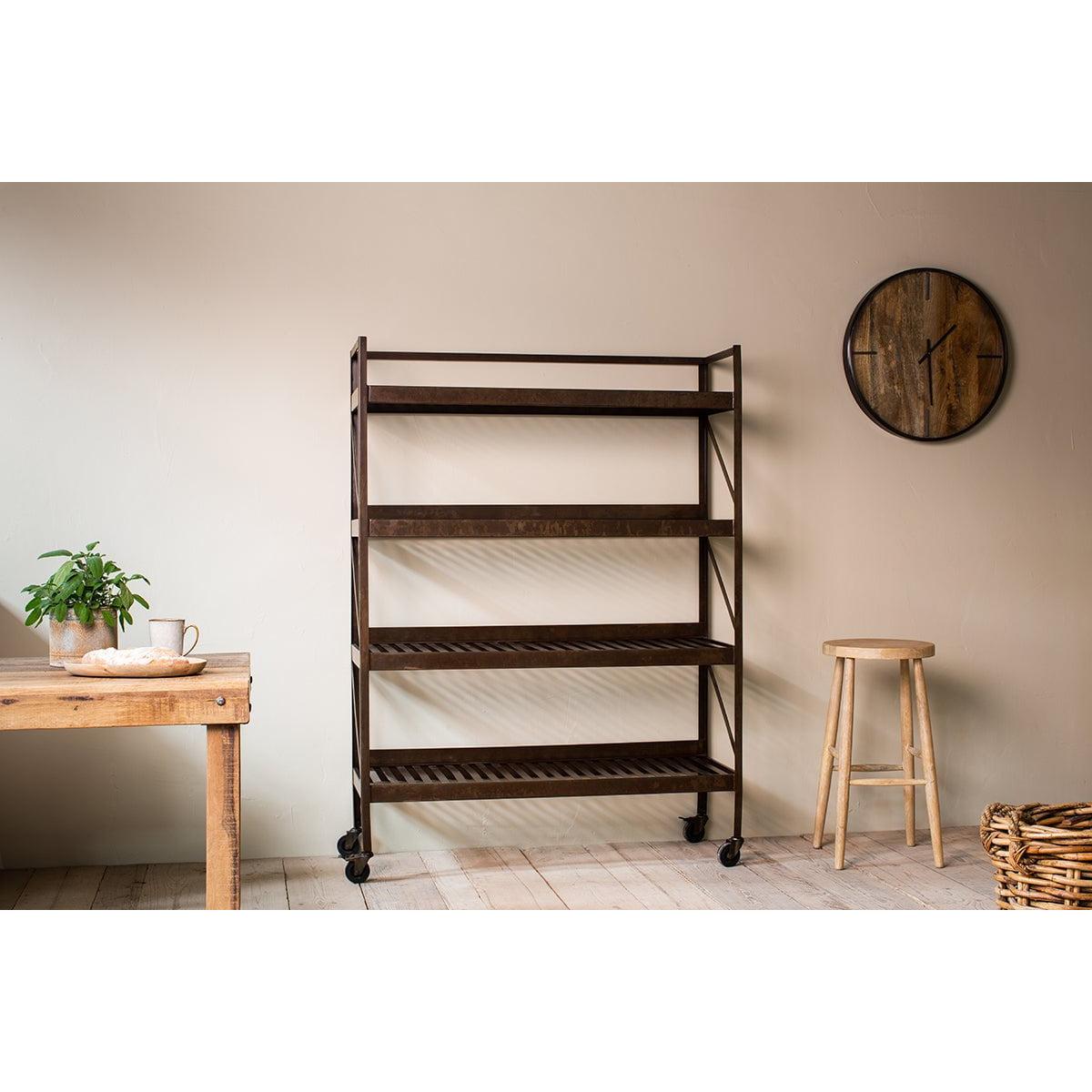 With its eye-catching industrial aesthetic, our Umi shelf unit is a stylish way to store your kitchen utensils. Its utilitarian appearance is enhanced by the striking rust finish and locking casters, which also means the it’s easy to move. Four generously sized slatted shelves provide ample storage space. This shelf unit adds a contemporary and practical note to a kitchen or pantry but its rich tones can also provide a beautiful backdrop to your houseplant collection, making this a truly versatile item. | nkuku Umi Iron Shelf | Storage Furniture | Rust | Extra Large