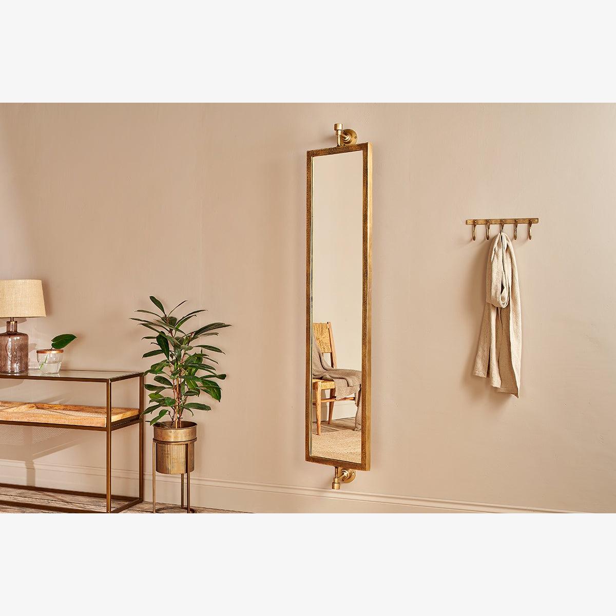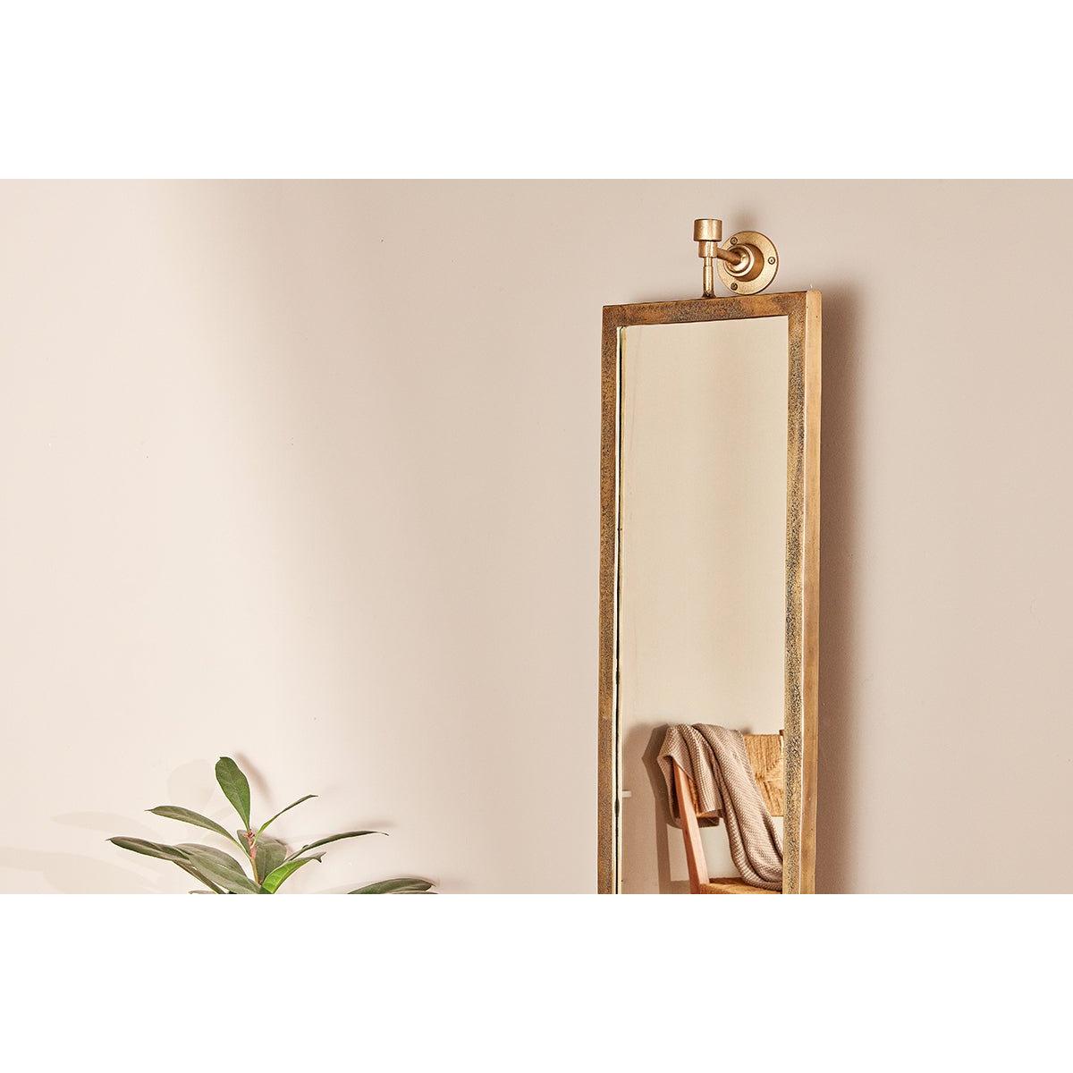 Our Visala full length swivel wall mirror is a statement mirror that promises to bring a strong sense of style to a bedroom or hallway. The well- considered pivot design allows you to rotate the mirror to various angles. The luxurious yet in some ways industrial wall fittings sturdily support the cast aluminium mirror frame. The texture of the cast aluminium and the golden hues of the brass finish add to the quality this Visala mirror exudes. The Visala mirror is made using a traditional sand casting process. The process involves a handmade process. Sand is used to shape and mould the liquid aluminium. Sand casting is an essentially circular production process where nearly all materials can be recycled.