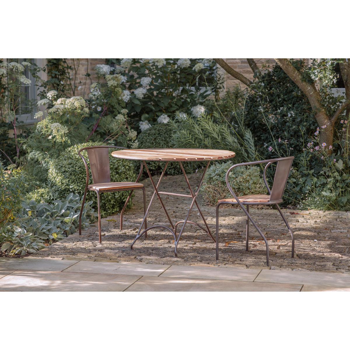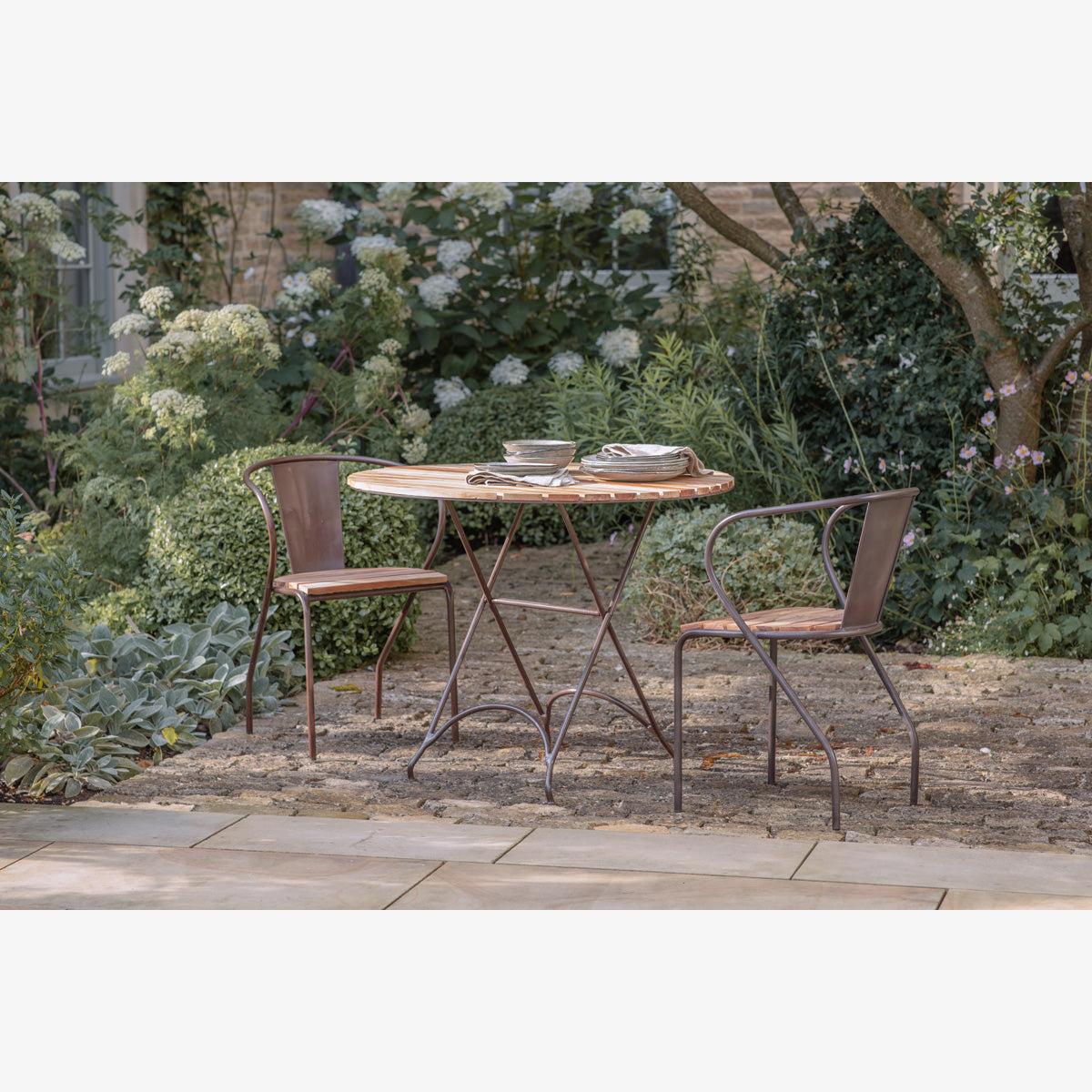 Elegant and understated, the Vivika design pairs the natural materials of acacia wood, which we love for its distinctive grain and its durability, with a simple metal frame that has a rustic bronze finish, elegant curved feet and cross bar. With a distinctive bistro feel, we are drawn to its effortless style and its lightweight design that allows for easy manoeuvrability and easy storage. Pair with the to complete the look.