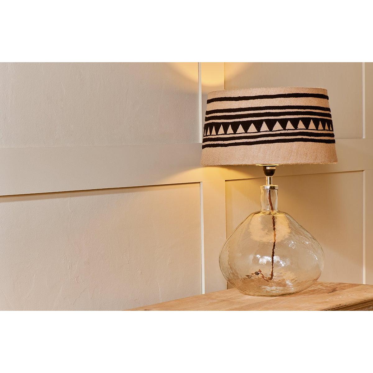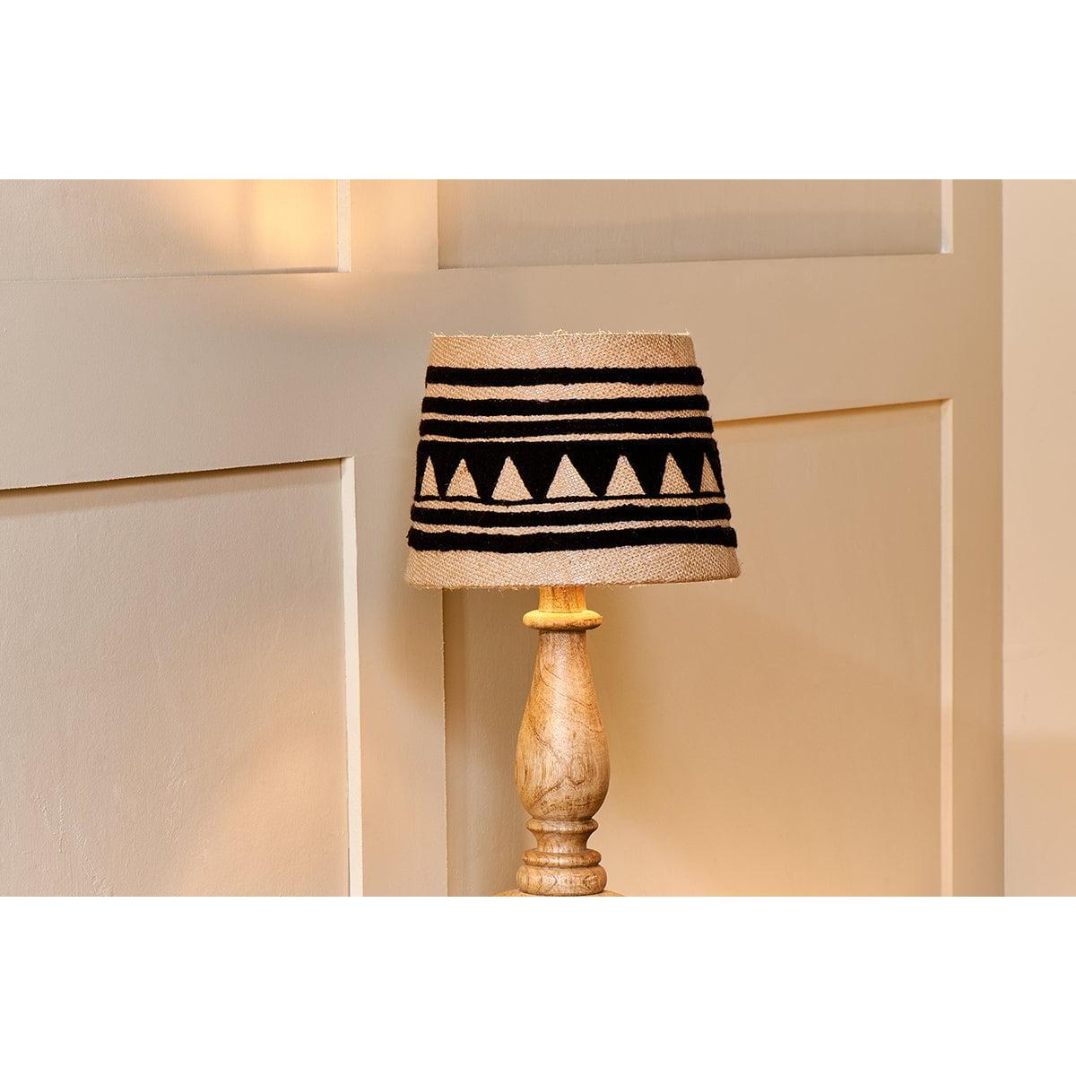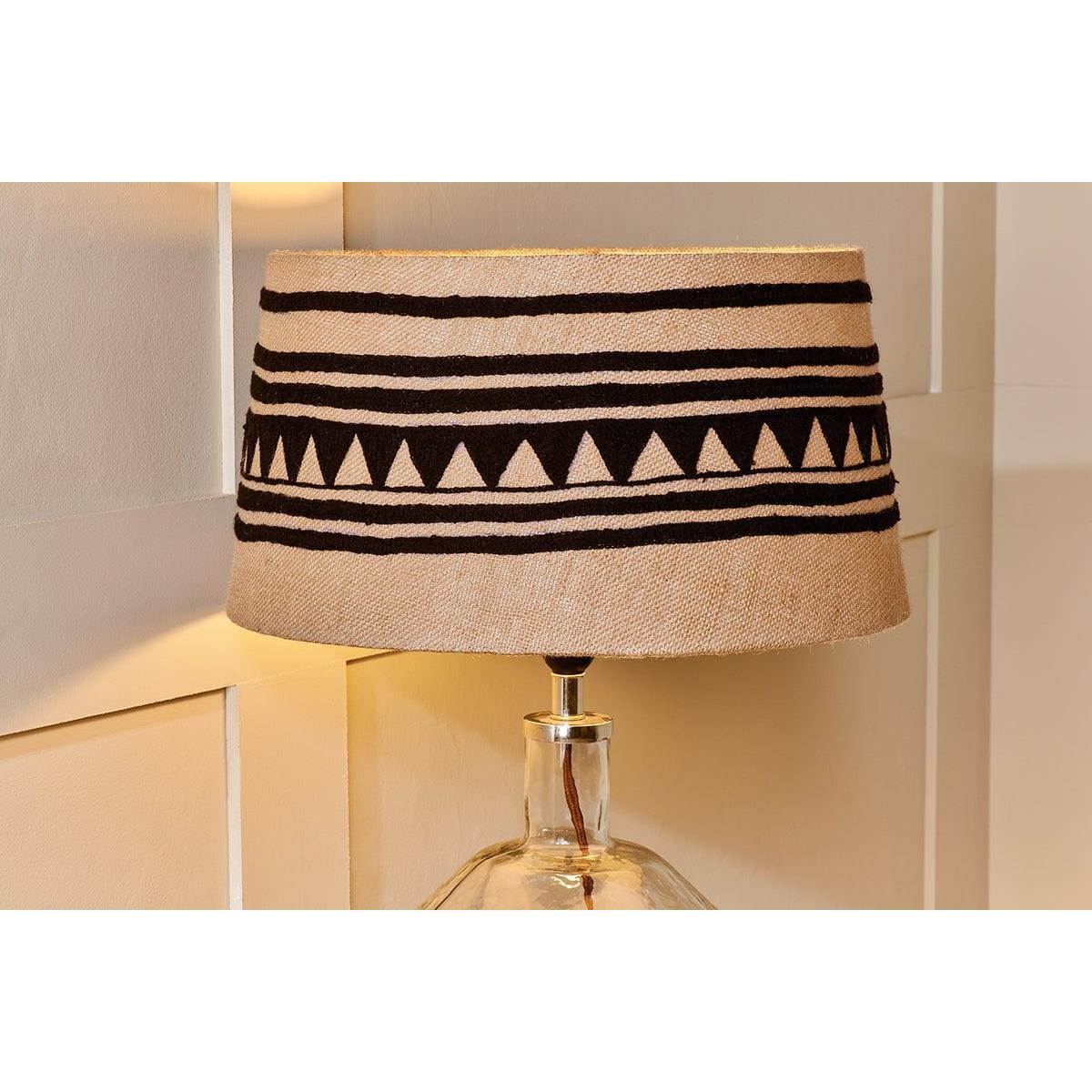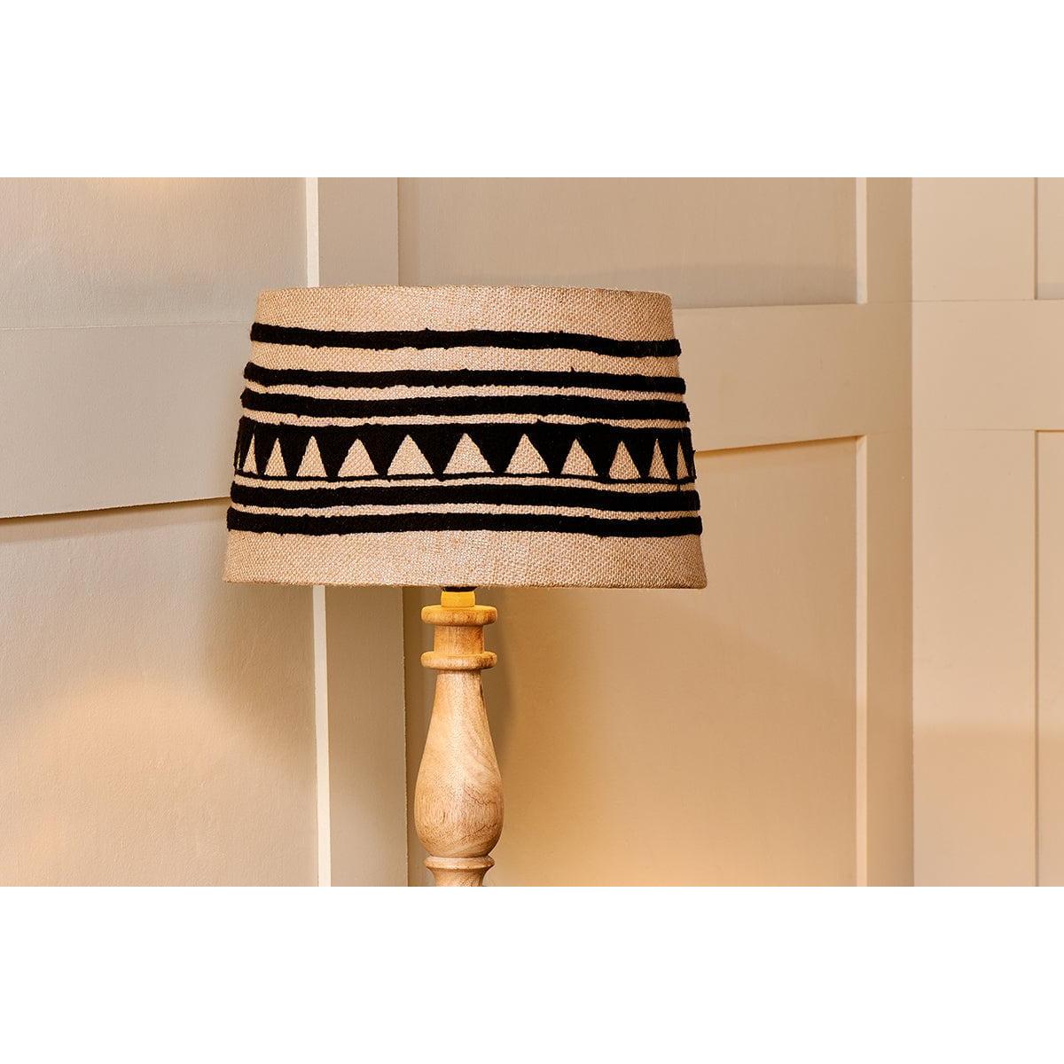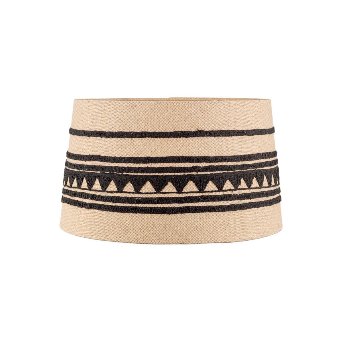 The Yongana jute pattern lampshade contrasts a striking geometric black pattern against a natural jute background. The black cotton is rich with texture and feels soft to the touch. The linear and triangular pattern wraps fully around the shade and ensuring that even when the light is turned off there is still plenty of interest and character in the shade. The hand stitched pattern takes inspiration from traditional Indian needlework patterns but brings with it a modern twist. The tones of natural and black are a compatable pairing and the Yongana lamp shape feels playful and different.