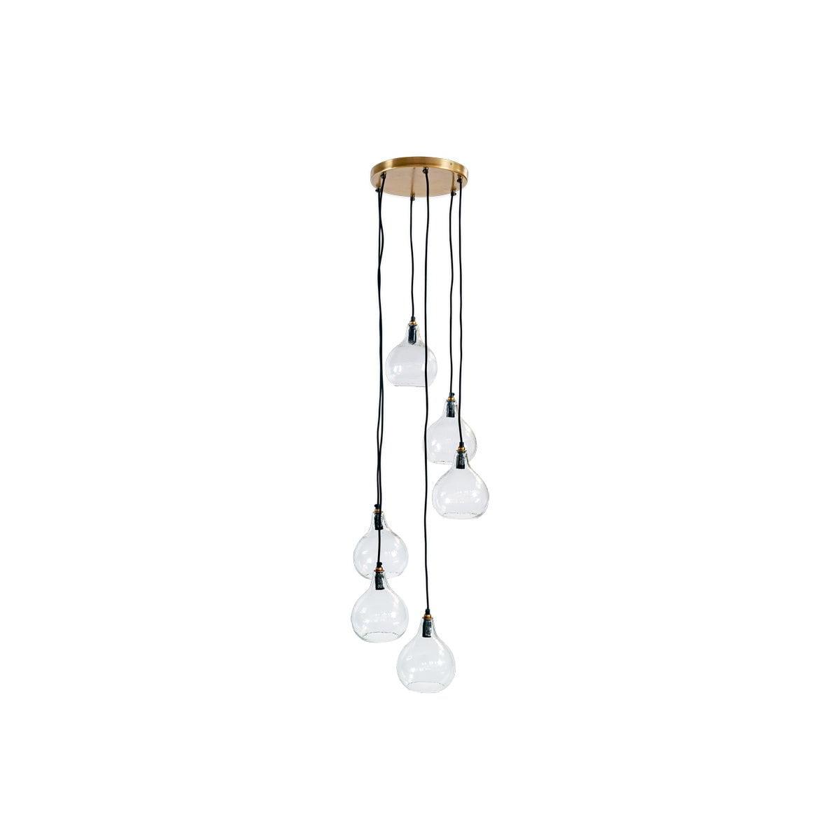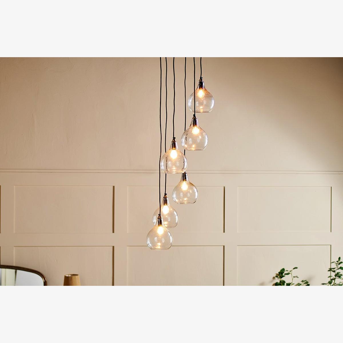 The Zia statement cluster pendant makes a standout centre piece. The collection of six recycled glass tear drop shaped lights at varying heights provides a contemporary altenrative to a chandelier. Style them in an entrance hallway or stairwell as a key focal point, or display above a dining table. Each of these Zia pendants is made from recycled glass, the black fabric cables afixes to an attractive brass ceiling rose.