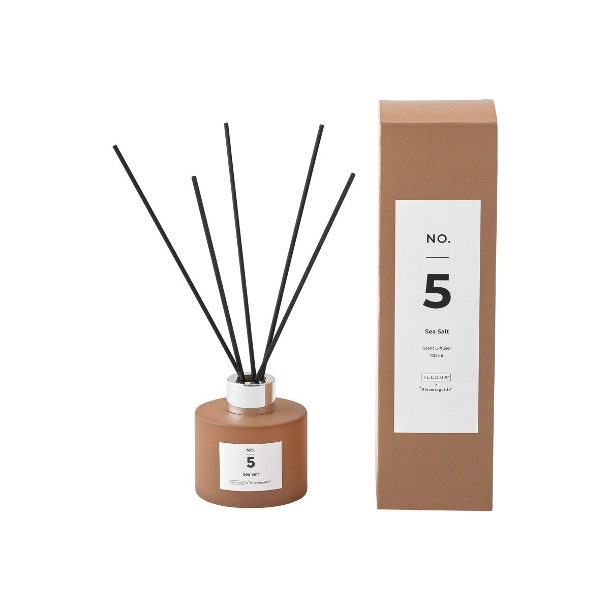 The NO. 5 Sea Salt reed diffuser from Illume x Bloomingville smells like the sea and envelopes you in a light and cooling ocean breeze. The NO. 5 Sea Salt reed diffuser has several layers of scent, just like a perfume. You smell sea salt and a green scent first. The scent changes after a while to the second stage when you will smell the key notes, which include apple, the sea and rose. Finally the base notes of vanilla wood and musk linger on after all the others.