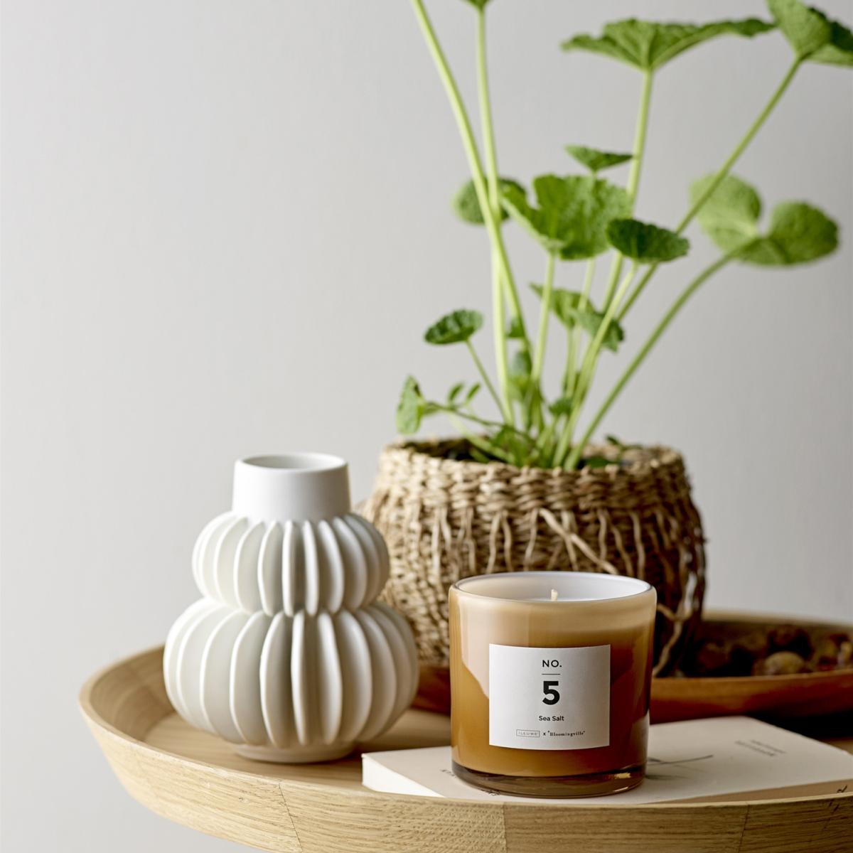 The NO. 5 Sea Salt scented candle from Illume x Bloomingville smells like the sea and envelopes you in a light and cooling breeze. The NO. 5 Sea Salt candle has several layers of scent, just like a perfume. You smell sea salt and a green scent first. The scent changes after a while to those of the second stage, in which you'll smell the key notes, which include apple, the sea and rose. Finally, the base notes of vanilla wood and musk linger on after all the others.