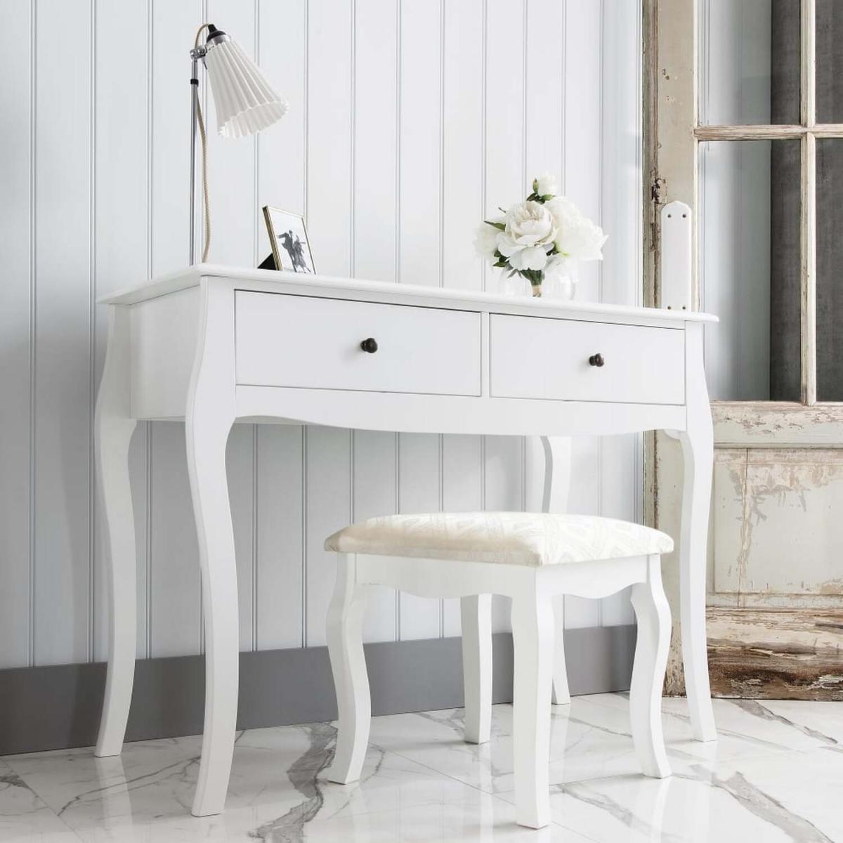 The elegant Camille Desk and Stool set works as a charming dressing table for your bedroom. Balancing French style elements with modern design, the graceful set adds character and style whilst staying understatedly chic. All our Camille Pieces are crafted from MDF and Solid Pine, which combine a minimal aesthetic with soft, curving legs. The fresh white hue is uplifting and peaceful; it promises to work harmoniously with your bedroom colour scheme. A gentle pink pattern on the stools' upholstered seat creates a feminine touch. Complement the set with our matching Camille furniture to ensure a fluid style throughout your boudoir.