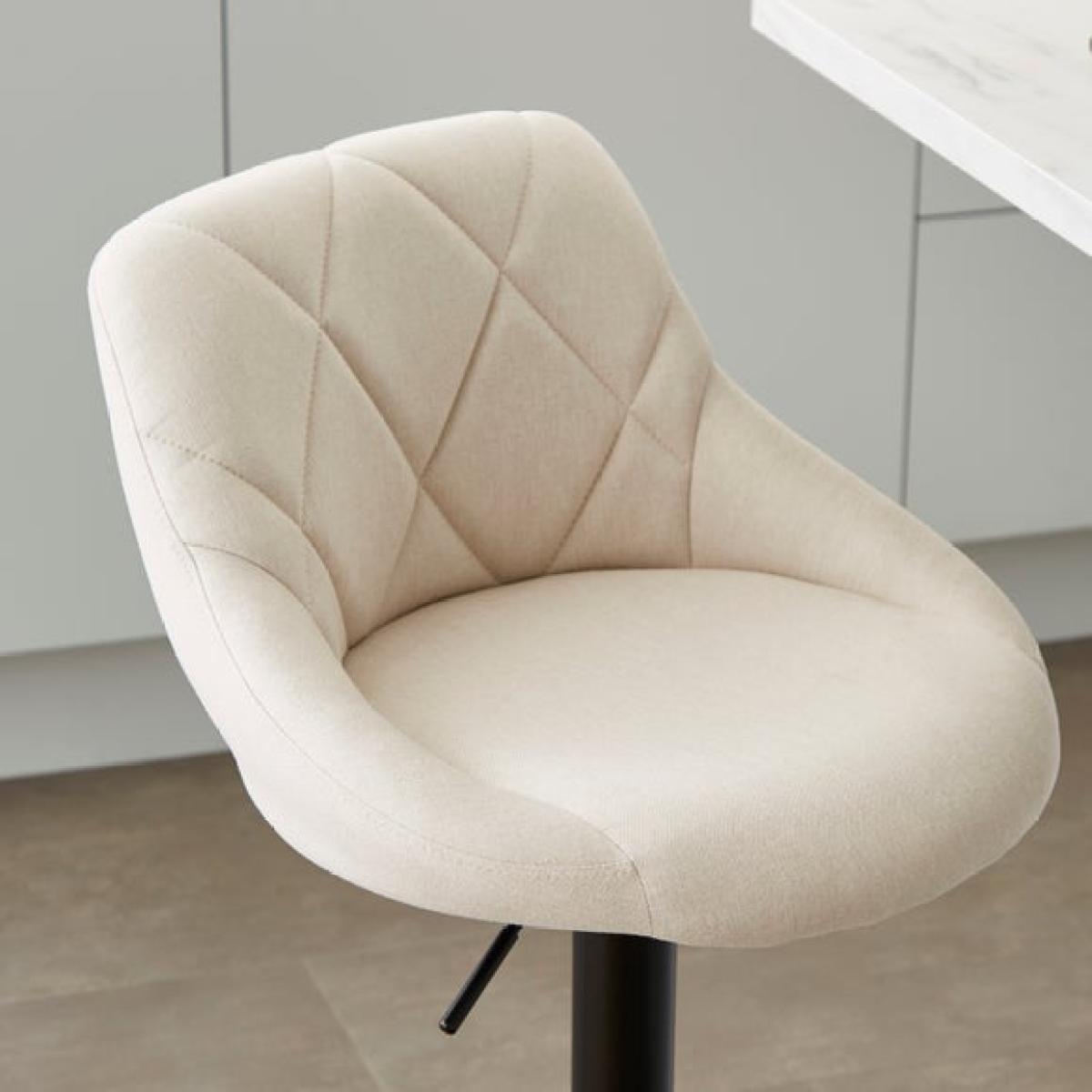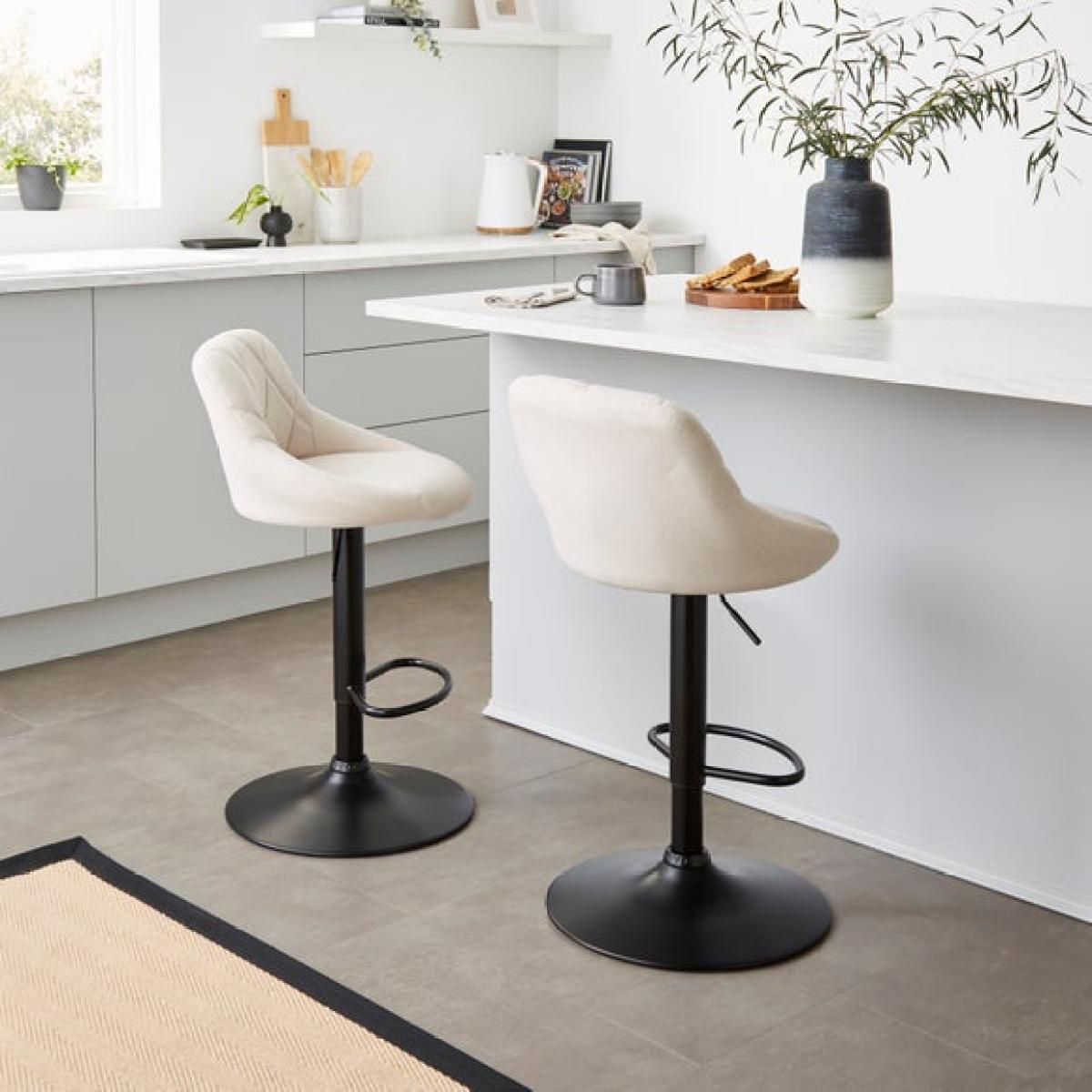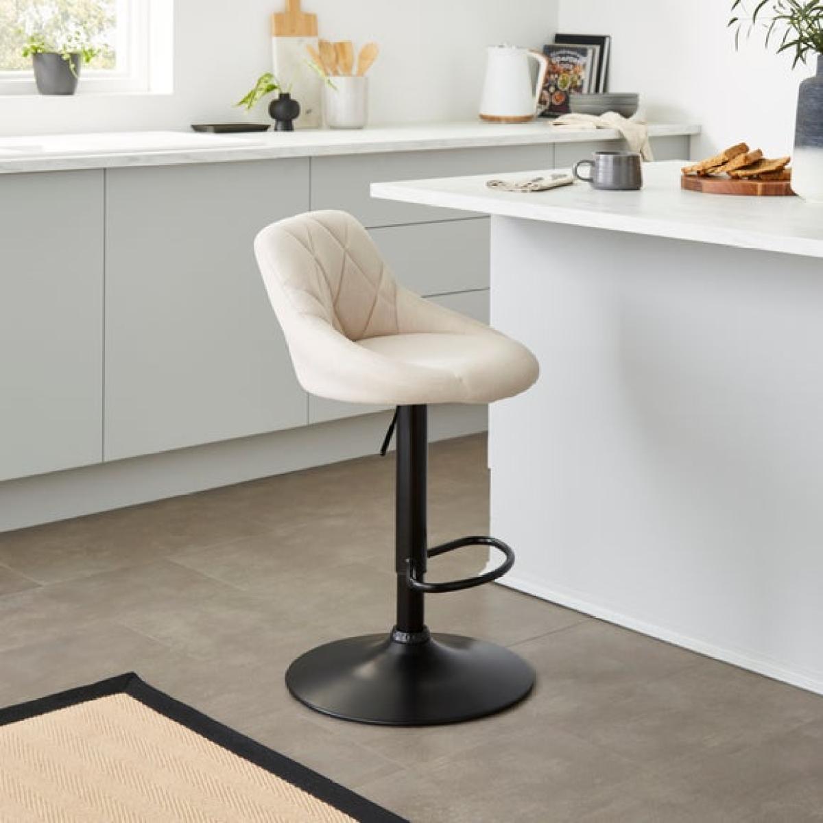 I love this barstool for its simplicity and practical versatility. The adjustable height feature makes it ideal for different bar or counter heights, offering real flexibility in various kitchens or breakfast bars. Its neutral fabric and sleek black base give it a contemporary look that complements a range of interior styles, from minimalist to Scandi-inspired spaces. To style it well, consider pairing it with other soft textures or light wood elements to keep the space feeling airy and welcoming. It works particularly well in informal spaces like breakfast nooks or kitchen islands, and its adjustable settings make it great for accommodating different users comfortably.
