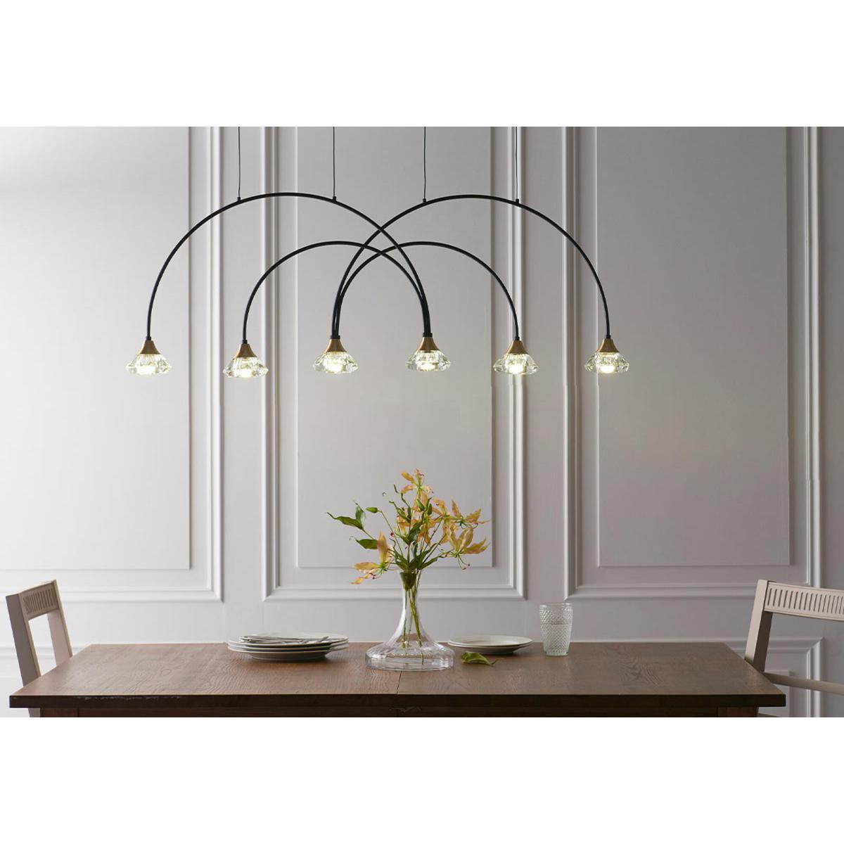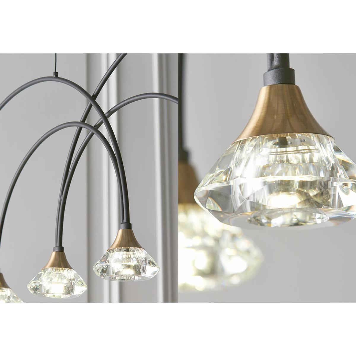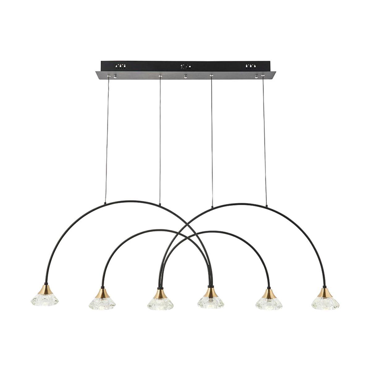 Make a declaration of style confidence with the Noah Black Arch Pendant; a grand design with bold structure and a chic contemporary twist. In this design, crisp black metal framework is bent into accentuated overlapping arches, and much like a rainbow, there is treasure to be found at the bottom, coming in the form of six beautiful crystals with integrated LED lights. A perfect accompaniment to tall ceilings, Noah is here to bring out the most in large rooms, grand entrances and dining halls.