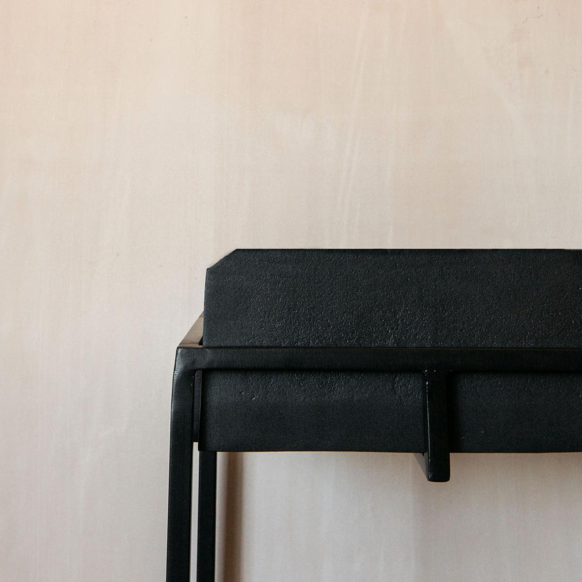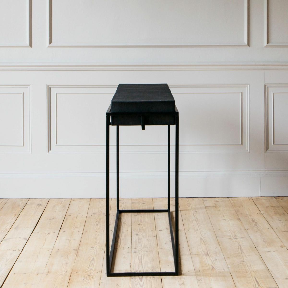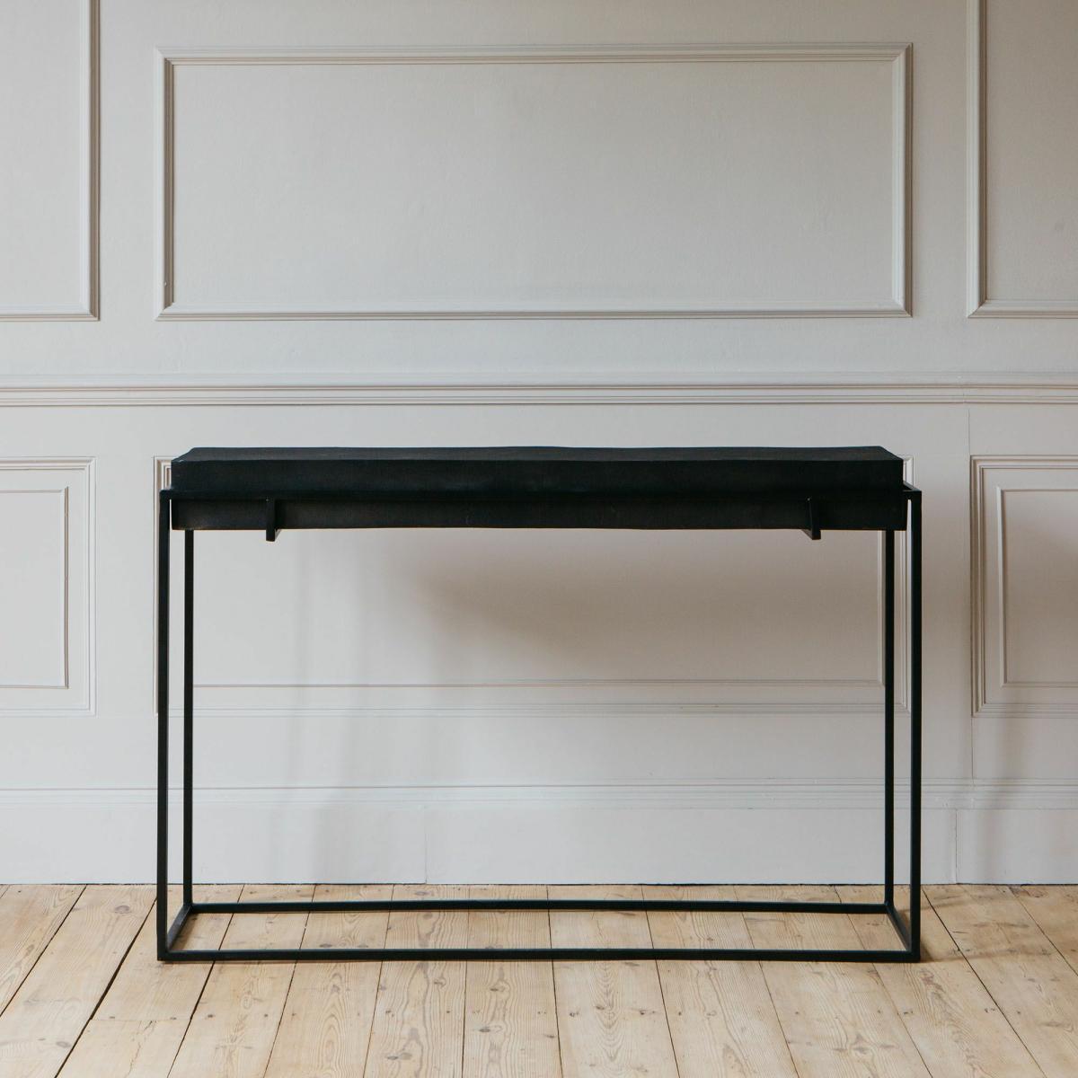 A pared-back silhouette crafted from aluminium with a black distressed finish and architectural iron legs, the Noah console table will slip seamlessly into any minimalist's home.