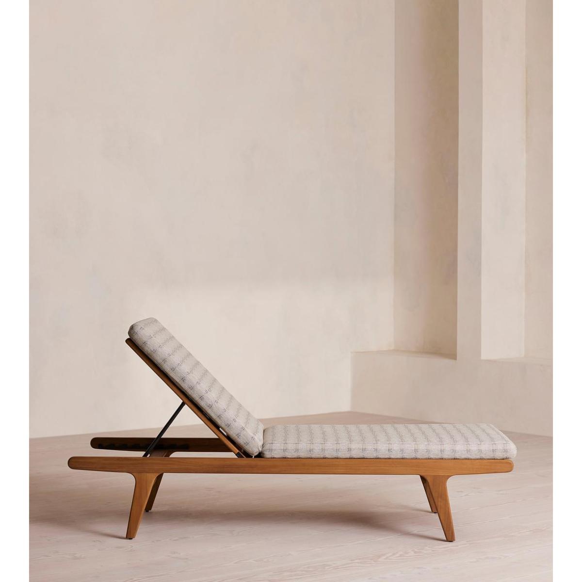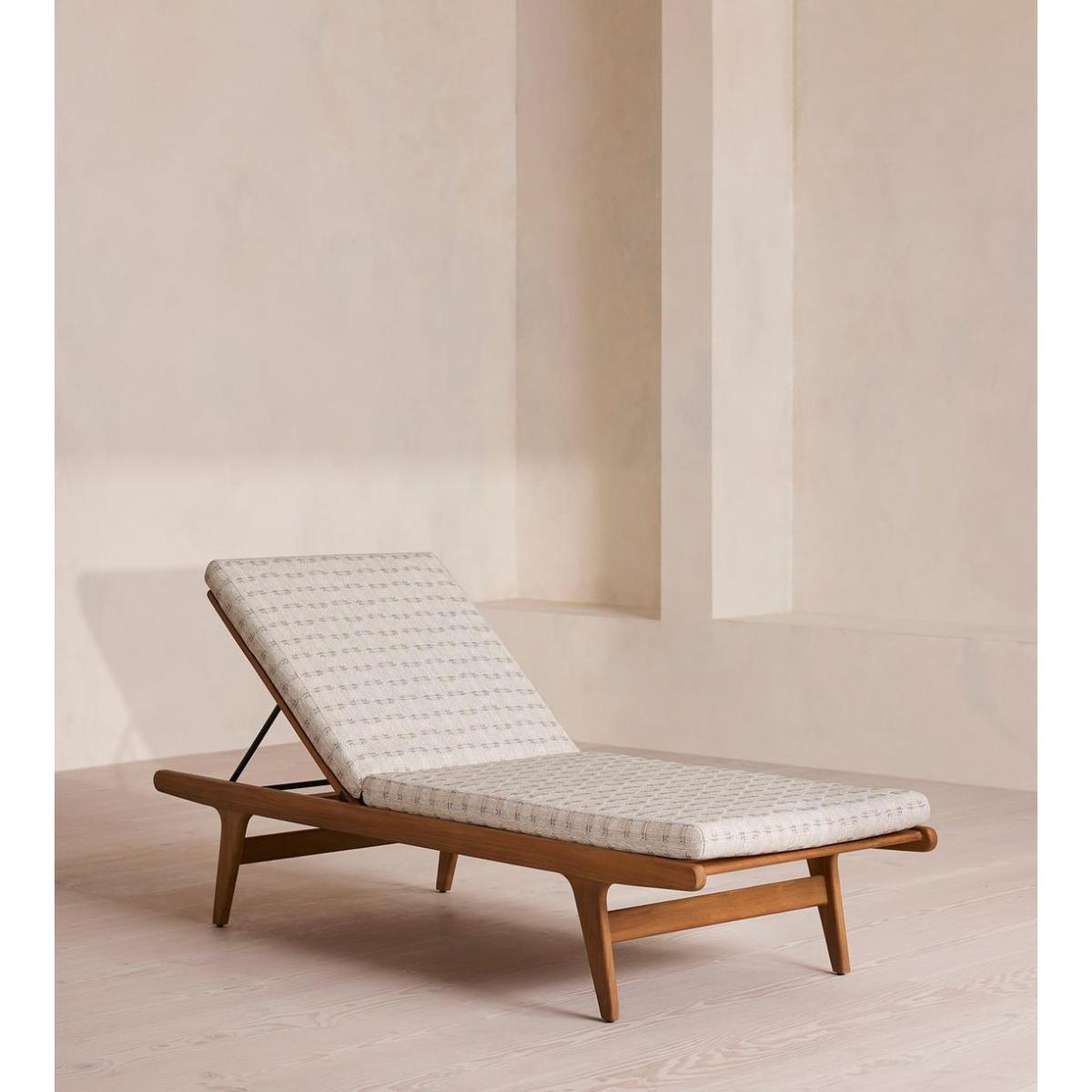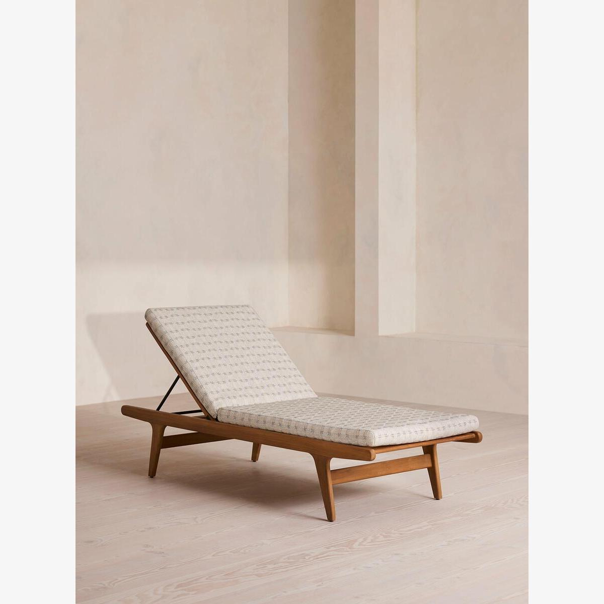 Inspired by Soho House Nashville, the Noah lounger recreates the joy of a Soho House summer by the pool in your own outdoor space. The multi-level recliner design has been crafted from solid teak with a dark stain finish and features four height options for optimum comfort, as well as two wheels for easy transportation. Upholstered in Christopher Farr's 'Baja Outdoor Latte', this geometric fabric is designed to withstand the elements, while giving your interiors scheme a subtle vintage feel. Upholstered lounger Crafted from solid teak Dark stain Wire brush finish Upholstered in Christopher Farr's 'Baja Outdoor Latte' fabric Multi-level recliner design Four height options, including fully flat Fitted with two wheels Also available in Shoreditch House's striped upholstery Inspired by the sunbeds at Babington House