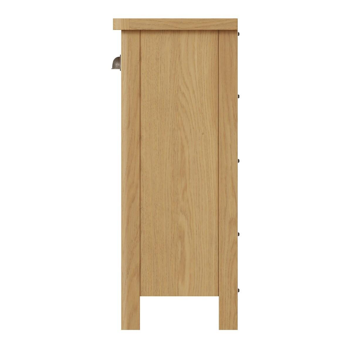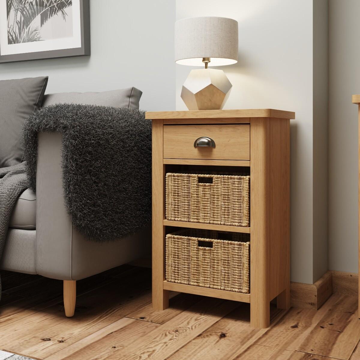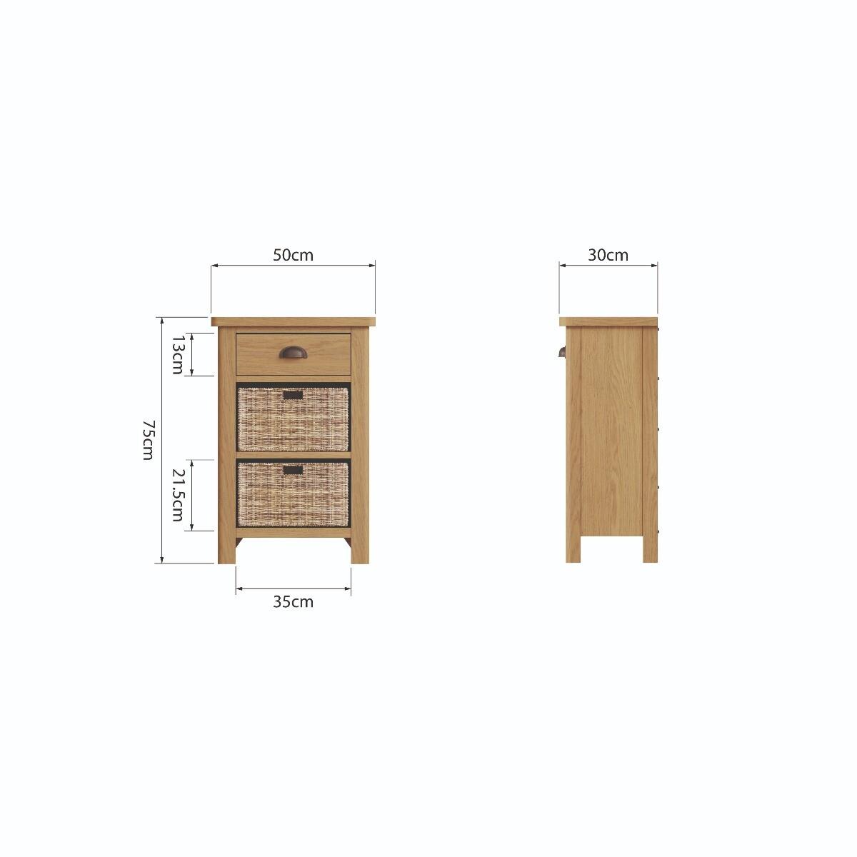 The stylish combination of wicker and rustic oak makes the Noah a winner in both traditional and modern homes. Crafted from oak, pine and veneers, with chunky legs and gently rounded corners, the versatile unit offers attractive storage and looks just as stunning in your bedroom or living room.• Robustly built from oak, oak veneer, pine, plywood, MDF and wicker• Timeless rustic oak finish• Stunning antique brass effect cup handle on drawer• Exquisitely crafted wicker storage baskets• Assembled and ready to use