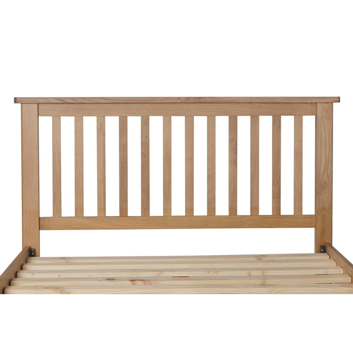 Add classic style to your bedroom with the Noah Rustic oak Double Bed. Crafted from durable timbers, the double bed features a slatted headboard and rustic oak finish for a timeless look and is complete with sturdy solid wood slats. Sturdy and stylish double bed with rustic oak finish suits any homeDurableframe. Sturdy solid wood slats for maximum support and comfort. Slatted headboards for a classic look. Also available in Single and King Size Complement the bed with matching items from the Noah Rustic oak Collection