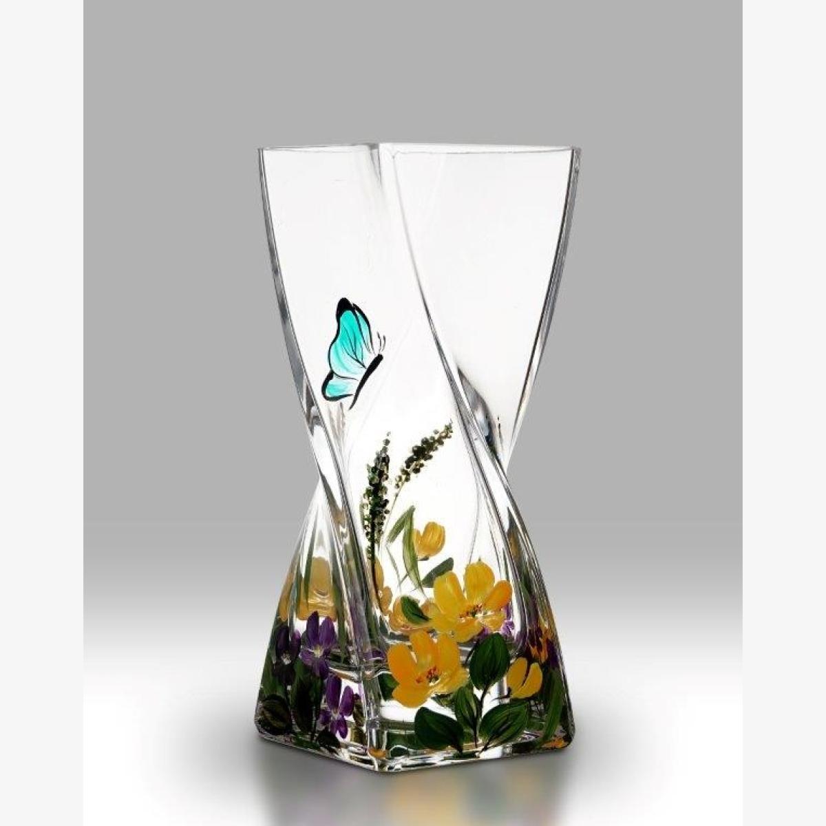 Nobile Glassware Dancing Butterfly Twist Vase measuring 20cm. The Dancing Butterfly Twist Vase is a colourful decorative piece of homeware, styled with an unique hand painted artistic flower design with colourful Dancing Butterfly. The Dancing Butterfly Twist Vase is made from hand blown glass and comes in its own branded box.  Show off this decorative piece in the home today! New for 2023 Glassware Dancing Butterfly Hand Made Size - 20 cm Shape - Twist Colour - Various