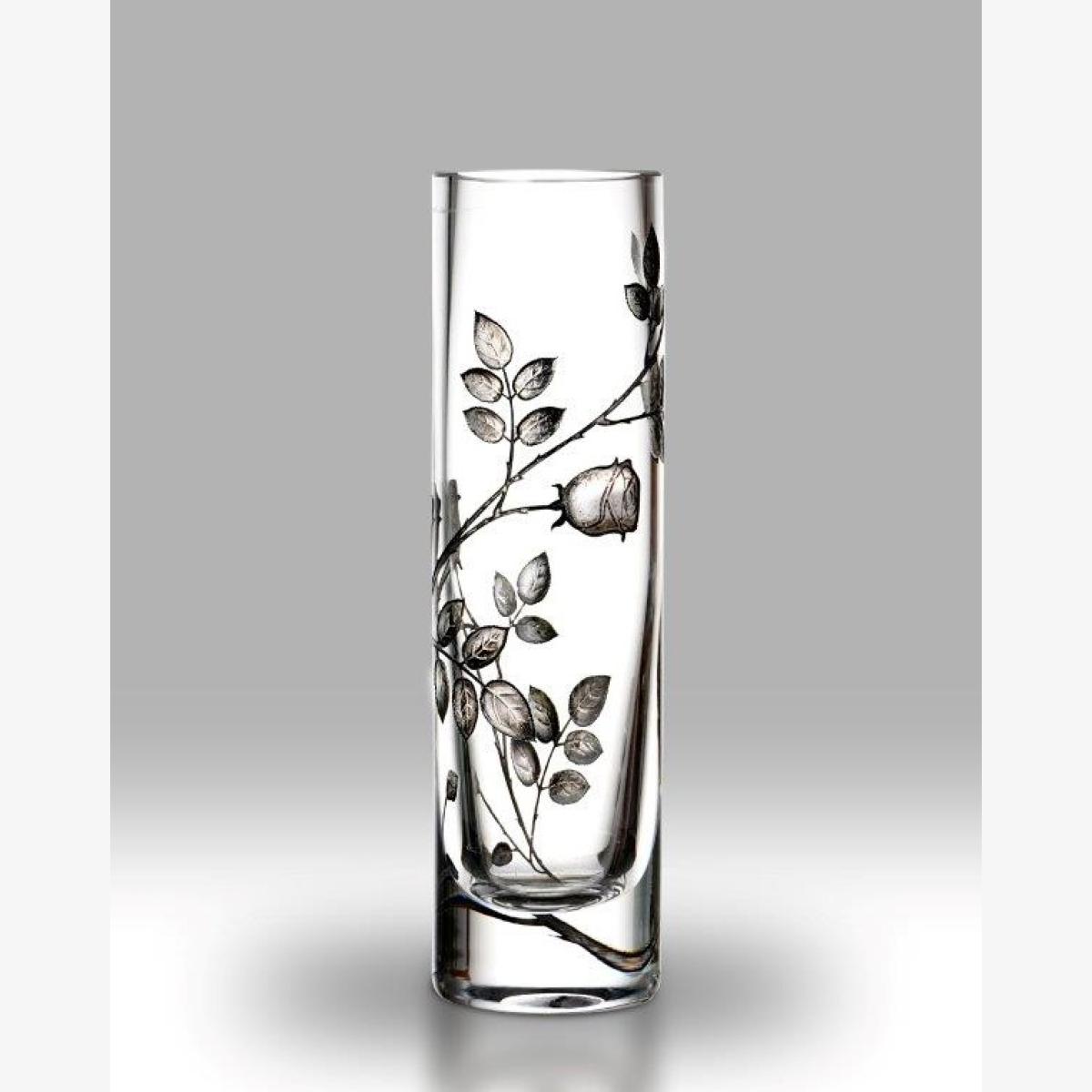 Nobile Glassware Forever Rose Silver Bud Vase 19.5cm. This truly stunning hand crafted and decorated Vase featuring a beautiful entwining silver Rose design. Hand Blown and Decorated by Master Craftsmen making each piece unique Nobile Glassware Approximate Height: 19.5cm Material: Glass This item is boxed