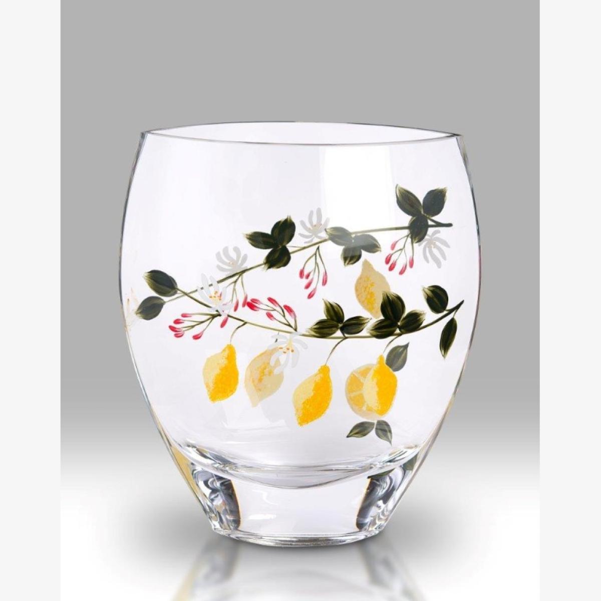 Nobile Glassware Lemon Grove Curved Vase measuring 21cm. The Lemon Grove Curved Vase is a colourful decorative piece of homeware, styled with an unique hand painted artistic flower design. The Lemon Grove Curved Vase is made from hand blown glass and comes in its own branded box.  Show off this decorative piece in the home today! Dimensions - 21 cm Shape - Curved Colour - Green, Yellow