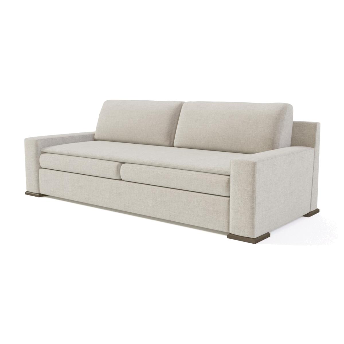 The proportions of this sofa are imagined for hosting. The sober and refined lines are counterbalanced by an upholstered seat topper that can be personalised. Customisable with any suitable fabric. Quantity of fabric required is 18 metres in total. Please view our fabrics page and contact us for options and pricing. Each order is exclusively made, allowing the customer to select from our vast range of upholstery fabrics. This bespoke hand-made to order production involves a possible difference between measurements shown in our product details and the final product of +/- 3%.