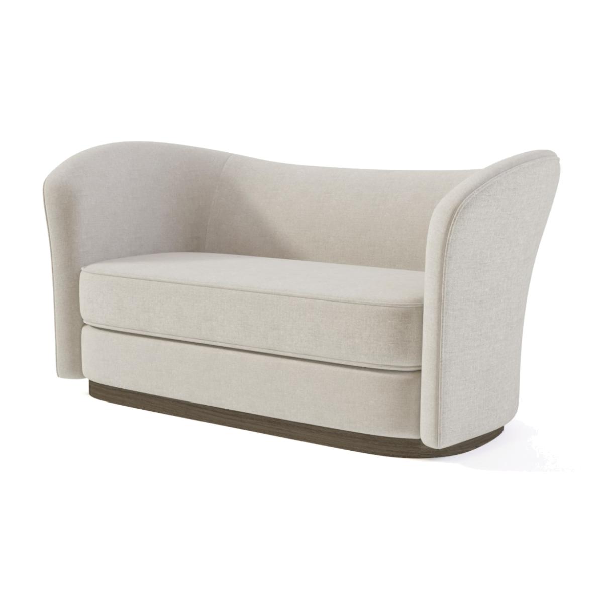 Compact and enveloping, the particularity of this sofa is its backrest that opens as a corolla. This singular shape creates comfort and intimacy. Customisable with any suitable fabric. Quantity of fabric required is 10 metres in total. Please view our fabrics page and contact us for options and pricing. Each order is exclusively made, allowing the customer to select from our vast range of upholstery fabrics. This bespoke hand-made to order production involves a possible difference between measurements shown in our product details and the final product of +/- 3%.