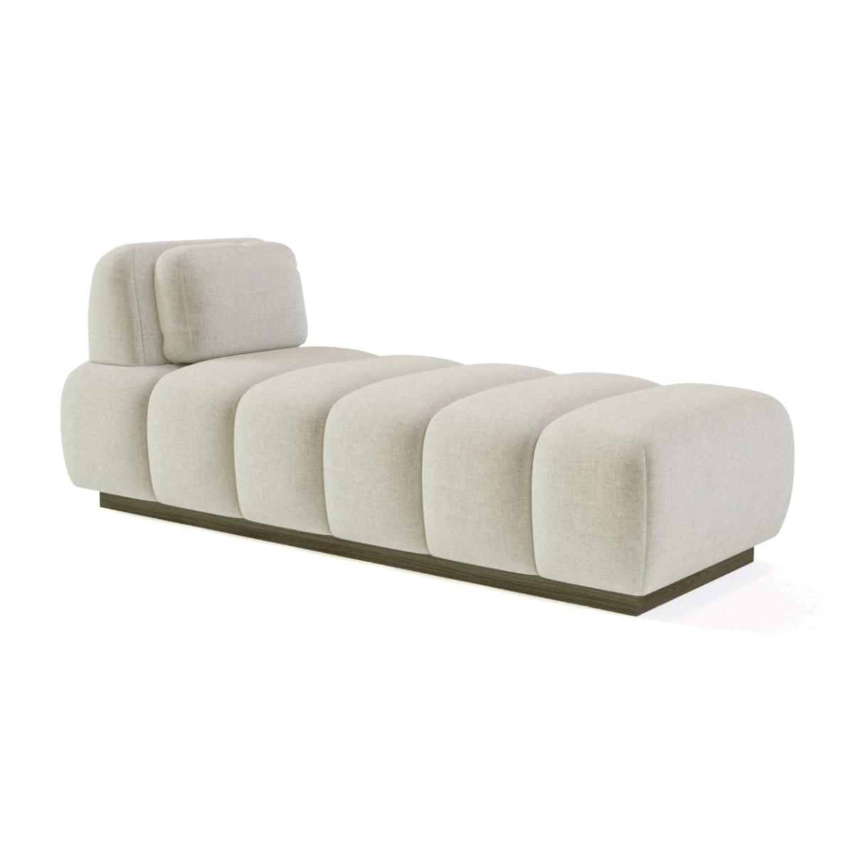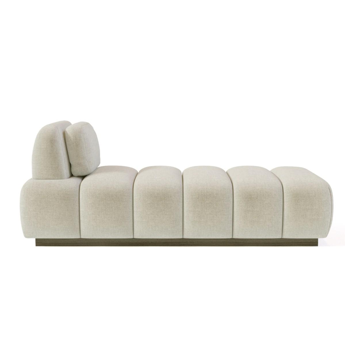 The Vallon daybed is shaped by its roundness, creating an inviting comfort. The subtle work of seams emphasize the rhythm of generous reliefs that allow a play of light on the piece. Cushion included. Customisable with any suitable fabric. Quantity of fabric required is 6. 5 metres in total. Please view our fabrics page and contact us for options and pricing.