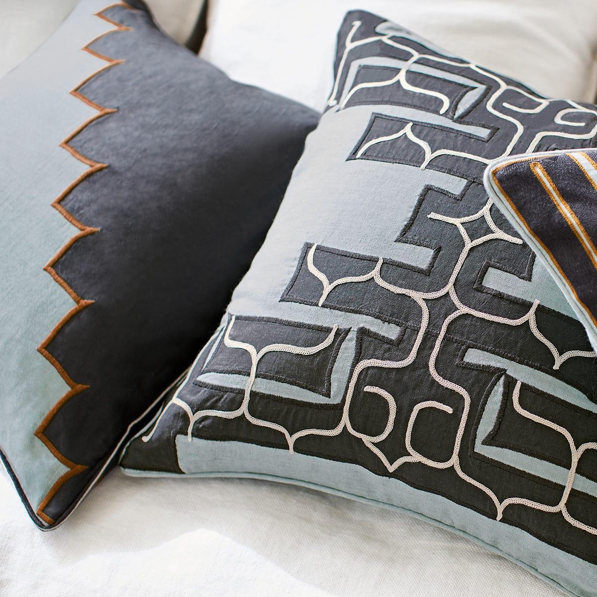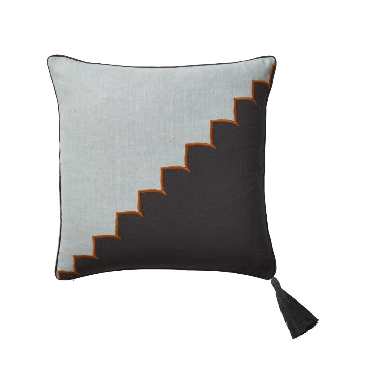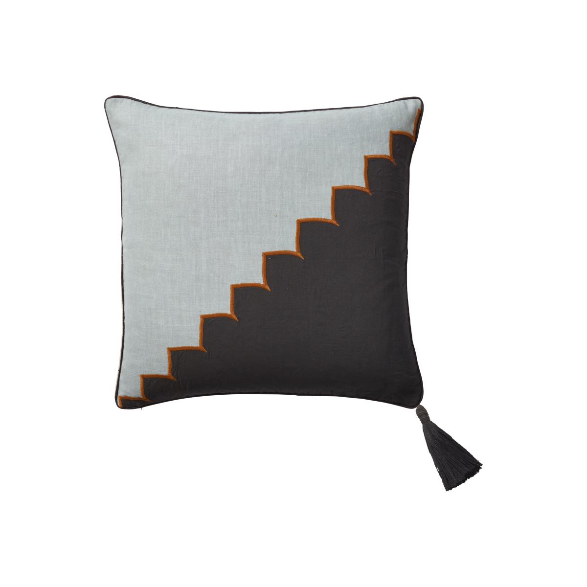 Sue's collection is inspired by the unique patterns found on the robes of the Japanese Ainu people. Multiple techniques have been used in the range, including applique and different styles of embroidery and stitching. The rich colour palette features saffron, grey/blue and charcoal, with hints of loganberry and flax. All of the cushions have a fine linen base, making the Arashi Collection as tactile as it is bold. Noboru Cushion Cover - Grey Blue/Onyx