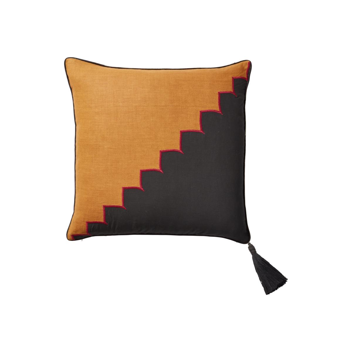 I love this cushion cover for its bold combination of saffron and onyx, which makes it a great statement piece in both modern and eclectic interiors. The geometric design adds a touch of contemporary flair, making it versatile enough for layered sofas or armchairs. It works particularly well in spaces with neutral tones, where it can really stand out, but can also be mixed with other colours for a more eclectic look. Practical styling tips would be to pair it with textured throws or other cushions in complementary hues to create depth. Its compact size makes it ideal for adding a pop of colour to a bed set or a cosy reading nook.