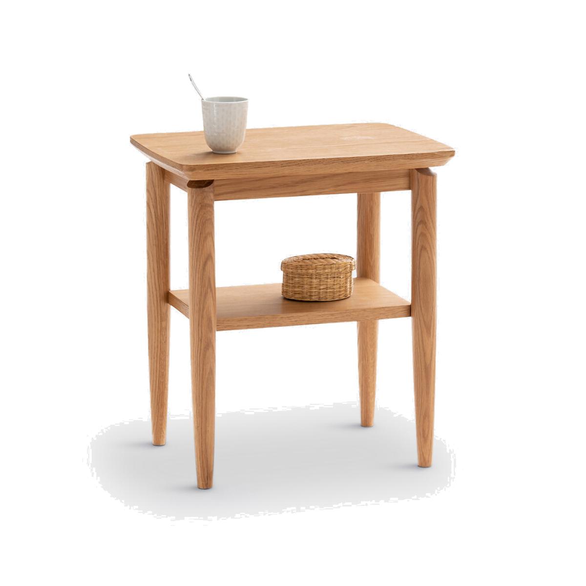 The Nochy two tier bedside table. Its elegant style will look great in any bedroom or living room. It can be used as a bedside or side table. Product Details • 2 MDF oak veneer tiers • Solid oak legs • Nitrocellulose varnish finishDimensions. Overall • Width 45.8cm • Height 51cm • Depth 33cm. Usable dimensions • Shelf : L34.5 x H26 x D21.5cmDelivery:. Assembly required. Available for home delivery. Dimensions and weight of parcel1 parcel • L54 x H45 x D12cm. Weight 8kg