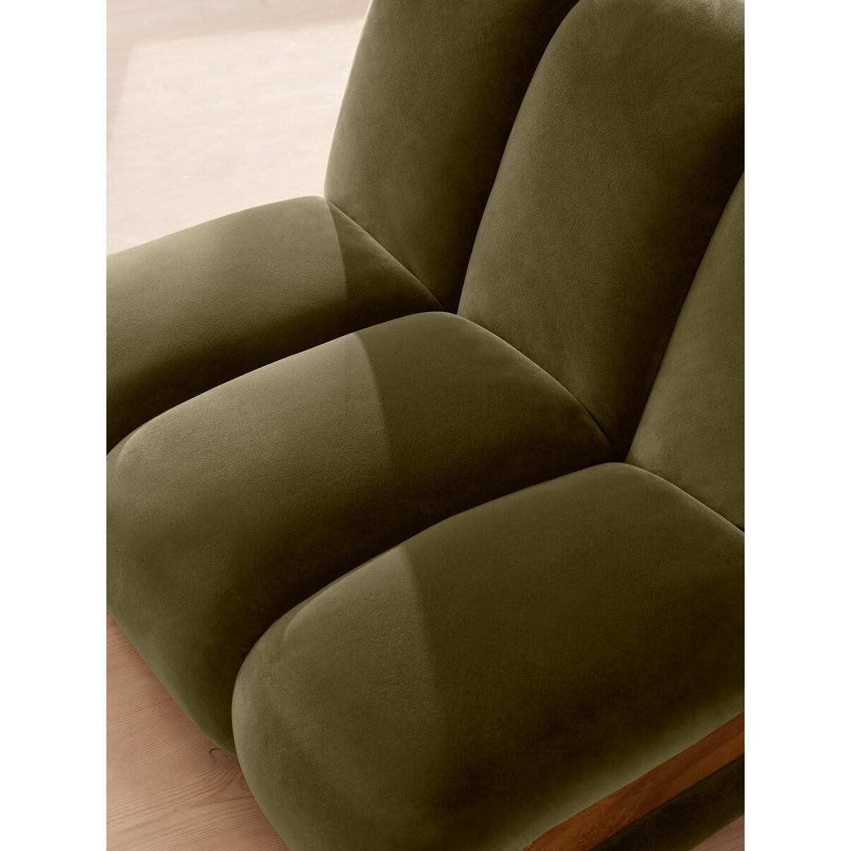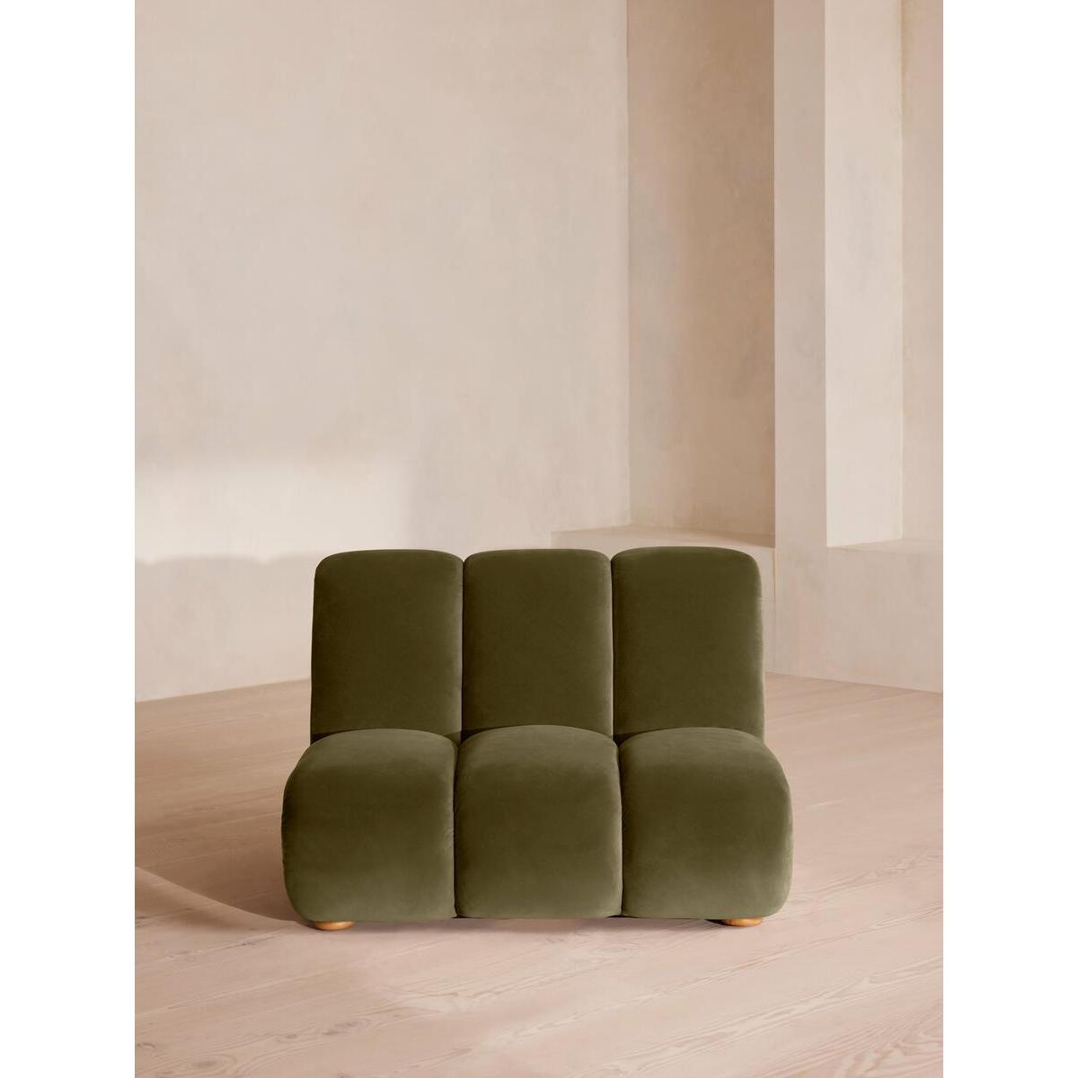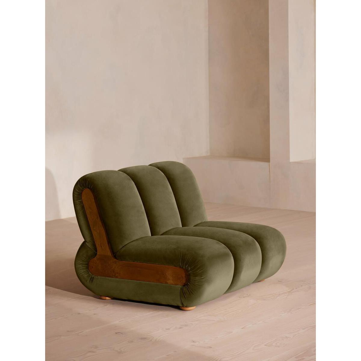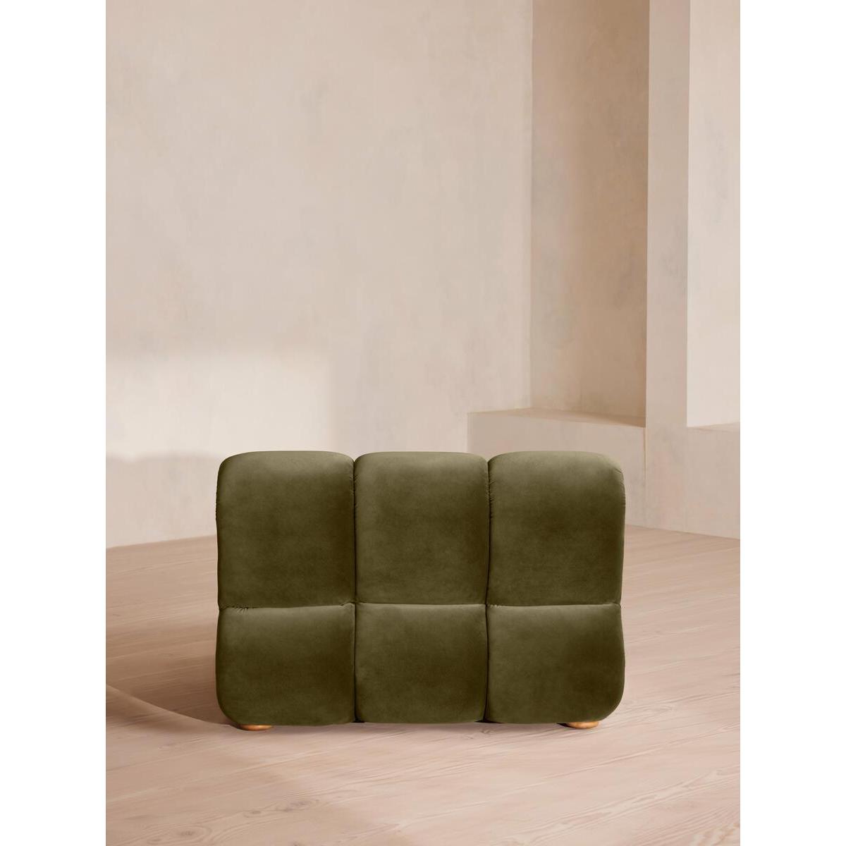 I’m a big fan of this olive-velvet module for its clean, sculptural lines and rich, matt finish - it instantly anchors a room without shouting. It works equally well in a pared-back, Scandi-inspired scheme or alongside warmer woods and brass accents in a more gathered, eclectic space. For styling, pair it with a light jute rug and a black-steel side table to emphasise its curves, then layer in a cable-knit throw or a muted cushion for texture. Tuck a low planter next to it to pick up the olive tone and keep the look fresh and grounded.