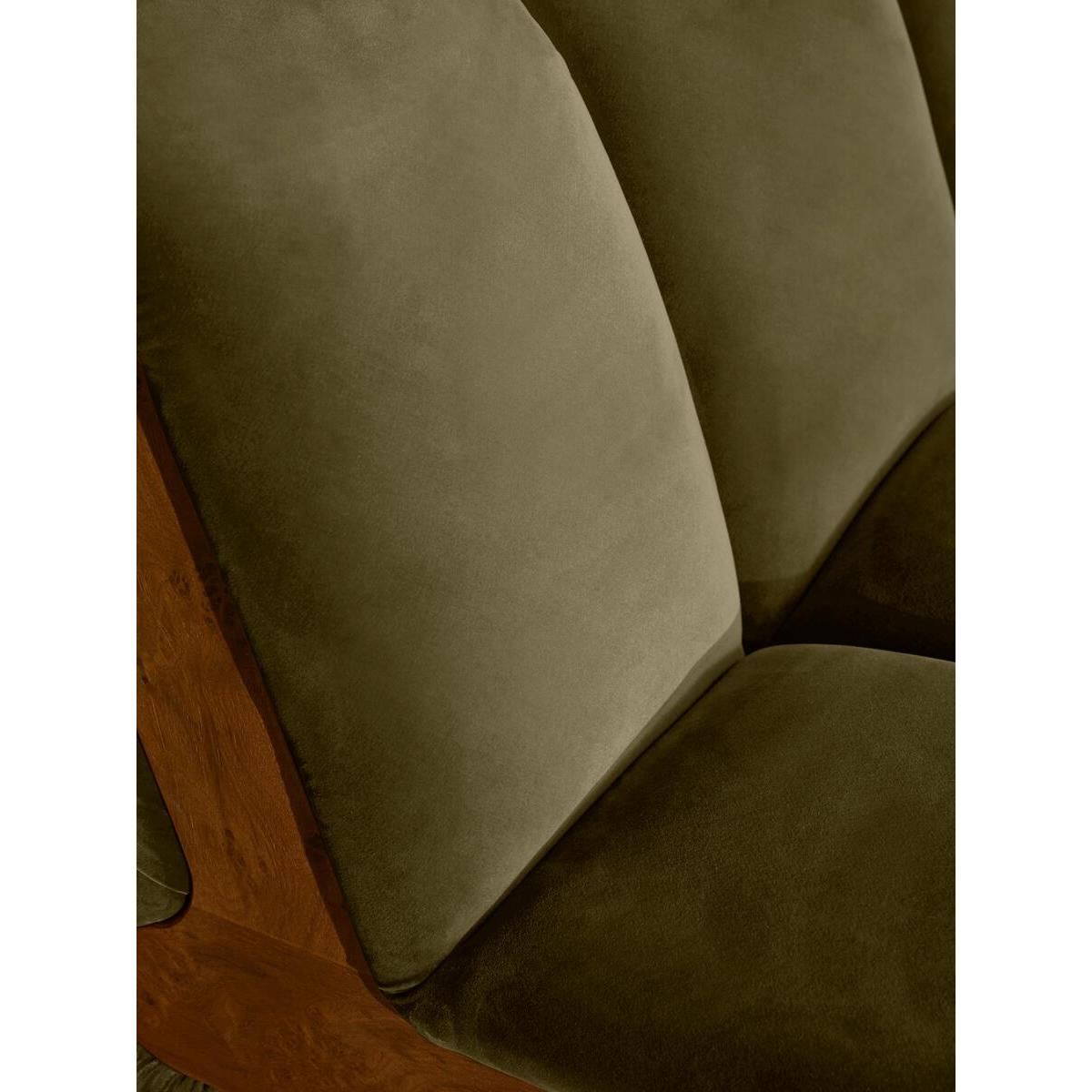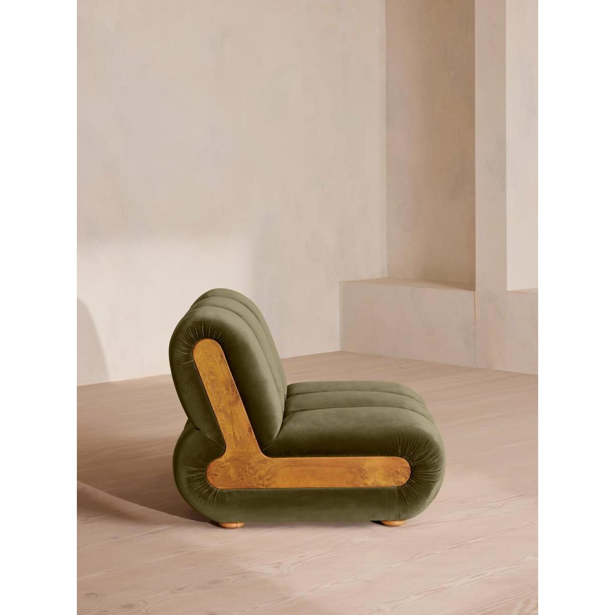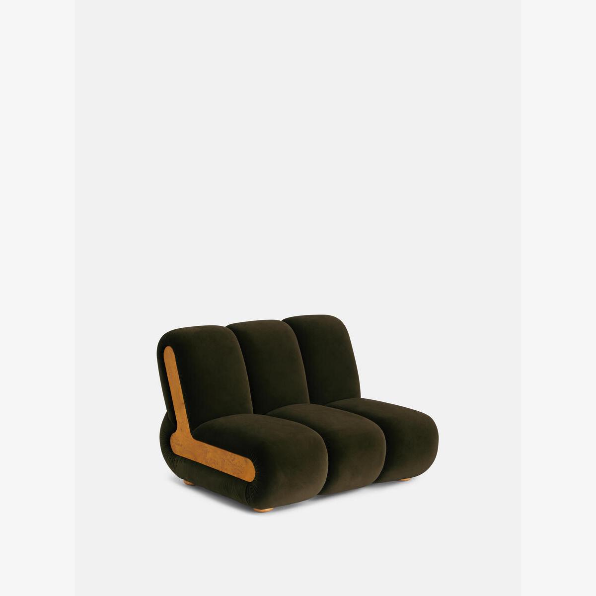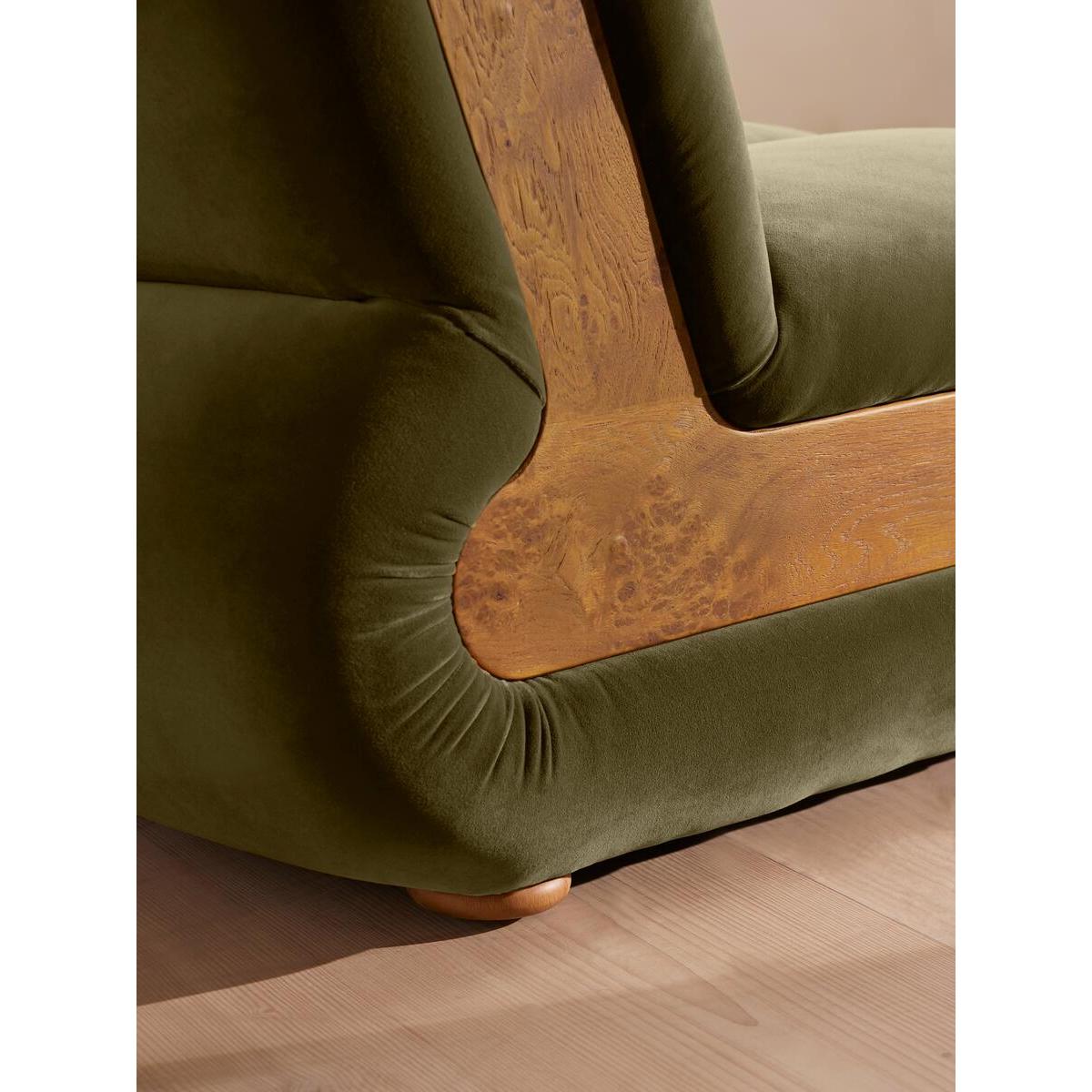I’m a big fan of this olive-velvet module for its clean, sculptural lines and rich, matt finish - it instantly anchors a room without shouting. It works equally well in a pared-back, Scandi-inspired scheme or alongside warmer woods and brass accents in a more gathered, eclectic space. For styling, pair it with a light jute rug and a black-steel side table to emphasise its curves, then layer in a cable-knit throw or a muted cushion for texture. Tuck a low planter next to it to pick up the olive tone and keep the look fresh and grounded.
