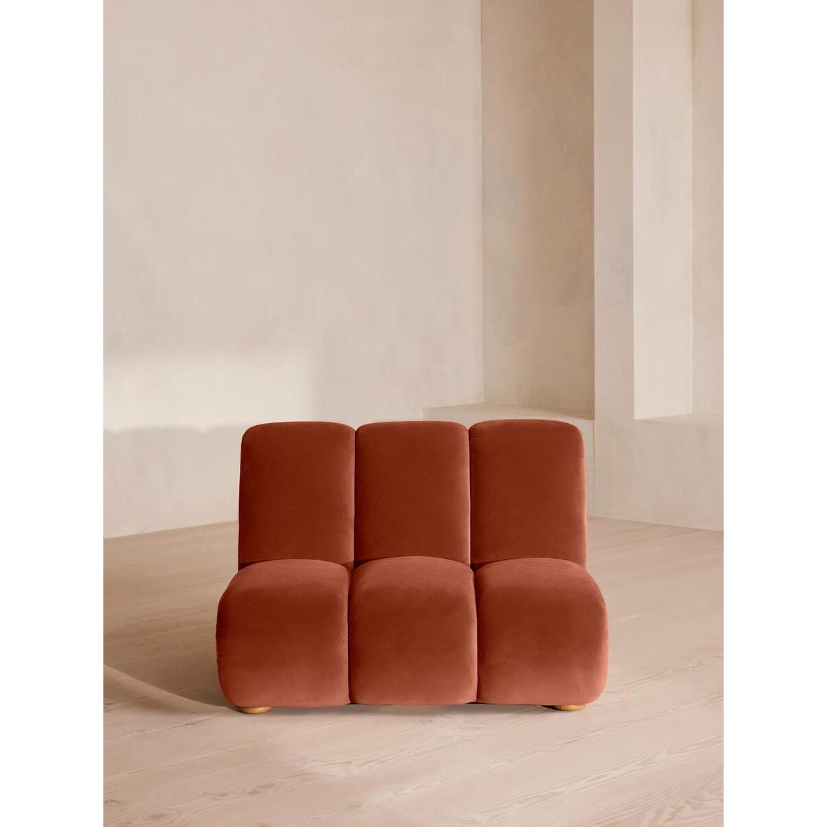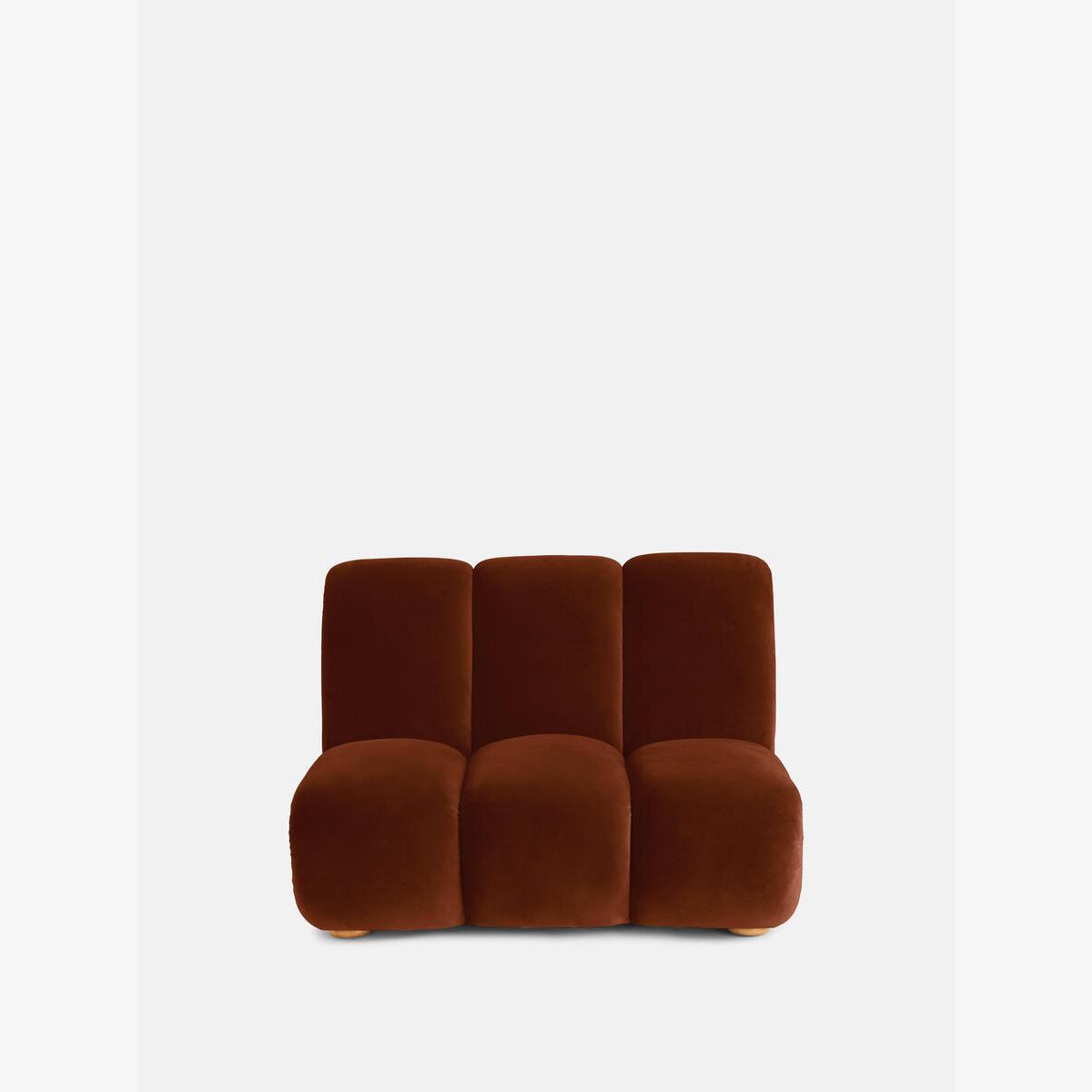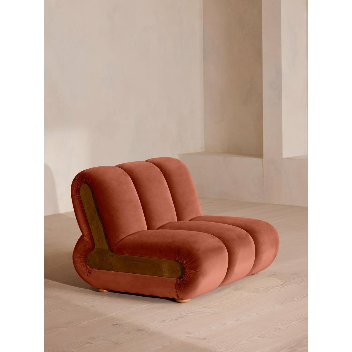 I’m a fan of this rust-velvet module for its clean, modern lines and the warm depth the colour brings without feeling over-the-top. It slots easily into both contemporary and mid-century schemes, and adds a welcoming note to more industrial or neutral spaces. For styling, place alongside a slim brass or black metal side table and layer in a light wool rug to balance the richness of the velvet. A couple of cushions in muted terracotta or sage will lift the look, and if you need extra seating you can link two or more modules to create your own bespoke lounge arrangement.