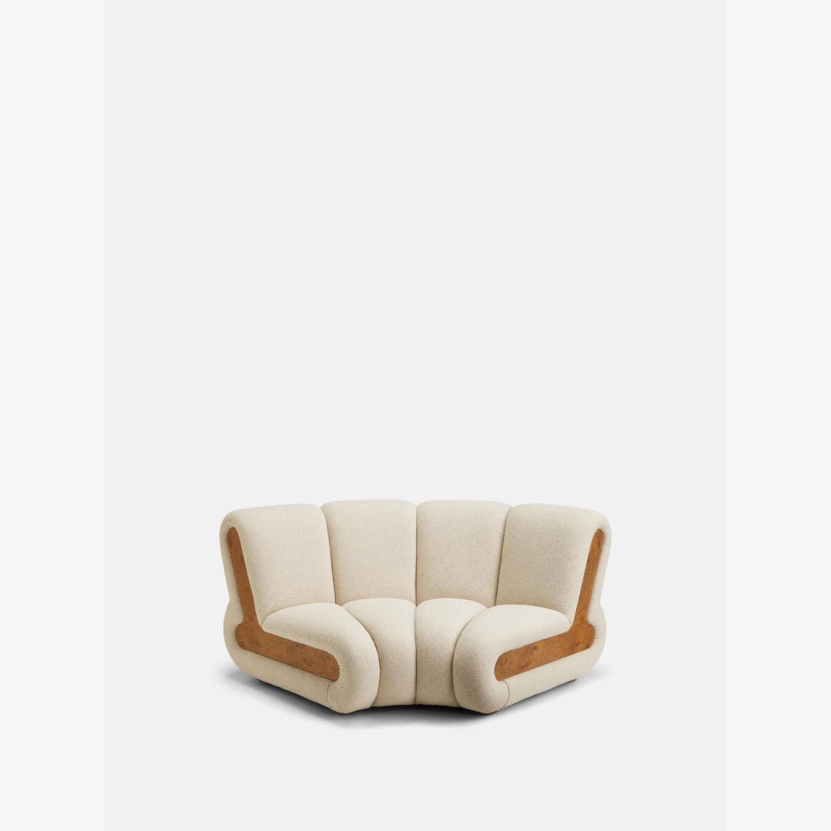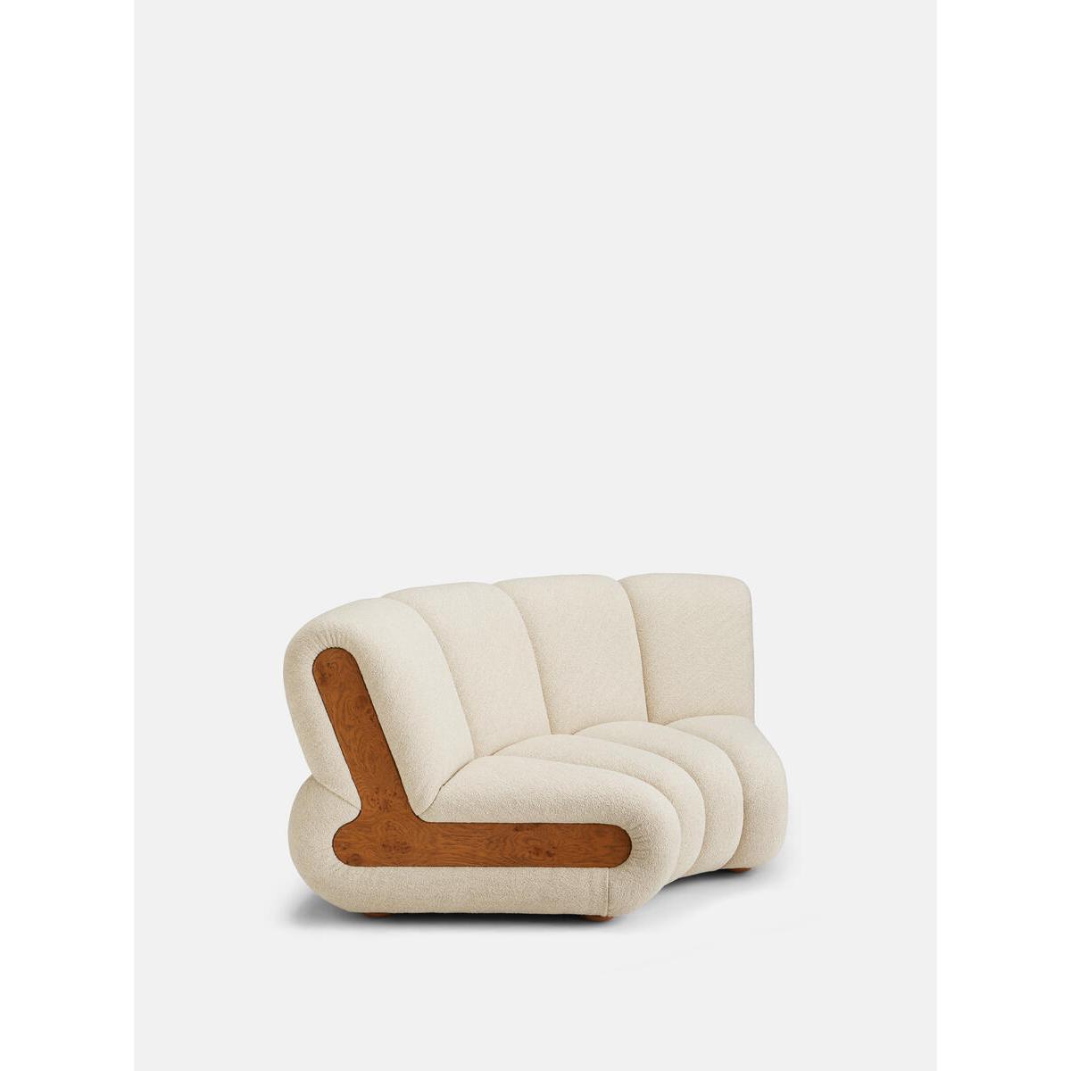 Designed to adapt to any living space, the Noelle modular sofa comprises of straight and curved modules to create the shape you desire, or alternatively a generous armchair if used alone. Cosy boucle upholstery is complemented with aged Pippy Oak veneer sides that have a burl finish, while its statement curved shape takes its design cues from the 1970s interiors of 180 House. Curved armchair Cotton velvet upholstery Aged Pippy Oak veneer Burl finish Inspired by 180 House