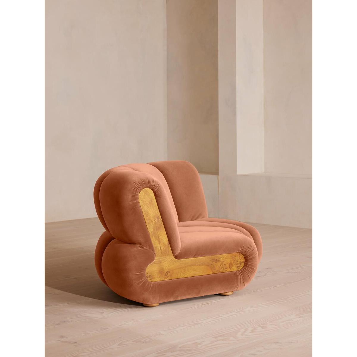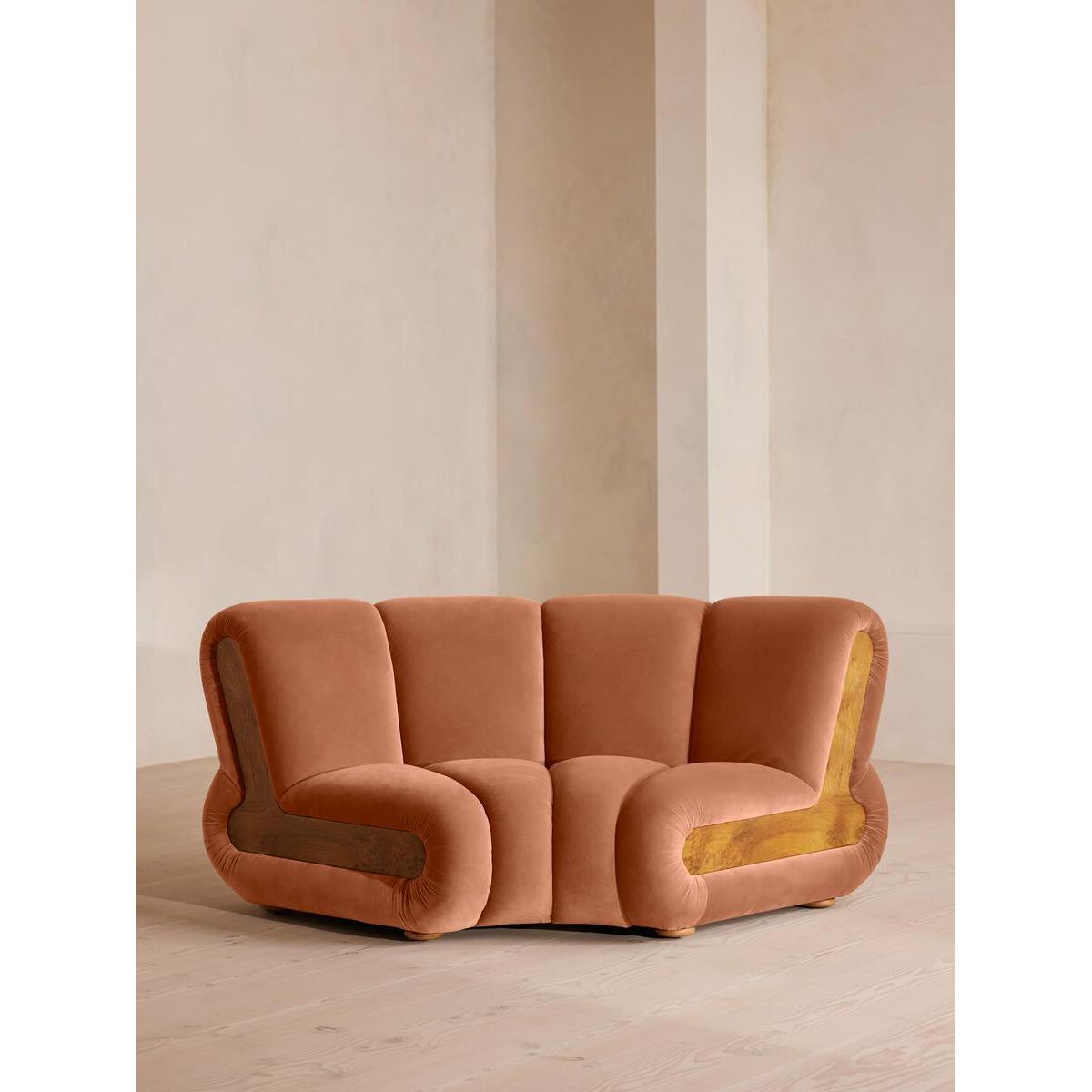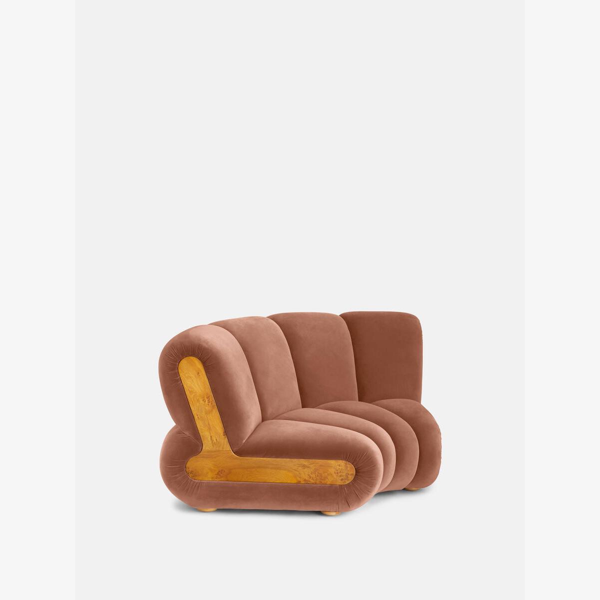 Designed to adapt to any living space, the Noelle modular sofa comprises of straight and curved modules to create the shape you desire, or alternatively a generous armchair if used alone. Rich velvet upholstery is complemented with aged Pippy Oak veneer sides that have a burl finish, while its statement curved shape takes its design cues from the 1970s interiors of 180 House. Armchair Cotton velvet upholstery Aged Pippy Oak veneer Burl finish Inspired by 180 House