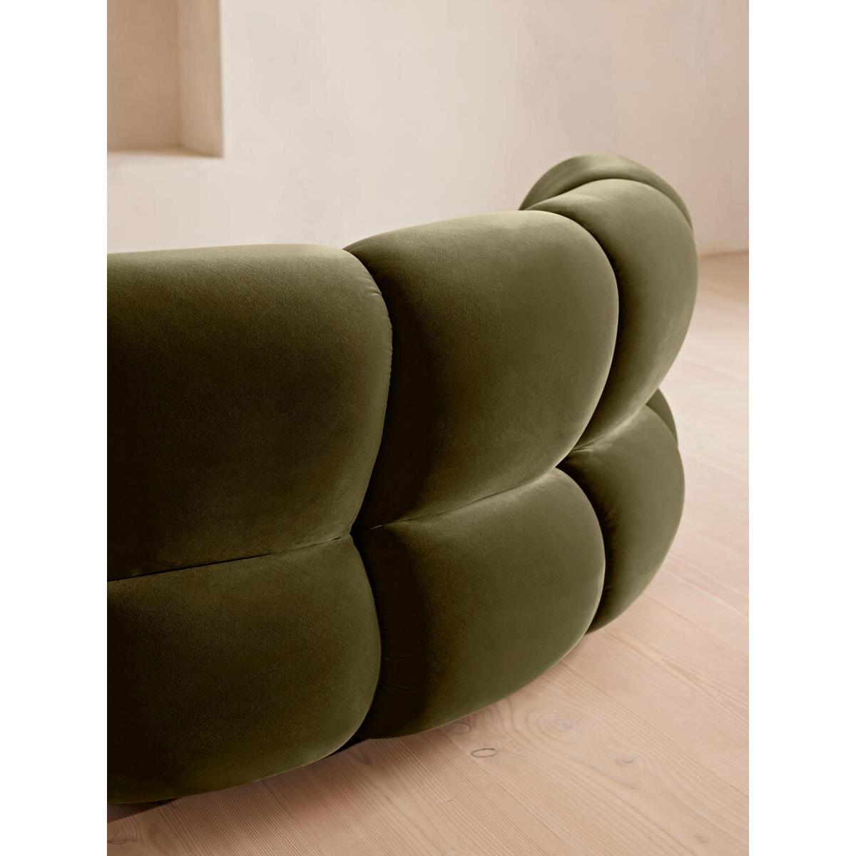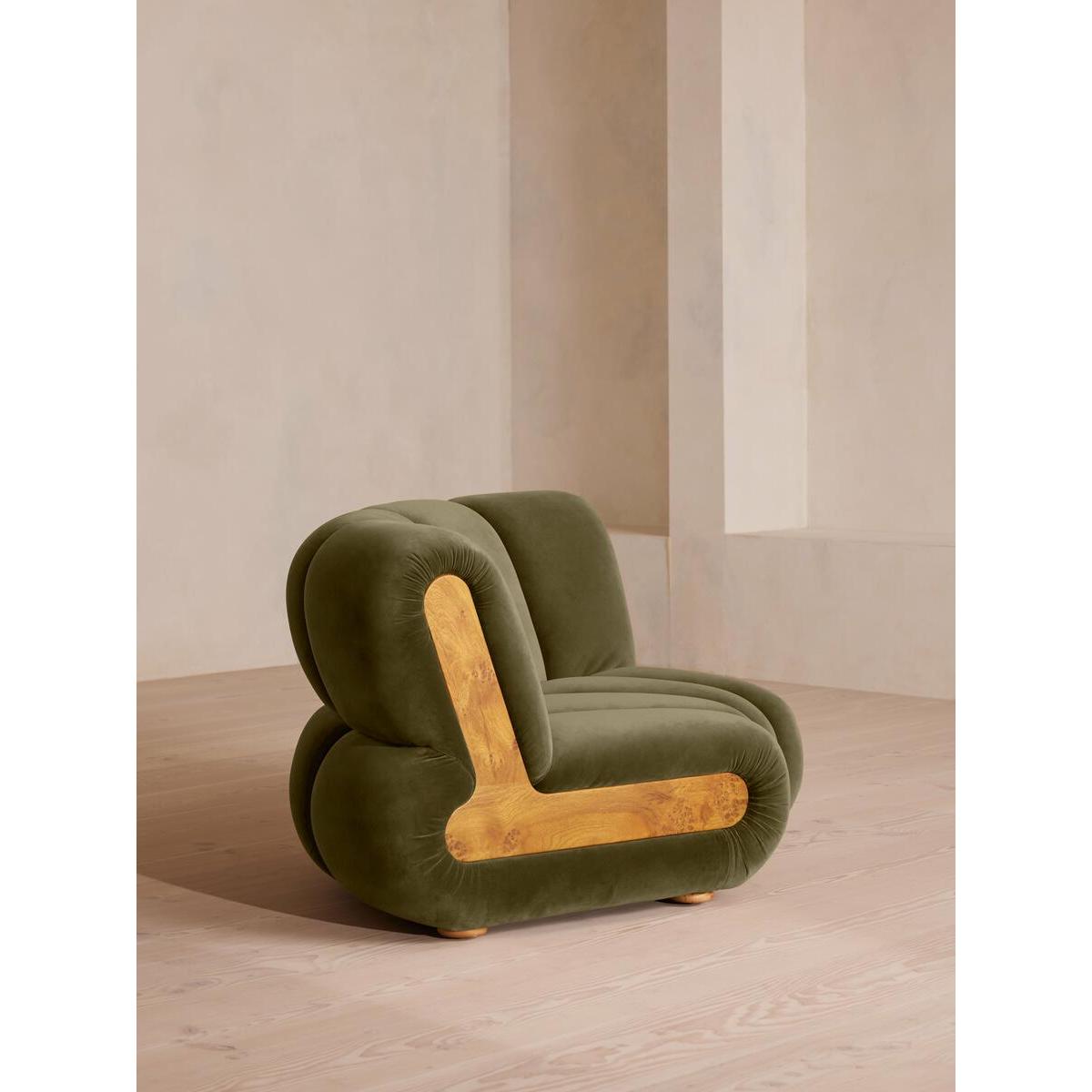 I’m a big fan of this curved olive-velvet armchair - its chunky lines and rich colour give instant warmth without overwhelming a space. It’s especially at home in mid-century modern or contemporary schemes, but can also add depth to a minimalist setting. For styling, place it beside a timber or brass-legged side table and layer a neutral jute or low-pile rug beneath to balance the deep tone. A slim floor lamp or sculptural plant stand alongside will highlight its shape, while a soft sheepskin draped over one side brings both contrast and extra comfort.