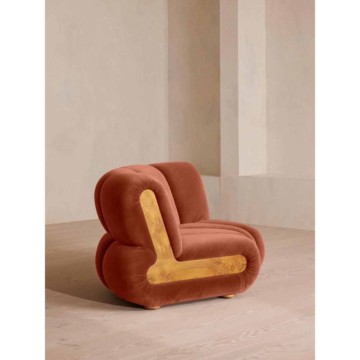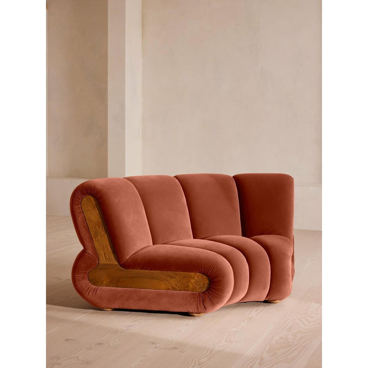 Designed to adapt to any living space, the Noelle modular sofa comprises of straight and curved modules to create the shape you desire, or alternatively a generous armchair if used alone. Rich velvet upholstery is complemented with aged Pippy Oak veneer sides that have a burl finish, while its statement curved shape takes its design cues from the 1970s interiors of 180 House. Curved armchair Cotton velvet upholstery Aged Pippy Oak veneer Burl finish Inspired by 180 House