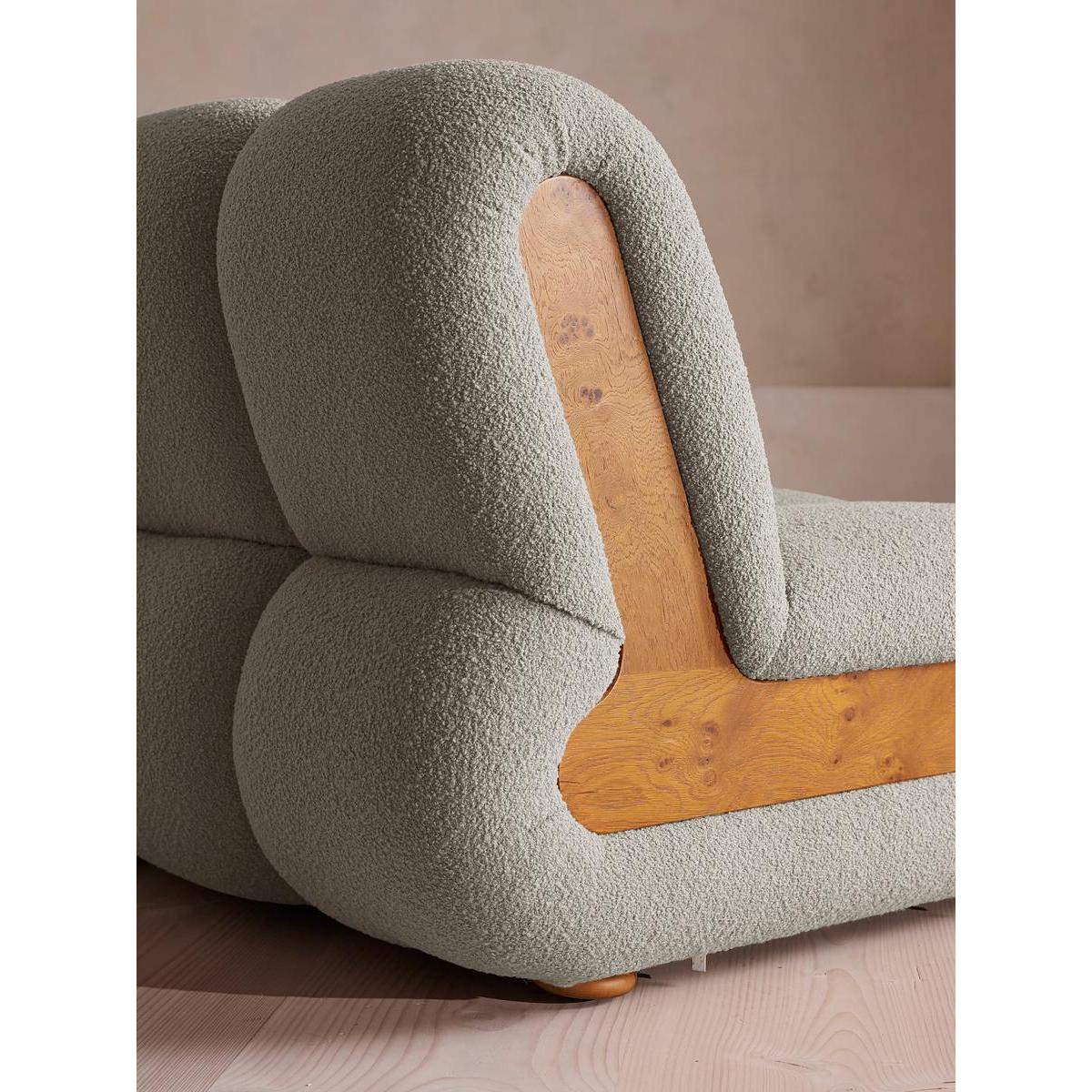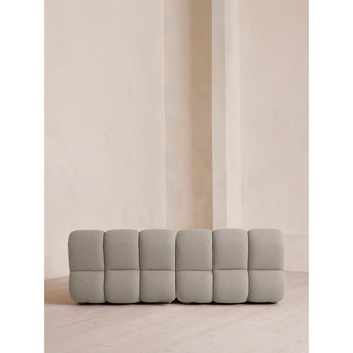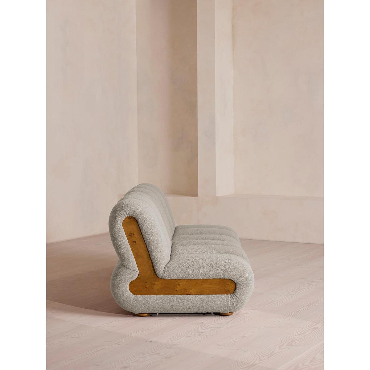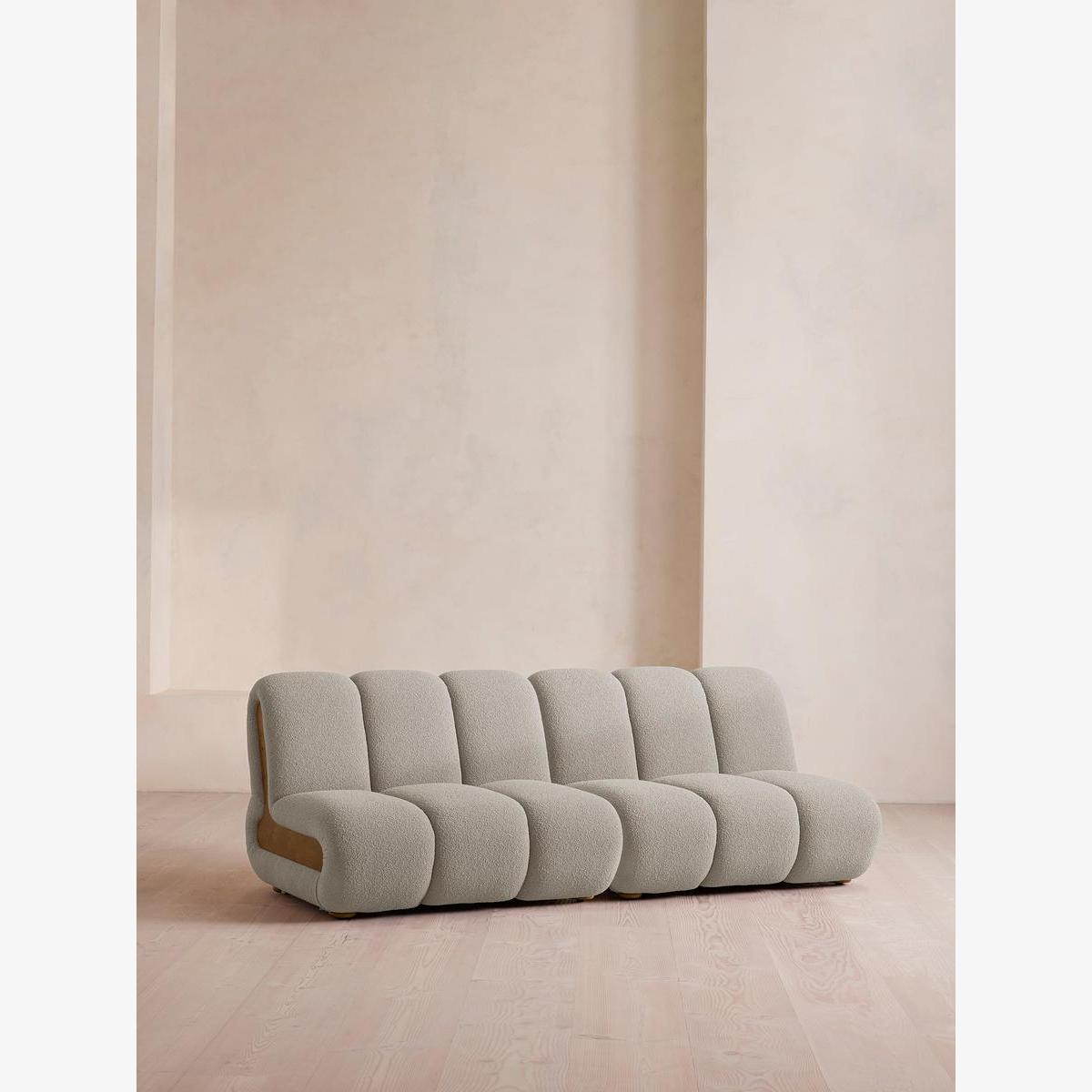 Fully upholstered in boucle with Pippy Oak sides, the modular design of this statement sofa is made to adapt to any living space. Designed to integrate into your living area or social space, the four-seater Noelle sofa includes two curved armchair module units that let you create the shape you desire. Taking design cues from the interiors of 180 House, its comfortable silhouette is complemented by aged Pippy Oak sides with a burl finish.