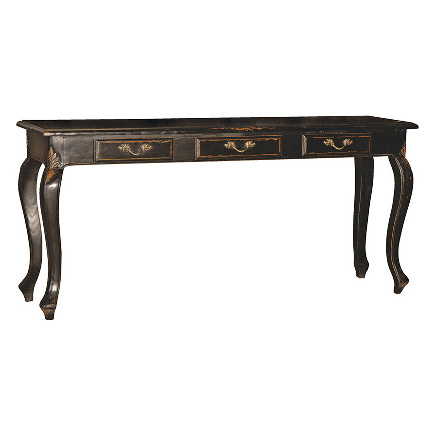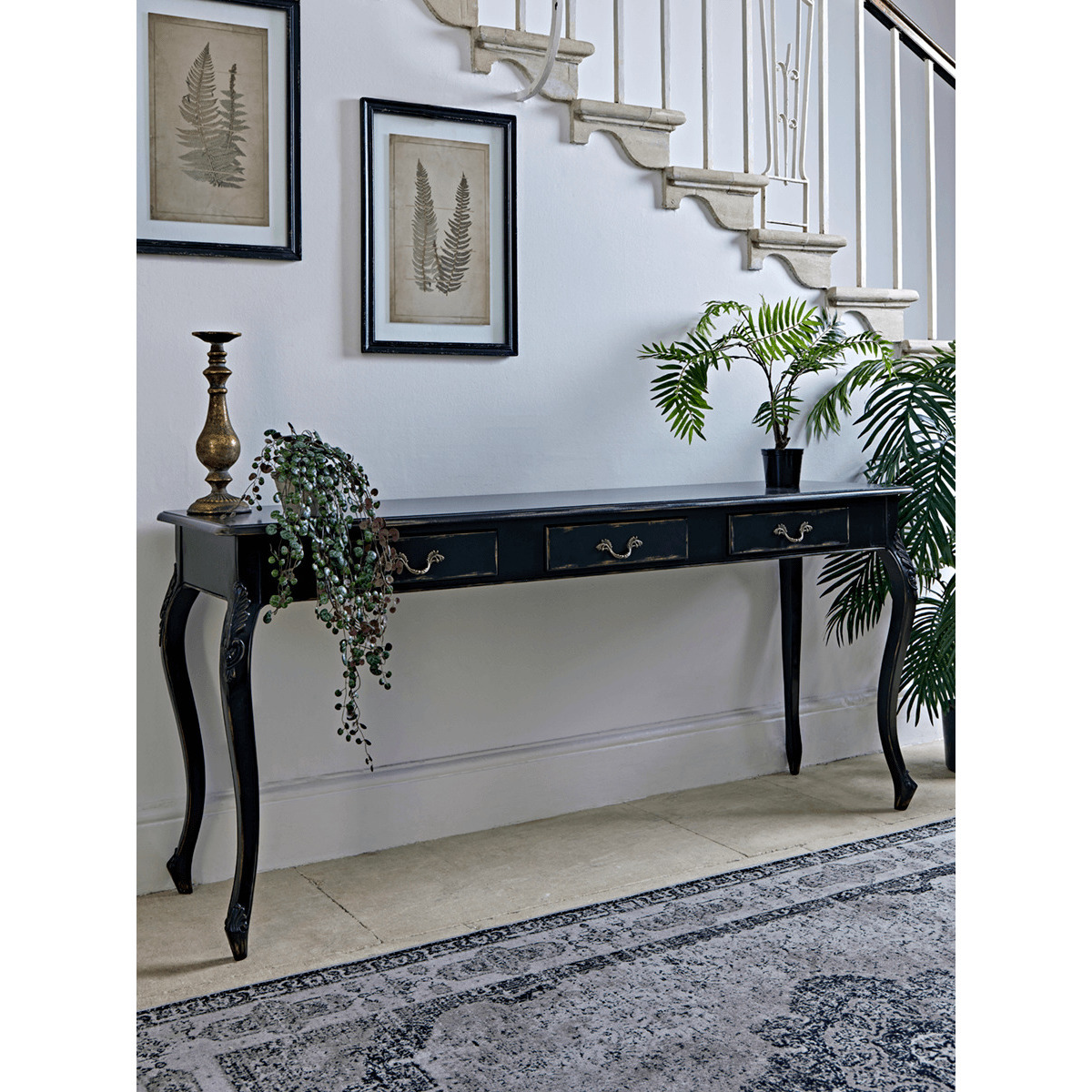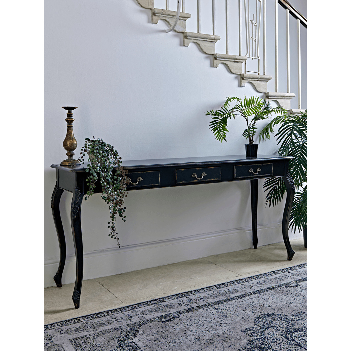 A fabulous, opulent piece for any living space, our large, slender console table is crafted from solid mahogany wood for a nod to Victoriana chic. Each table features three drawers to provide a handy storage solution, with elegant, carved legs and a flat top.
