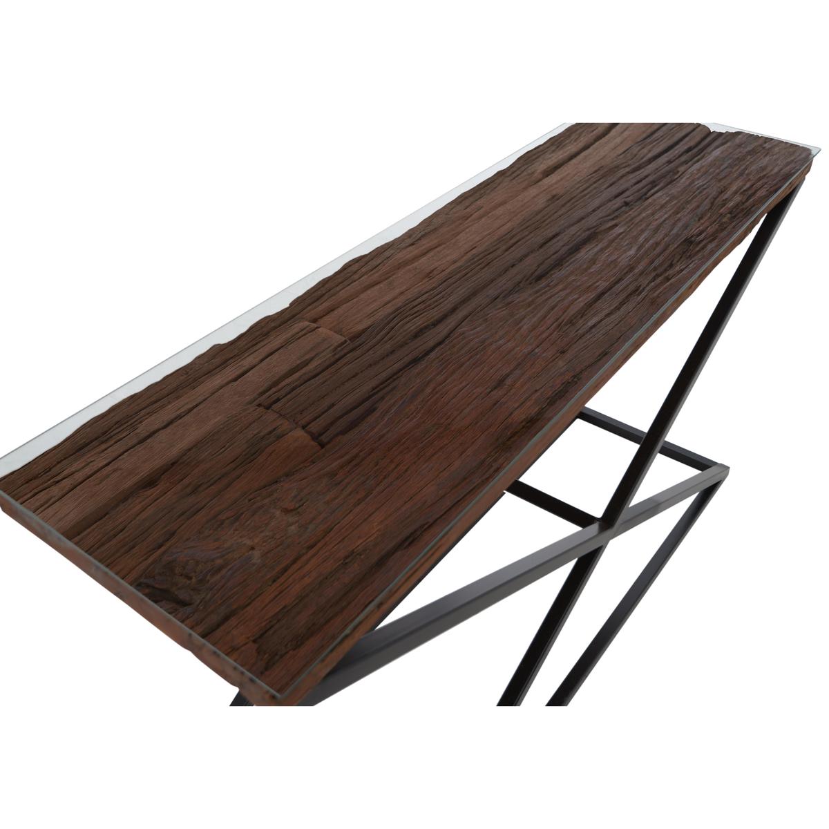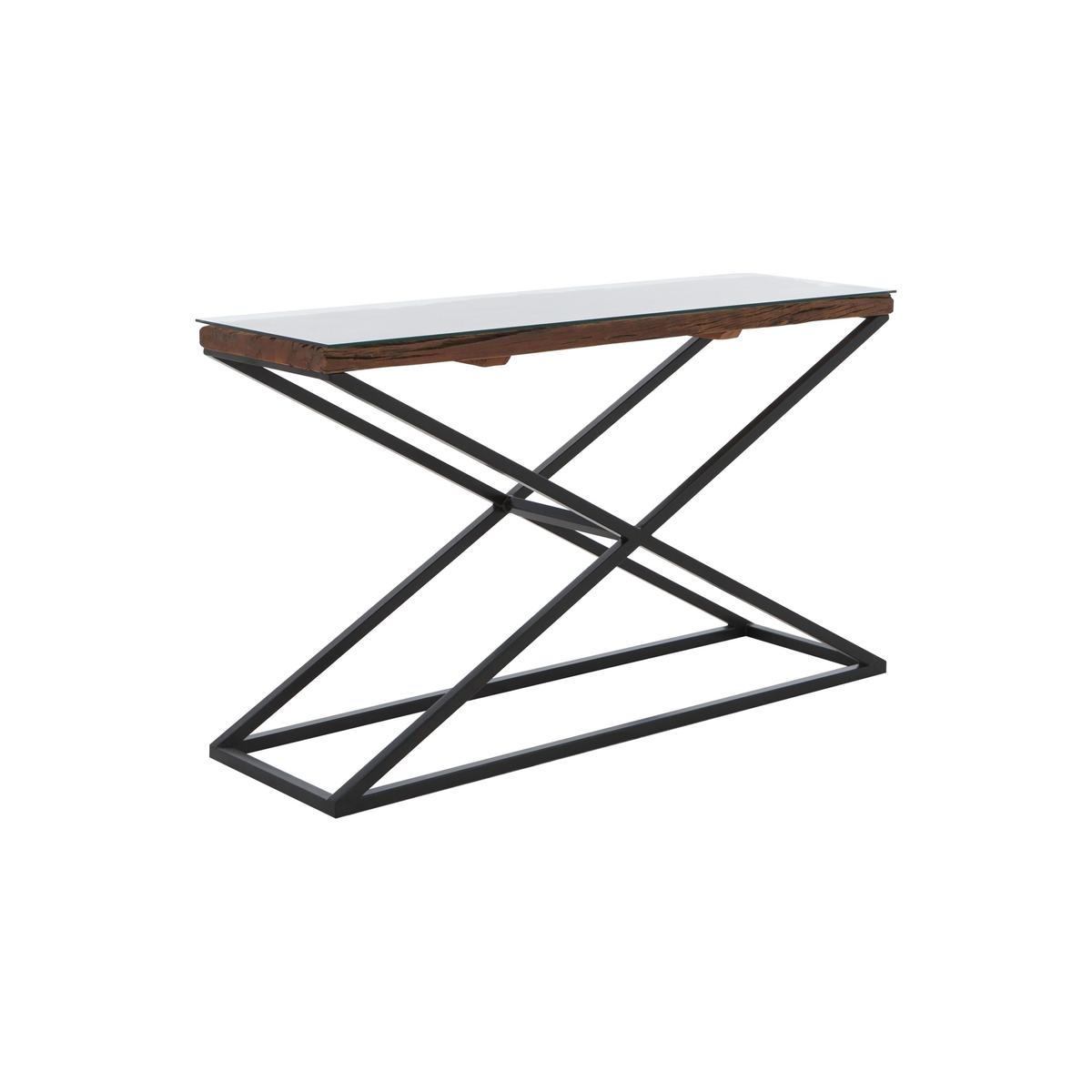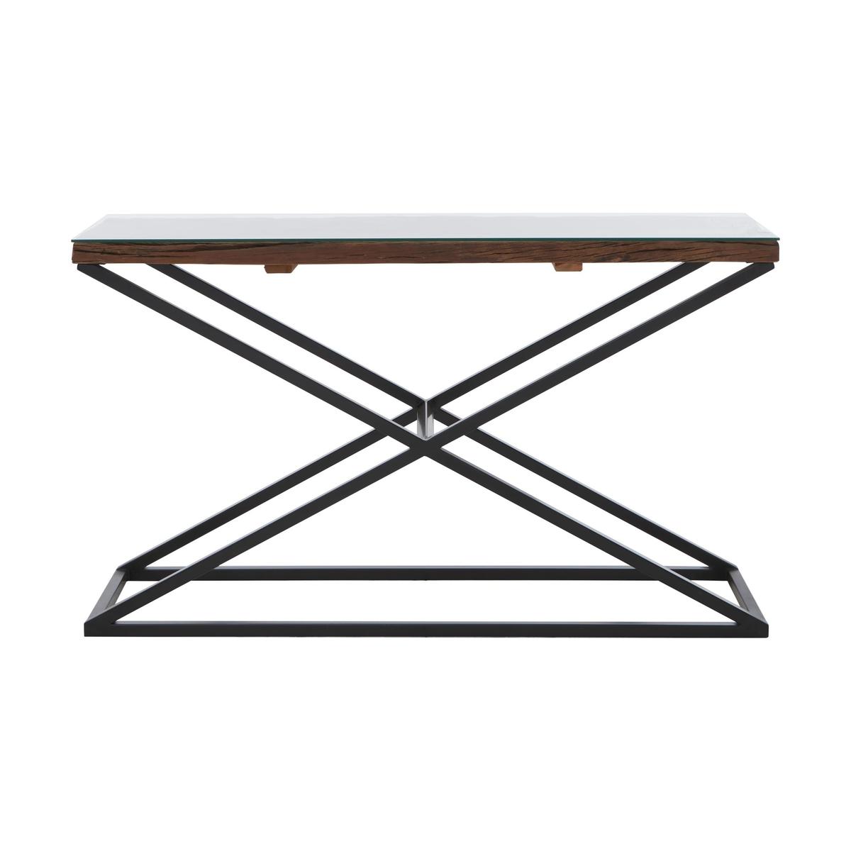 You’ll easily find a place for this lovely console table. Crafted from genuine vintage railway sleepers and with a glass top and black iron base, it’s both stylish and useful. Why you'll love it Make an entrance in your hallway with this characterful console table. Authentic industrial style in rustic wood and iron. Table top is made of reclaimed vintage railway sleepers from India. A thick glass top protects and enhances the wood. Iron base with a matt black finish. This console table is part of our Noir range. What you need to know 10 mm tempered glass. The glass top may overhang the table top by up to 1. 5 cm. There may be significant gaps between the wood surface and glass top. Each plank of reclaimed wood has unique grain, knots and markings and colour variations. This reclaimed wood has an irregular distressed surface and a natural untreated finish. Take care when moving the tempered glass top. As a result of the polishing process, the glass may show surface scratches under direct light. We recommend using coasters and placemats at all times.