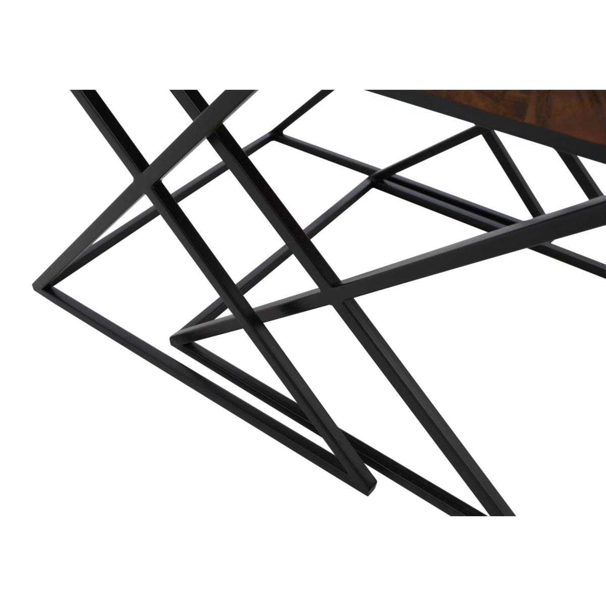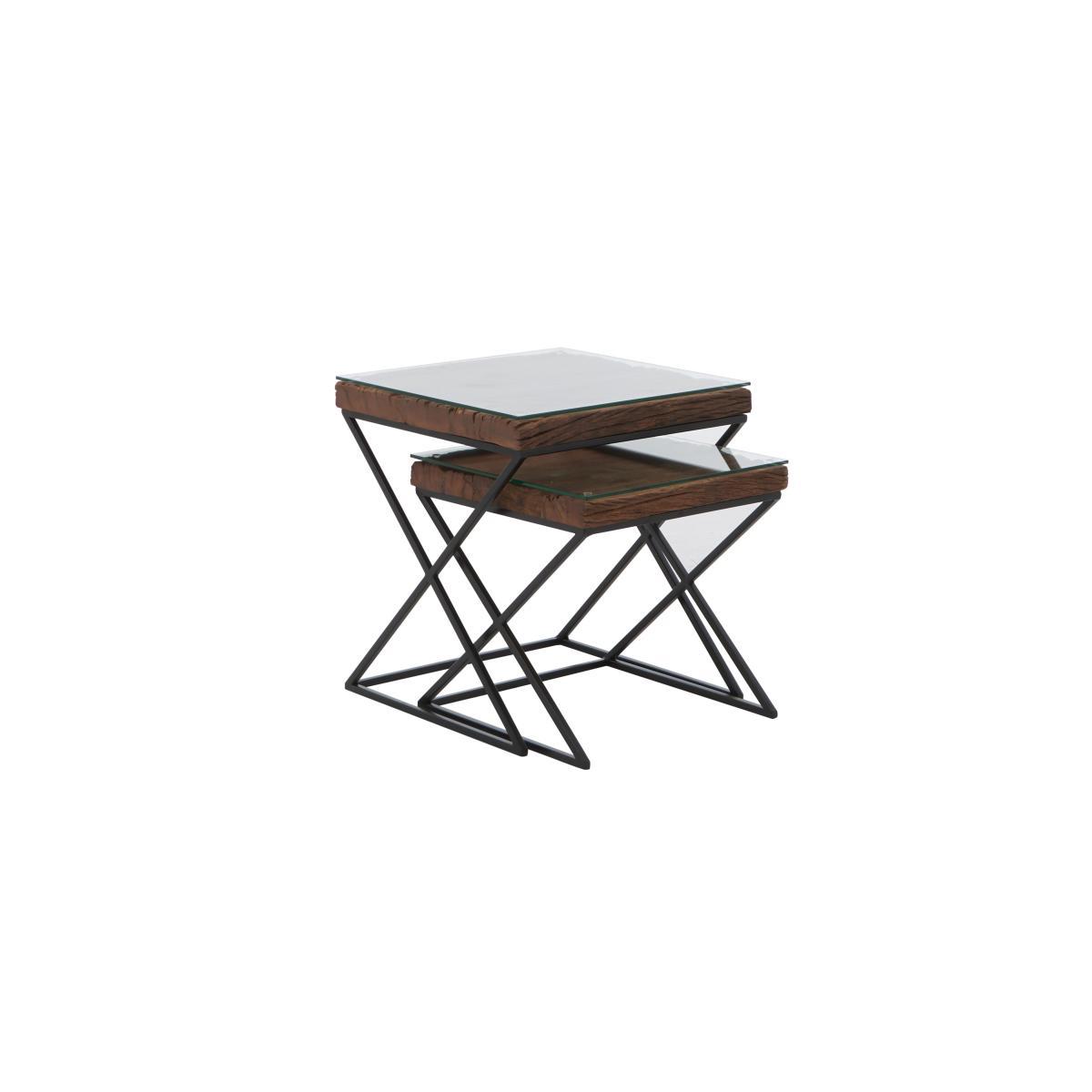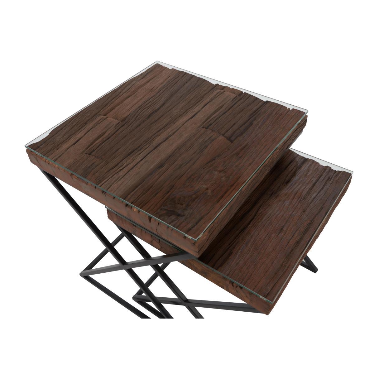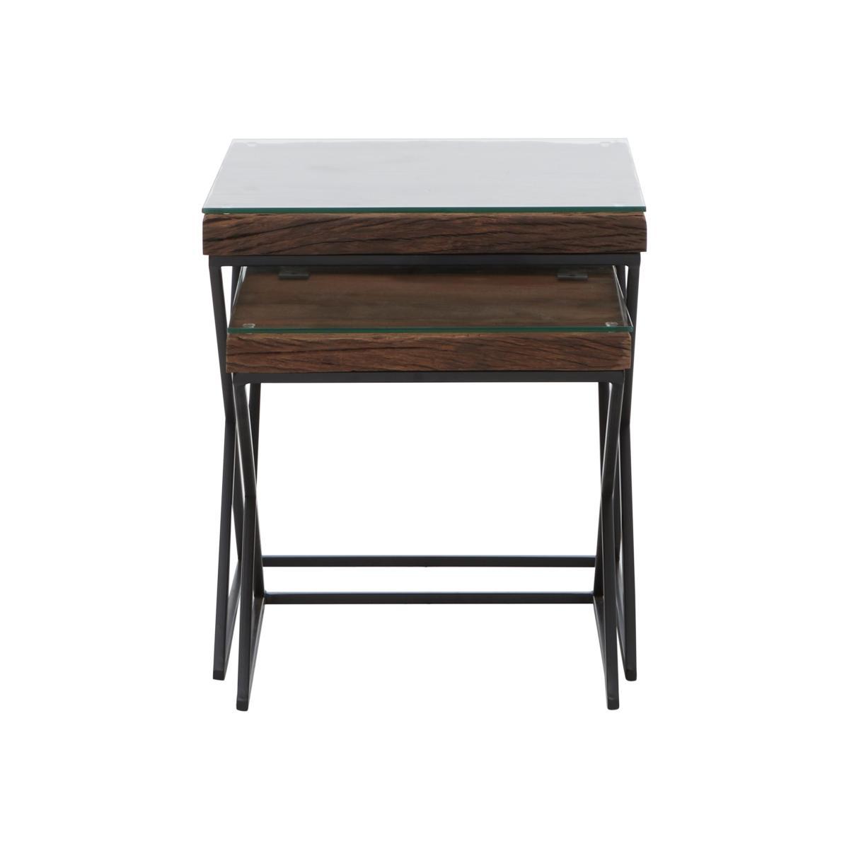 Combining on trend industrial design with charming reclaimed wood, the Noir collection of one-of-a-kind living room and dining room furniture offers a wide range of pieces for the stylish home. Crafted in India, Noir’s impressive dining tables and wide choice of practical occasional tables feature tops made from authentic vintage railway sleepers, rustic and wonderfully grained, covered with glass for a practical finish. Bases are made from sturdy black iron. The range also includes shelving and storage pieces to display and store media equipment, books and dinnerware. Distinctive, original and hardwearing, the Noir collection strikes the perfect balance between traditional craftsmanship and contemporary flair. Authentic industrial style. Crafted from reclaimed wood and black iron. Practical and stylish glass top. The Noir nest of tables easily meets your need for practical occasional tables – and your desire to bring home on trend industrial style. This stylish and versatile set incorporates two square tables which are beautifully crafted from vintage railway sleepers, a fact that guarantees that each table is entirely unique. Tables are set on X-shaped black iron bases and the practical glass tops make them the perfect surface for drinks or trays of nibbles at your next social occasions. They're also an excellent choice for a room where space is at a premium as you can simply nest them together after guests have gone home. Or, if you have a little more room, use them individually as end tables at your sofa arms. The Noir collection of living and dining room furniture features a wide choice of occasional tables as well a fabulous dining table which is available in two sizes seating either six or eight. A contemporary shelving unit, sideboard and media cabinet complete this fabulous industrial collection. Made in India. Please note. The rustic planks of wood used in the Noir collection are vintage railway sleepers sourced from India. Each plank has an irregular distressed surface and a natural untreated finish with unique variations in colour. Glass table tops may overhang by up to 1.5 cm, and there may be significant gaps between wood surfaces and glass tops.