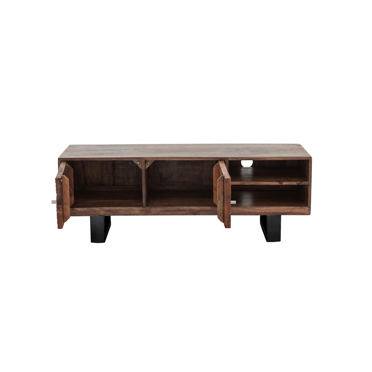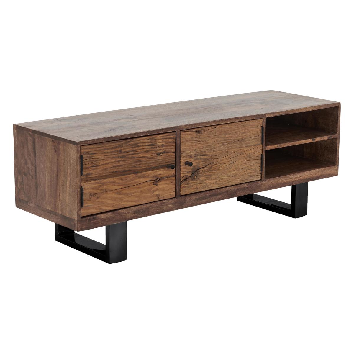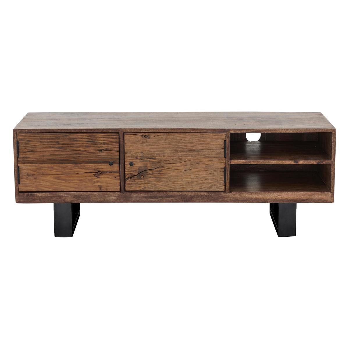 With a cupboard and an alcove for media components, this TV unit has plenty of storage space alongside a very characterful industrial look. Why you'll love it Spacious TV unit has plenty of storage and plenty of character. Authentic industrial style in rustic wood and iron. Made with reclaimed vintage railway sleepers from India. Front has striking planked effect. U- shaped black iron legs. Alcove has cable holes at the back. This TV unit is part of our Noir range. What you need to know Made of reclaimed railway sleepers and mango wood. Each plank of reclaimed wood has unique grain, knots and markings and colour variations. This reclaimed wood has an irregular distressed surface and a natural untreated finish. We recommend using coasters and placemats at all times.
