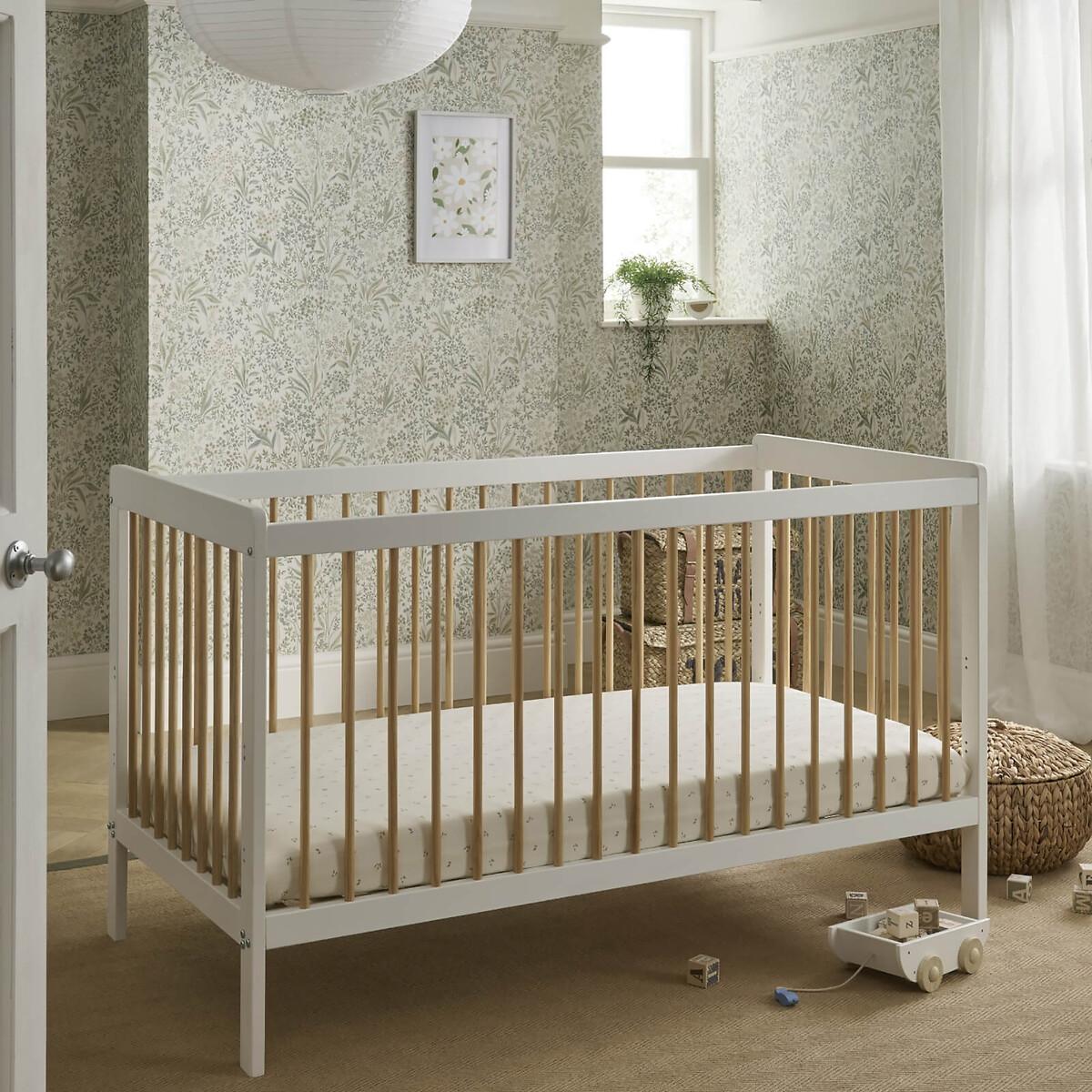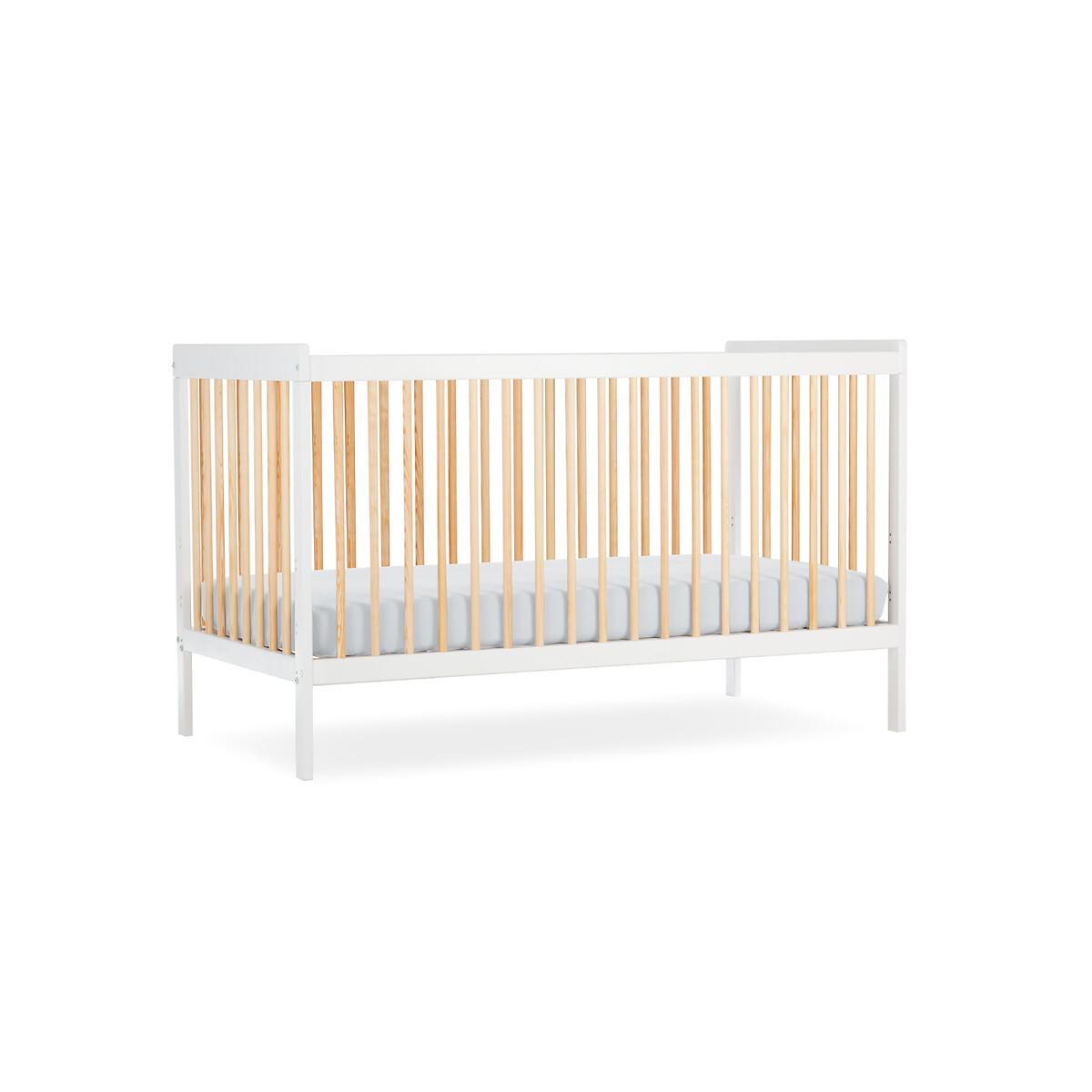 The Nola White and Natural Cot Bed is a stylish staple for any nursery. Crafted from quality pine wood, this white cot bed boasts a contrasting two-tone design with intricate pine detailing. Featuring a neutral colour palette, Nola's stylish yet understated design is guaranteed to blend in seamlessly with any nursery interior or theme. With three adjustable mattress base positions, this versatile cot bed is suitable for infants from birth to five years old, ensuring their utmost safety and comfort as they grow and develop. As your little one transitions from baby to toddler, you'll appreciate the convenience of Nola's convertible design, effortlessly converting to a modern day bed that will last for years to come.• Suitable for 0-5 years.• 3 different mattress base positions.• Converts from cot bed to a day bed.• When converted into a day bed this product is recommended for use by one child aged 18 months to 5 years.• Requires a 140 x 70cm cot bed mattress sold separately.• Fully certified and accredited testing to BS EN 716:2017, BS 8509:2008+A1:2011.• 2-year warranty against manufacturing defects. The warranty period is effective from the day of purchase.• Self-Assembly required.• Never use furniture polish to clean the furniture. Use a duster or damp cloth to remove stubborn stains. Always dry afterwards. Packaged Dimensions:148x82x15cm, Packaged Weight: 19kg. Product Dimensions:145x 75x 87cm16kg100% pine wood. One Size. Please note: this product cannot be delivered to Northern Ireland. This product will be dispatched by one of our trusted suppliers. You’ll be contacted by their selected courier about your delivery. CUDDL01