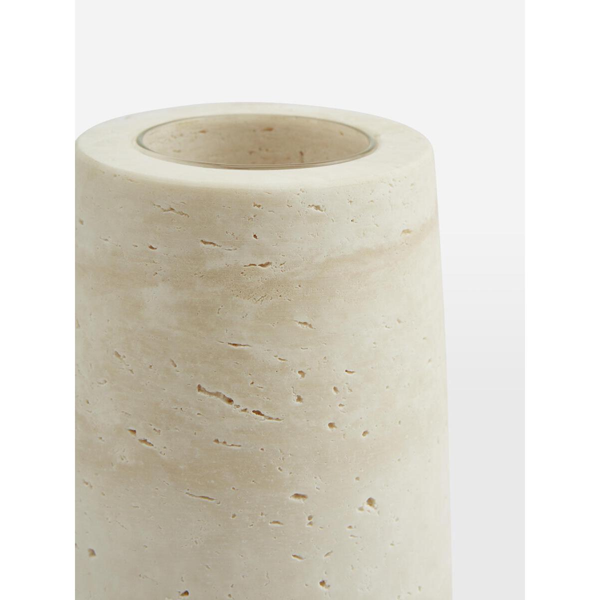 The wide Nola vase is crafted from travertine, a porous naturalstone with distinctive character and imperfections that make eachvase unique. The organic vase is designed with a removable glassliner glass liner to hold water and display flowers. Work it into amantle arrangement to bring the natural and coastal surroundings of. Soho Roc House into your home. Wide travertine vase. Porous natural stone. Each piece is unique. Holds water. Removable glass liner. Inspired by Soho Hoc House.