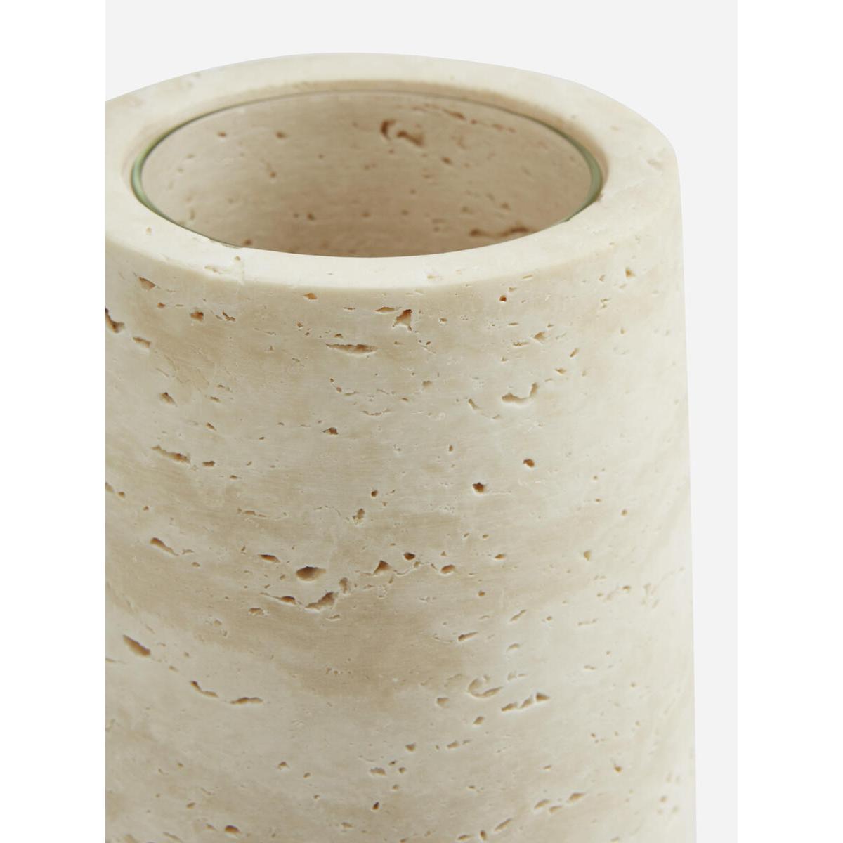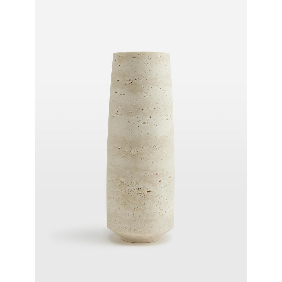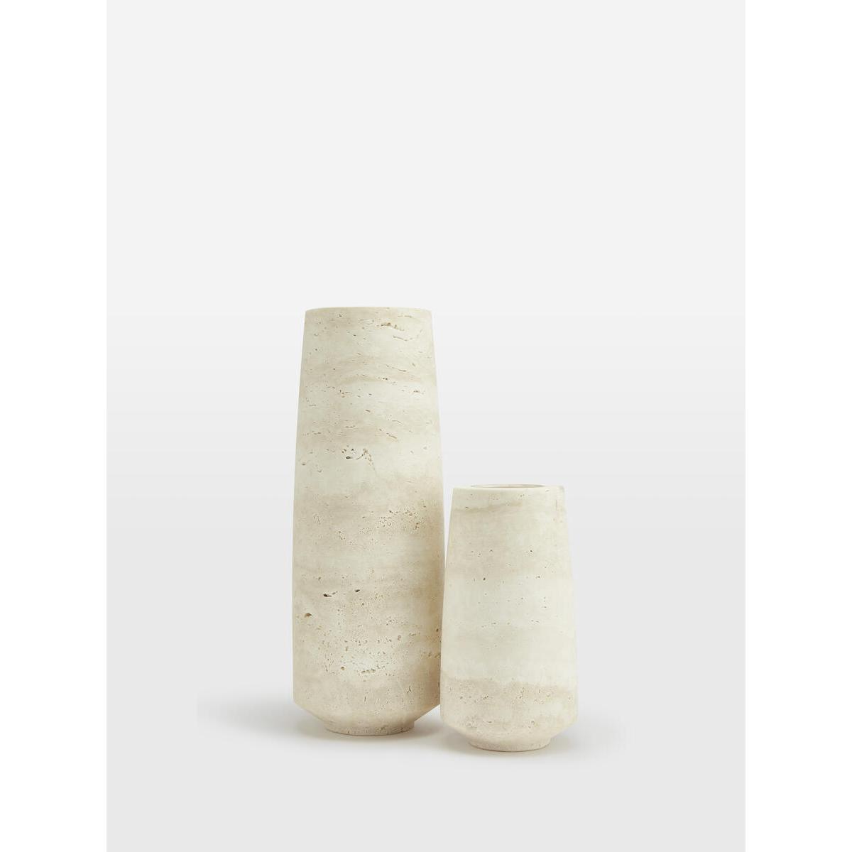 The tall Nola vase is crafted from travertine, a porous naturalstone with distinctive character and imperfections that make eachvase unique. It's designed with a removeable glass liner to holdwater and display flowers. Work it into a mantelpiece arrangementto bring the coastal surroundings of Soho Roc House into yourhome. Tall travertine vase. Porous natural stone. Each piece is unique. Removeable glass liner. Holds water. Inspired by Soho Roc House.
