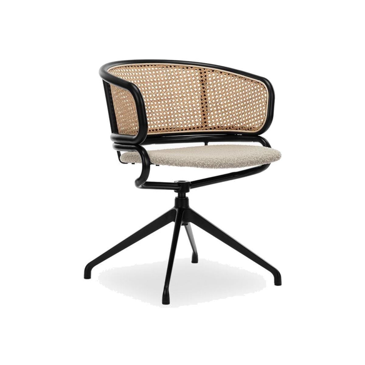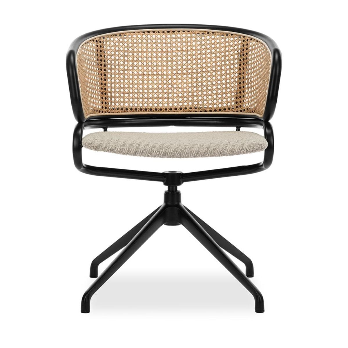 In a classic clamshell design offering comfort as well as style, the Nolan Swivel Office Chair is upholstered in a luxe boucle made from sustainable materials; an environmentally conscious yet contemporary chair for your workstation. The back features a swooping natural cane framed in black metal reaching down towards the four pronged legs. The neutral hues and Nordic design of the Nolan Office Chair adds luxury to WFH.