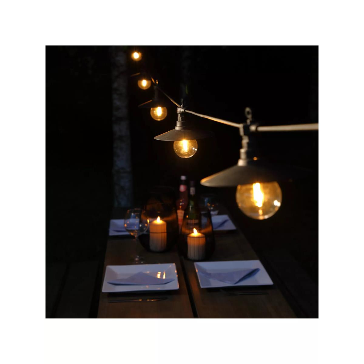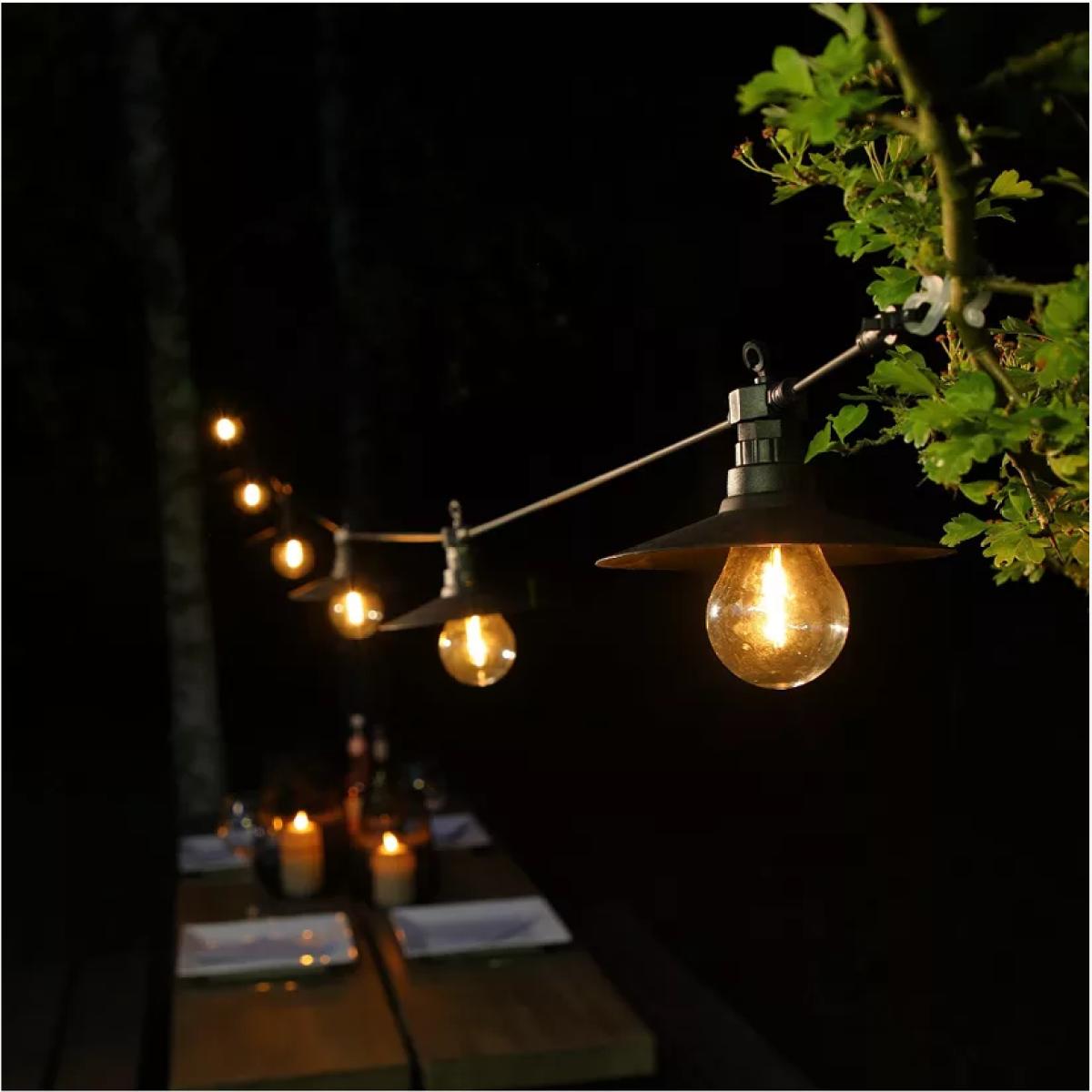 Six stylish, saucer style festoons. Hang over tables, between trees or under pergolas. Battery operated with a timer and finished with a black cable.