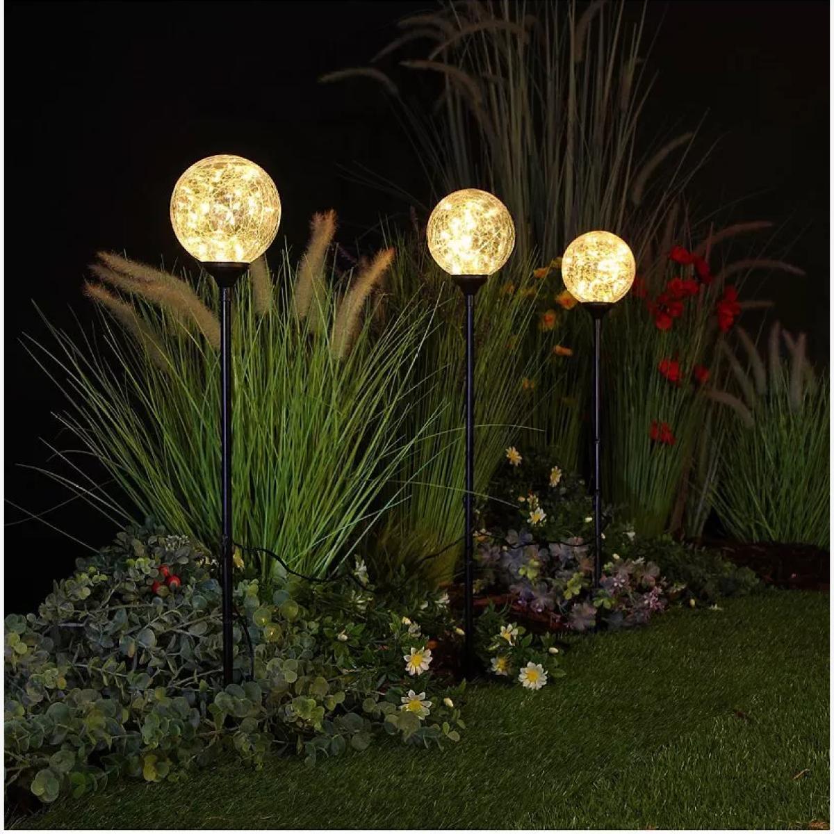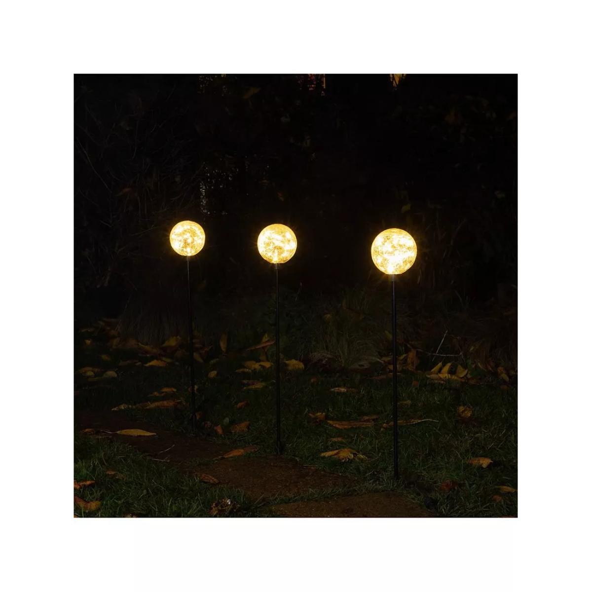 A set of three crackle ball stake lights with warm white LEDs. Connect up to four sets from one power source, ideal for lining pathways and flower beds.