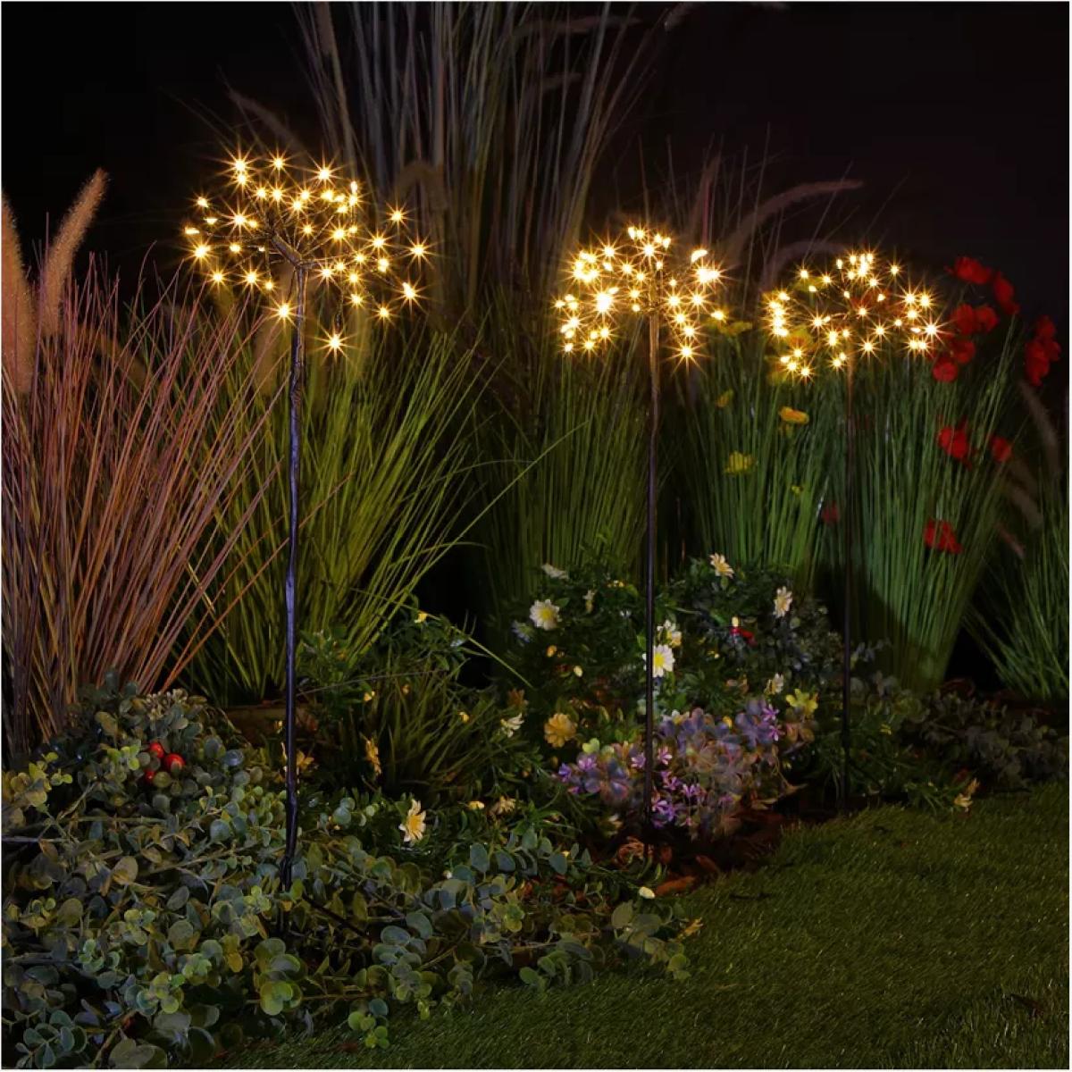 A set of three connectable firework stake lights with 135 warm white LEDs. Connect up to four sets, with 50cm spacing, from one power source. Ideal for lining pathways and flower beds.