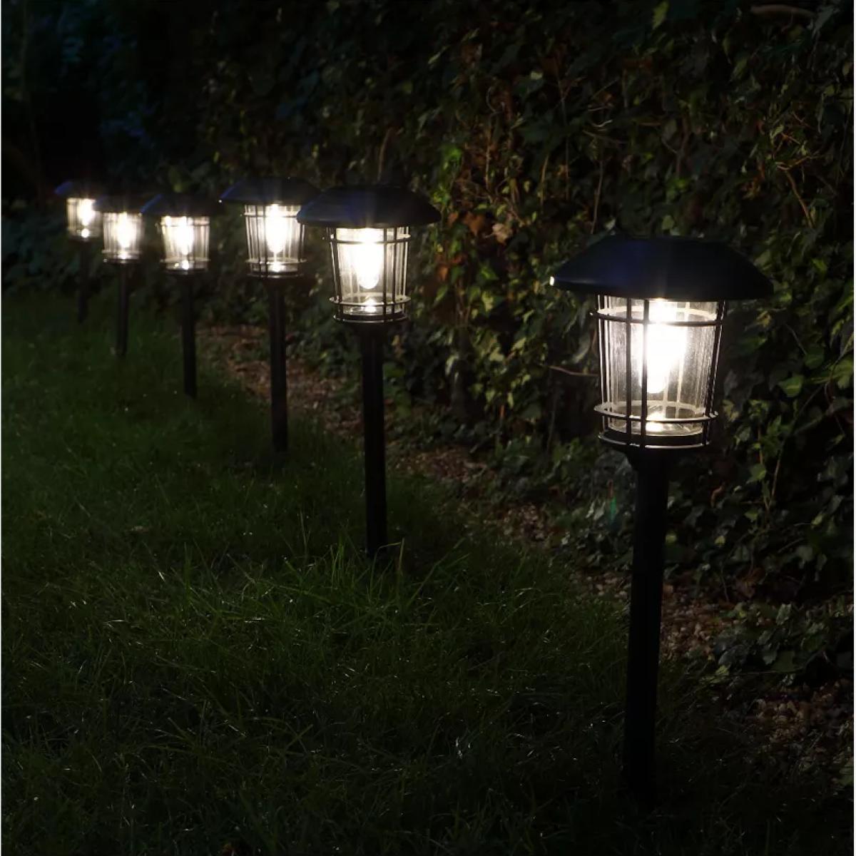 A set of two metal cage outdoor stake lights, with a sturdy design and a bright warm light.