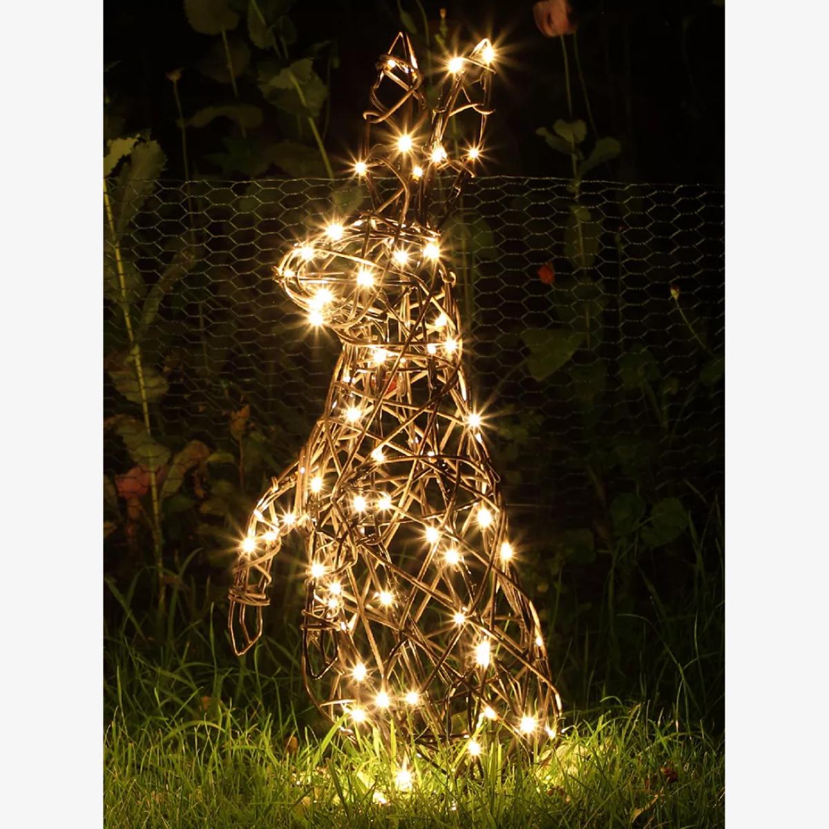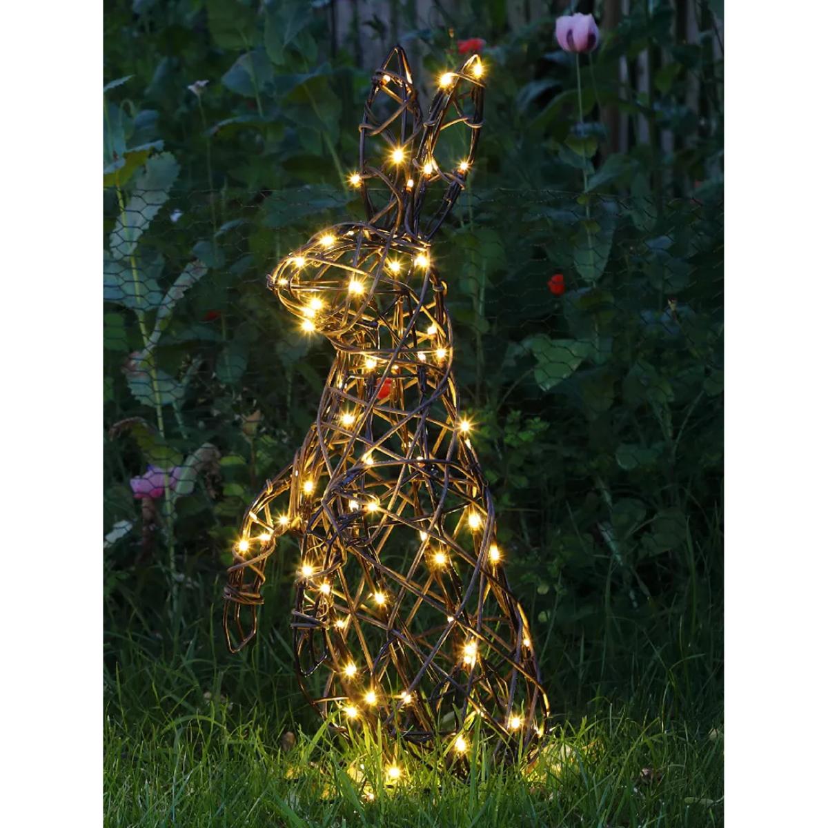 Brown wicker jumping rabbit standing at 58cm tall. This adorable outdoor novelty light features 80 warm white LEDs with Easytimer technology. Ground pegs are included.