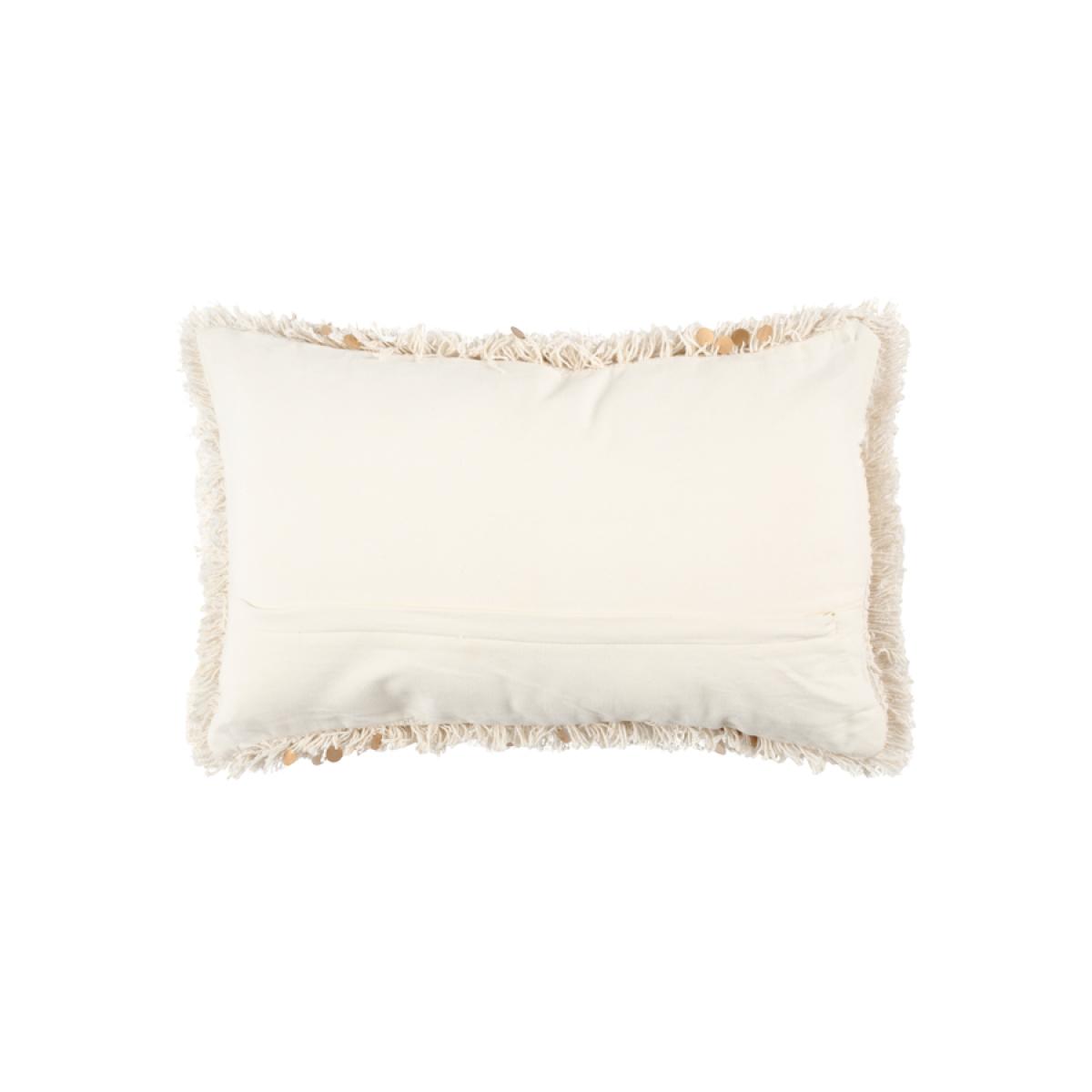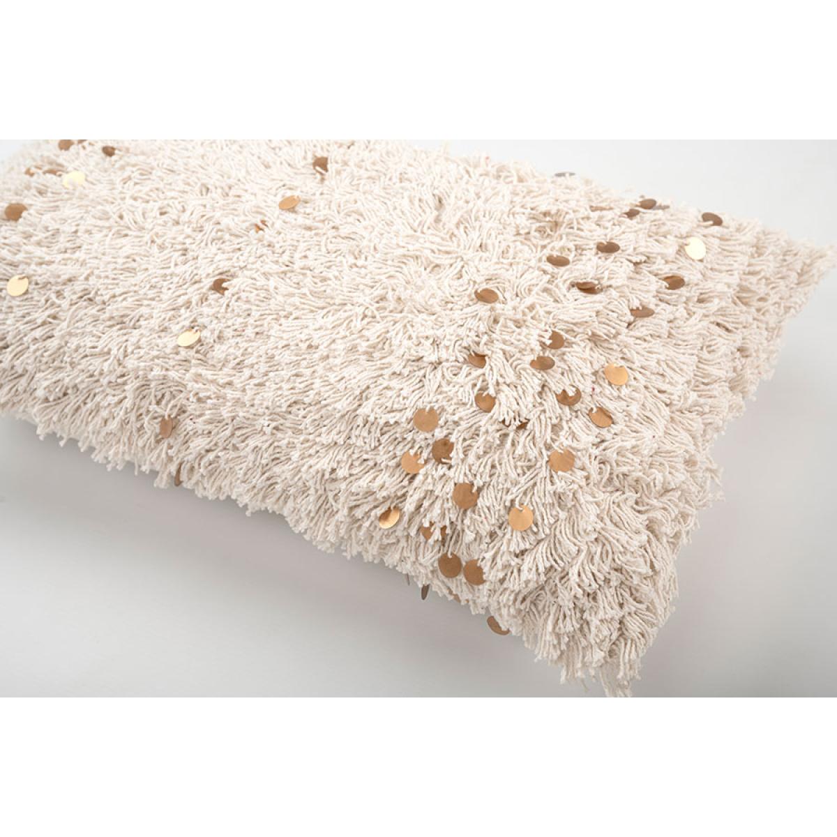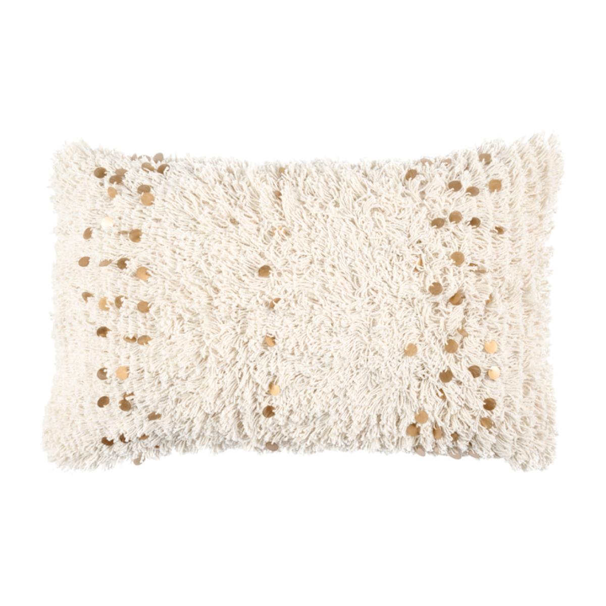 A deeply textured Moroccan style cushion with brass coloured sequin embellishments. 30cm x 50cm. 100% cotton fabric. Supplied complete with hollowfibre pad. Zip fixing. Hand wash only.