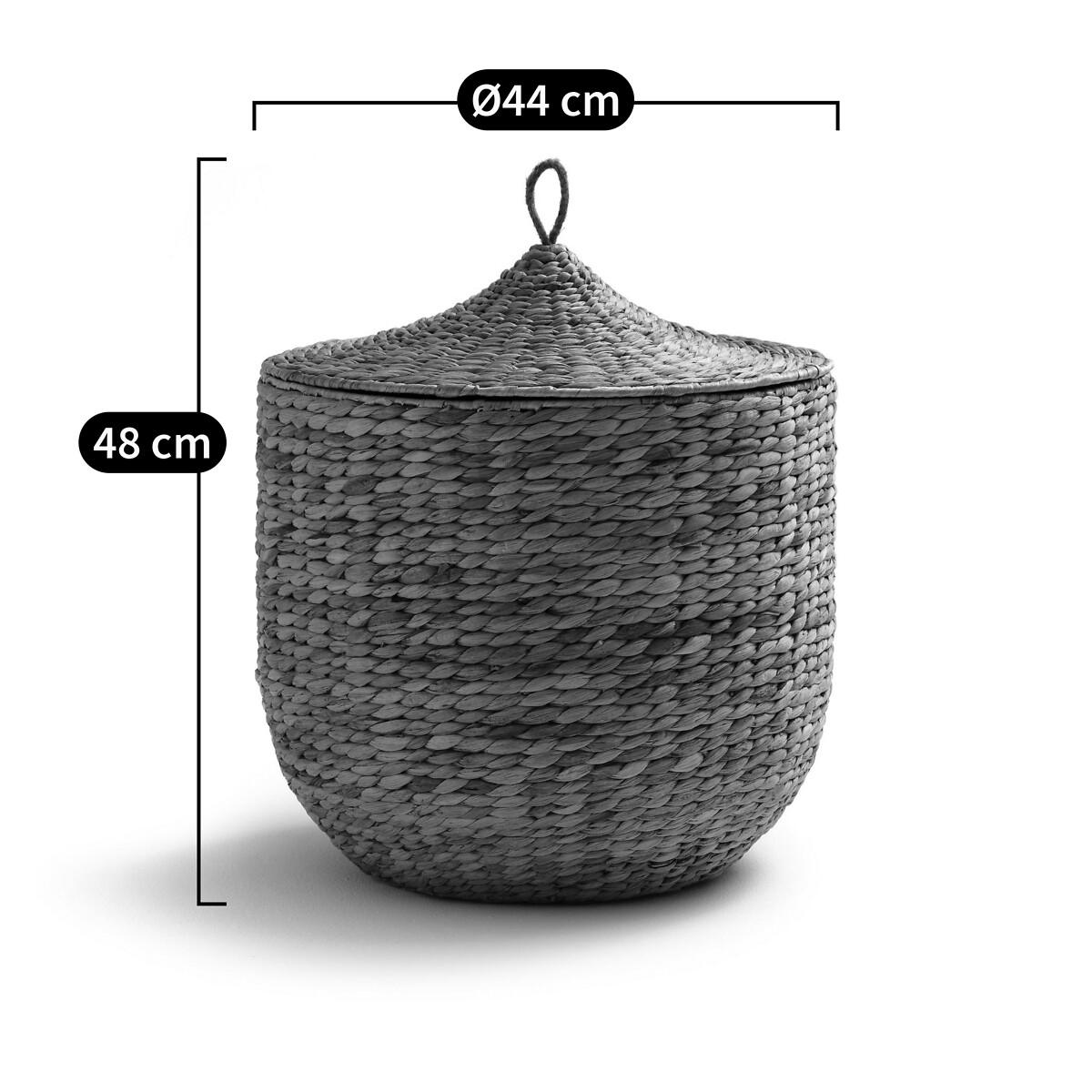 The Nomado woven basket with lid. A beautiful decorative object and a practical storage solution at the same time. Product Details • In braided water hyacinth • Metal frame • With lid. Dimensions • Diameter: 44cm • Height: 48cm