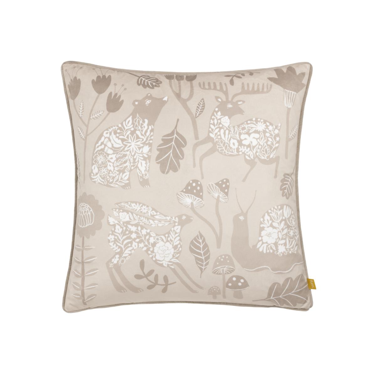 Adorned with Scandi inspired shapes and woodland folklore icons, the Nook cushion sits comfortably in a cosy corner of your living room. The luxuriously soft velvet and the neutral colour palette of greige brings an immediate feeling of warmth to any interior.