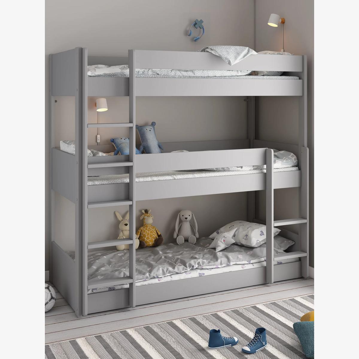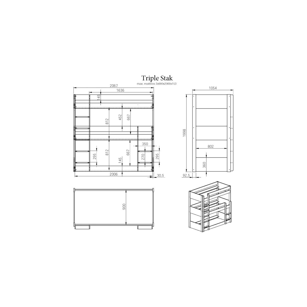 Expertly designed with comfort and sturdiness in mind, this triple stacker bunk bed was made to accommodate a large family. The three stacked beds have a beautifully panelled head and footboard. This bed is compatible with a European single mattress (not included).