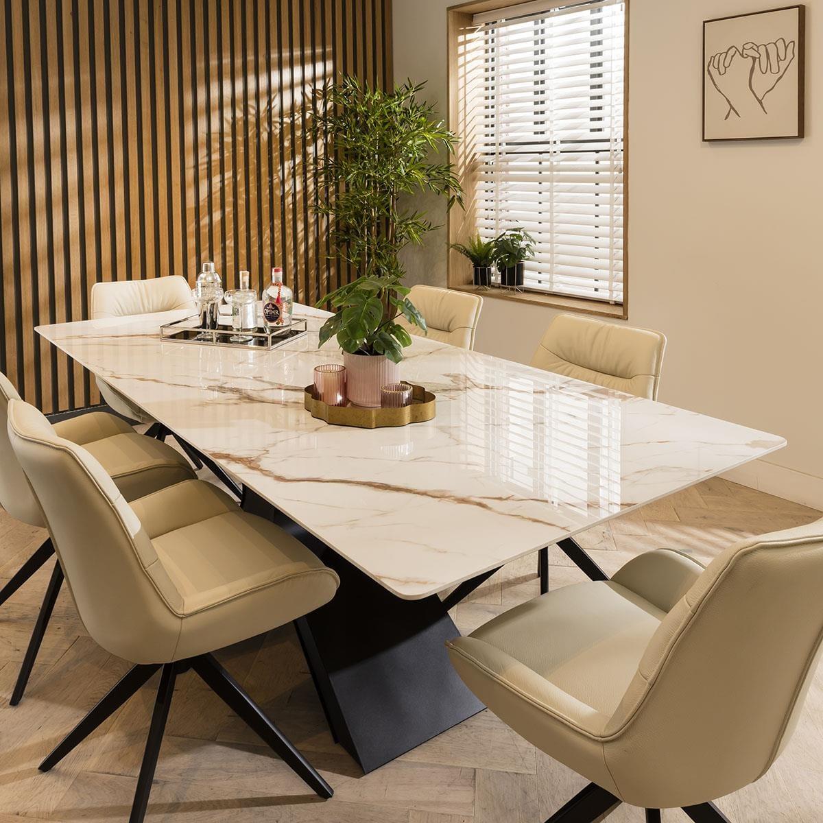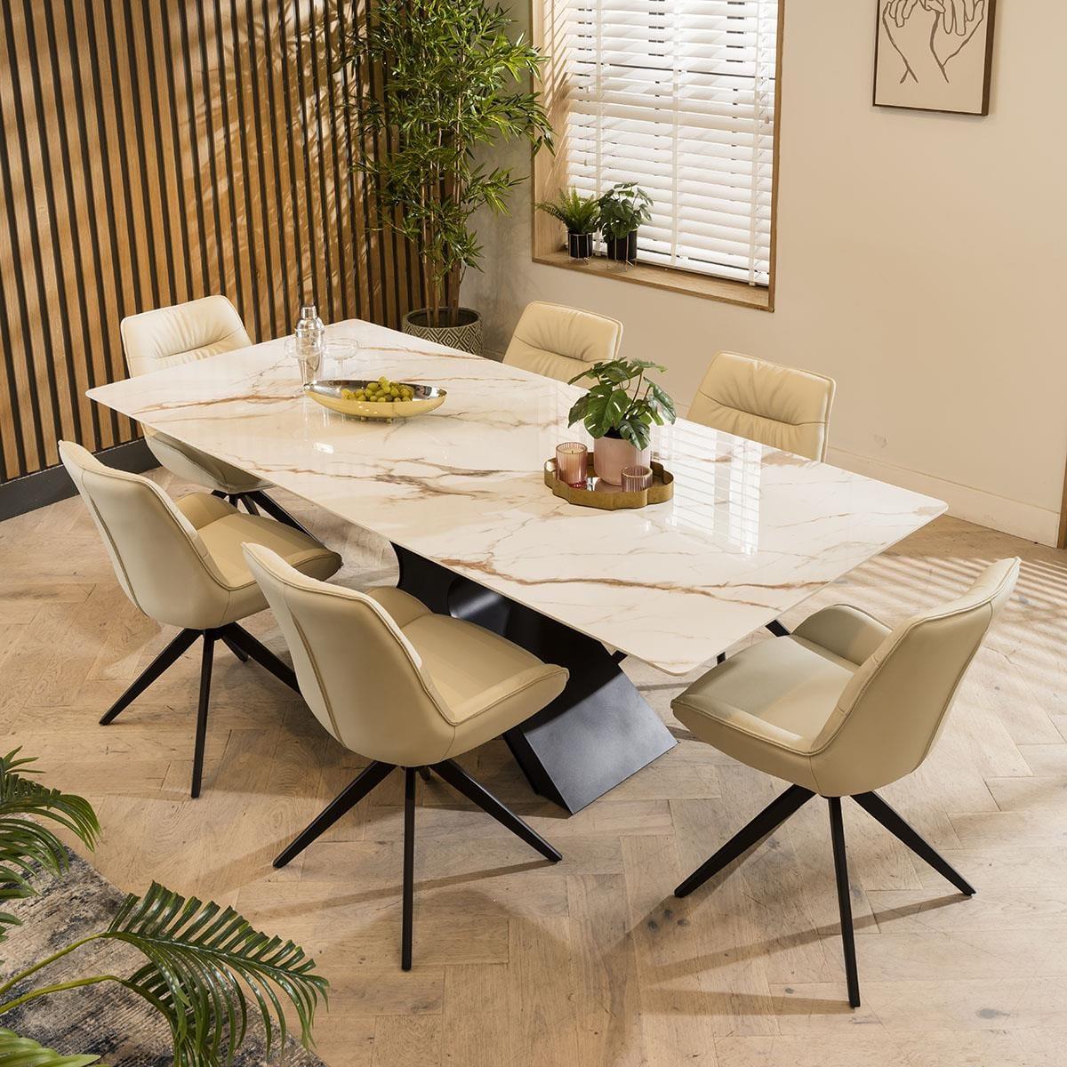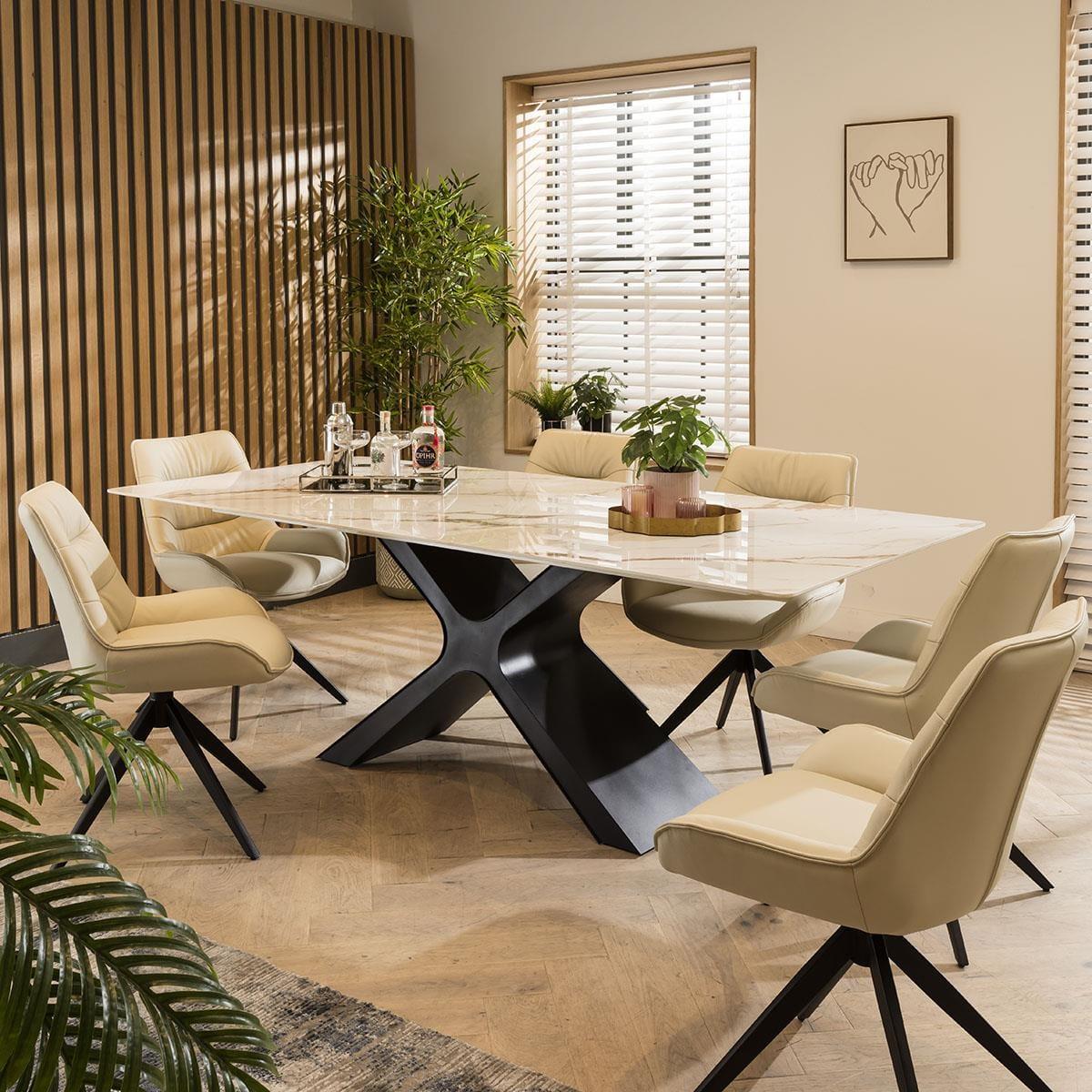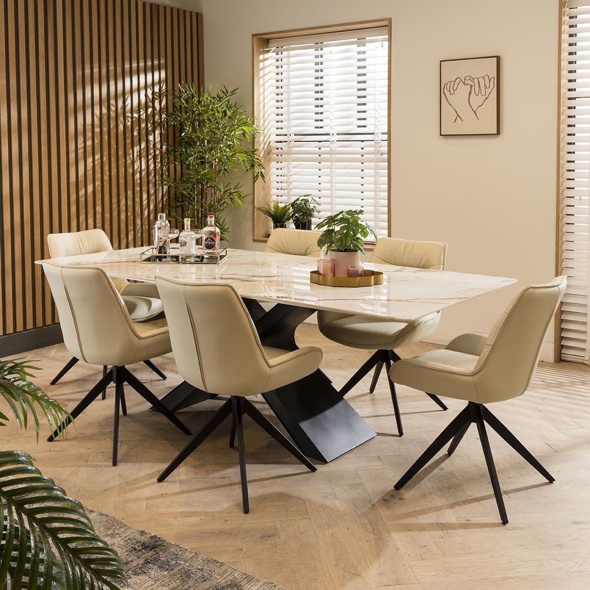 The Nora contemporary large 6 seater dining set combines modern aesthetics with premium functionality. Crafted with meticulous attention to detail, this 6 person set features a white ceramic dining table and elegant genuine cream leather dining room chairs, it's a perfect addition to any modern kitchen or dining room. Crafted with a premium ceramic table top featuring a white marble effect finish, the large ceramic dining table spans 220cm by 100cm, comfortably seating the 6 chairs in this set. The ceramic surface is a testament to its longevity, resistant to scratches, stains, and heat. The X-shaped metal base offers stability and a contemporary touch. Elegance with comfort is effortlessly blended with the Nora leather dining chairs in this set, crafted with genuine cream leather. These cushioned dining room chairs feature a sleek 4-point swivel base that ensures stability and ease of movement, making the chairs a perfect addition to any contemporary kitchen or dining space. This 6 seater dining set is the perfect blend of modern design, premium materials, and spacious seating, making it an excellent choice for those who appreciate both style and comfort. Transform your dining room into an elegant haven where you can create cherished memories with your loved ones, all centered around this exquisite dining set. Table Size W220cm D100cm H75cm Chair Size W58cm D64cm H85cm 6 Seater Dining Set