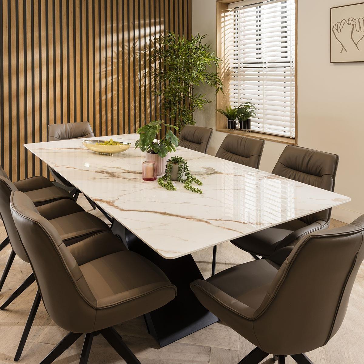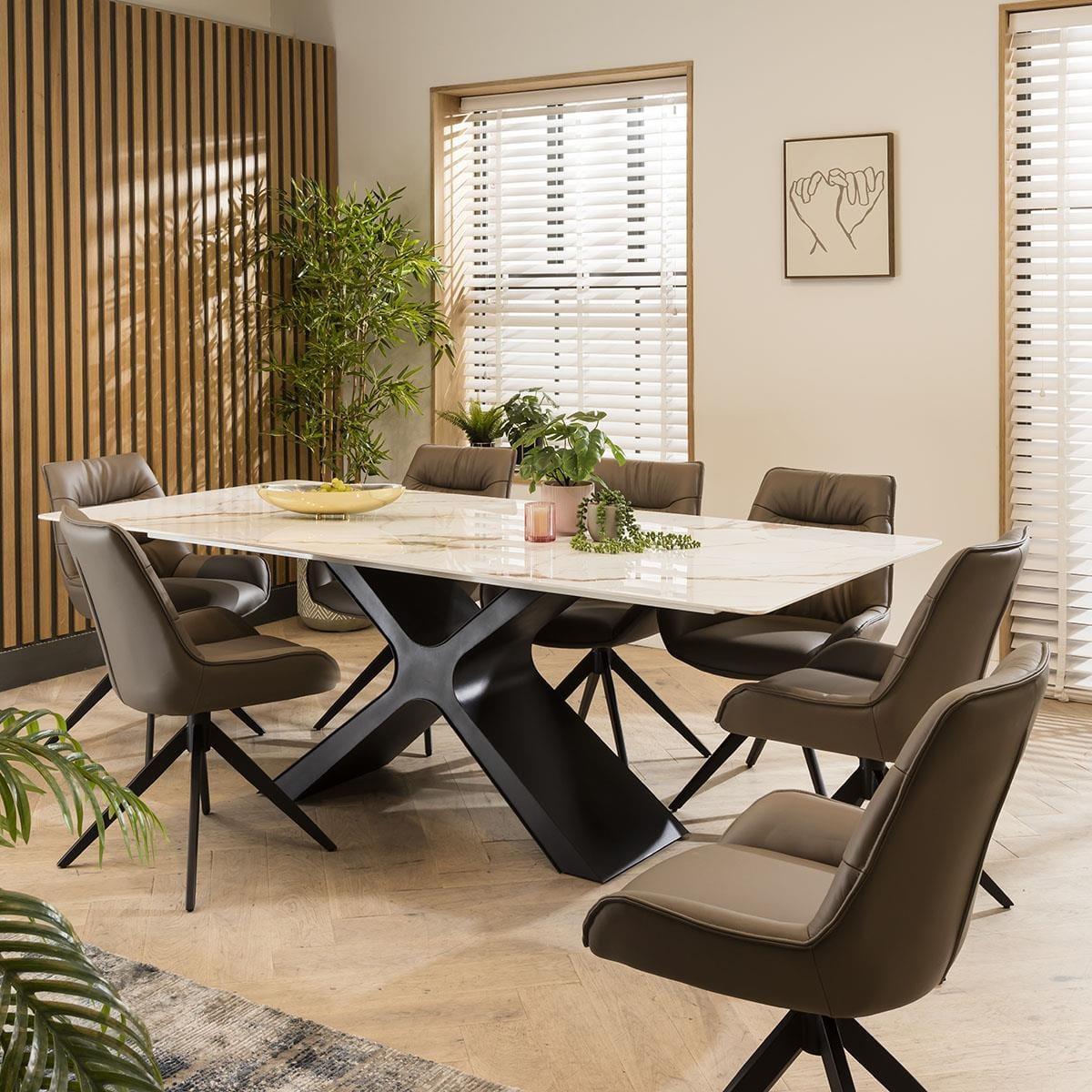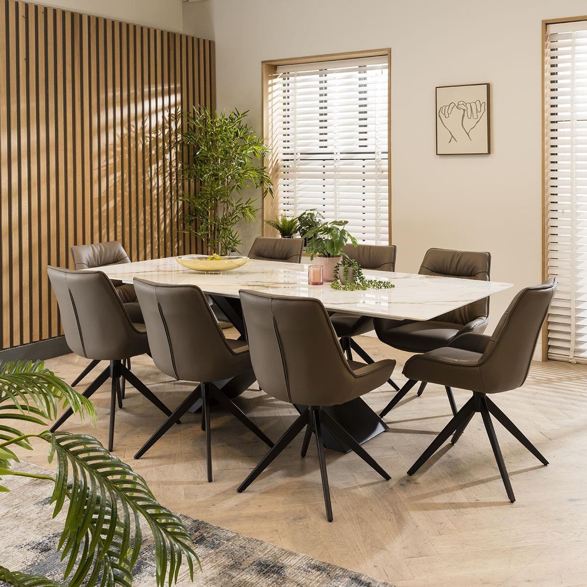 The Nora large contemporary 8 seater dining set combines modern aesthetics with premium functionality. Crafted with meticulous attention to detail, this 8 person set features a white ceramic dining table and elegant genuine grey leather dining room chairs, it's a perfect addition to any modern kitchen or dining room. Crafted with a premium ceramic table top featuring a white marble effect finish, the large ceramic dining table spans 220cm by 100cm, comfortably seating the 8 chairs in this set. The ceramic surface is a testament to its longevity, resistant to scratches, stains, and heat. The X-shaped metal base offers stability and a contemporary touch. Elegance with comfort is effortlessly blended with the Nora leather dining chairs in this set, crafted with genuine grey leather. These cushioned dining room chairs feature a sleek 4-point swivel base that ensures stability and ease of movement, making the chairs a perfect addition to any contemporary kitchen or dining space. This 8 seater dining set is the perfect blend of modern design, premium materials, and spacious seating, making it an excellent choice for those who appreciate both style and comfort. Transform your dining room into an elegant haven where you can create cherished memories with your loved ones, all centered around this exquisite dining set. Table Size W220cm D100cm H75cm Chair Size W58cm D64cm H85cm 8 Seater Dining Set